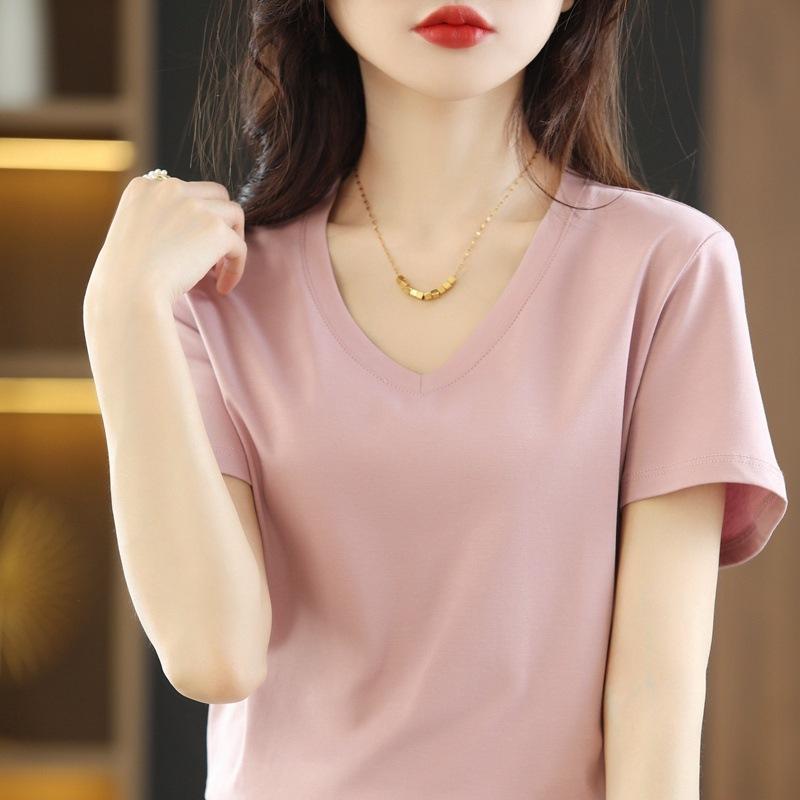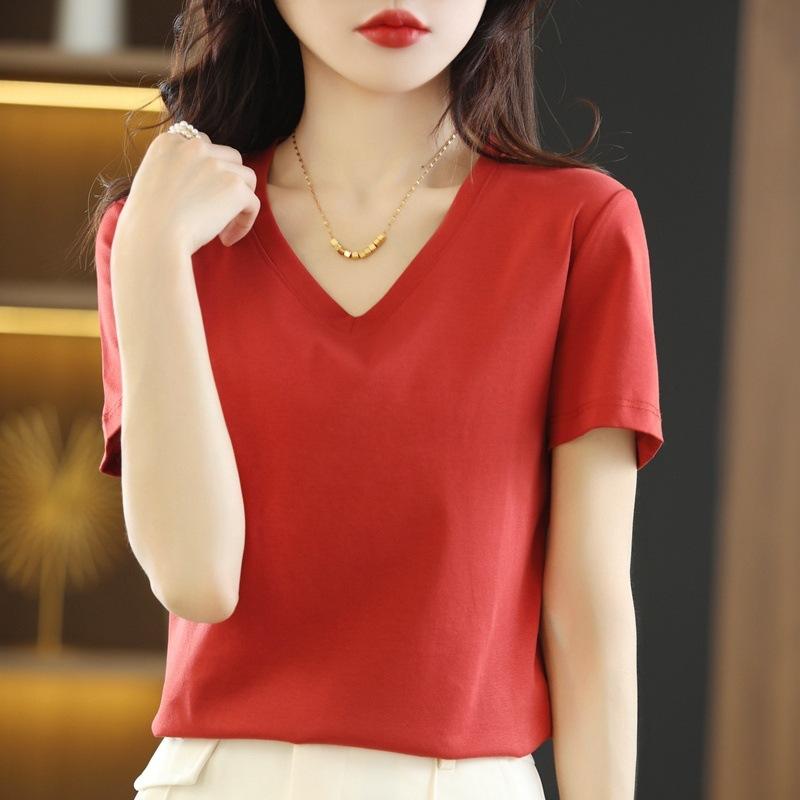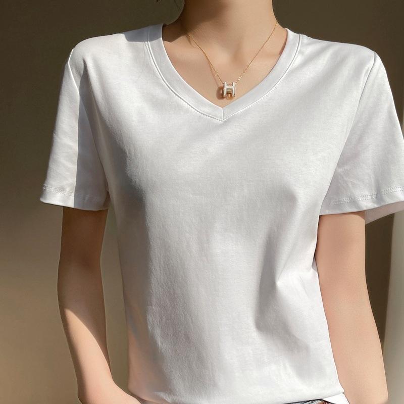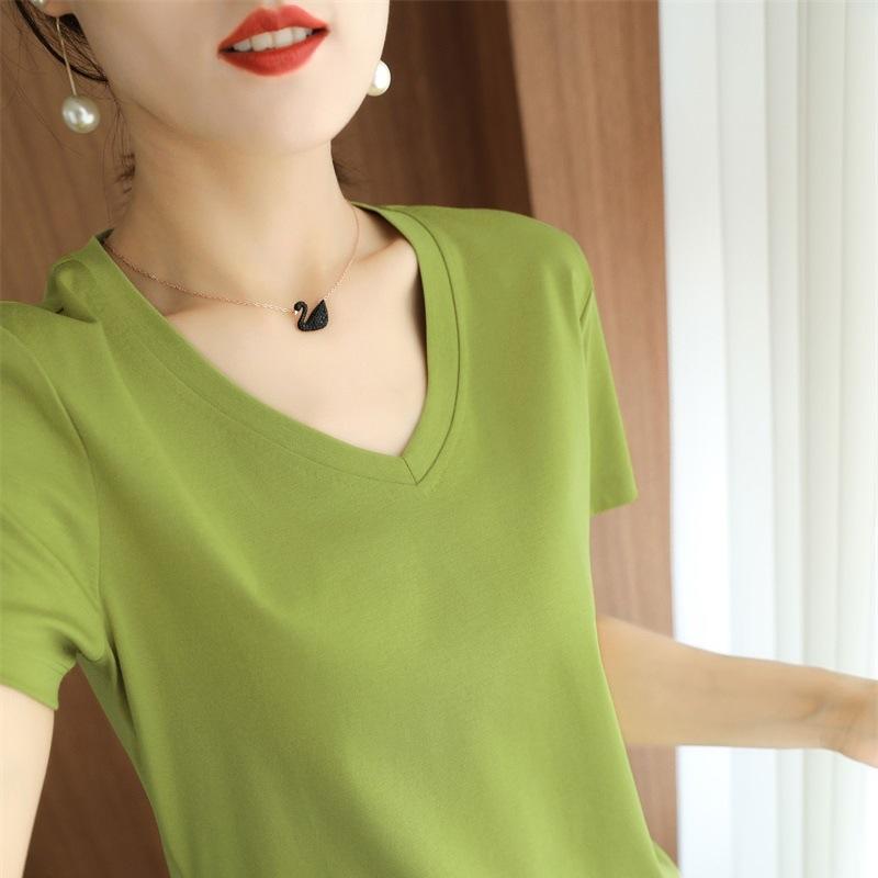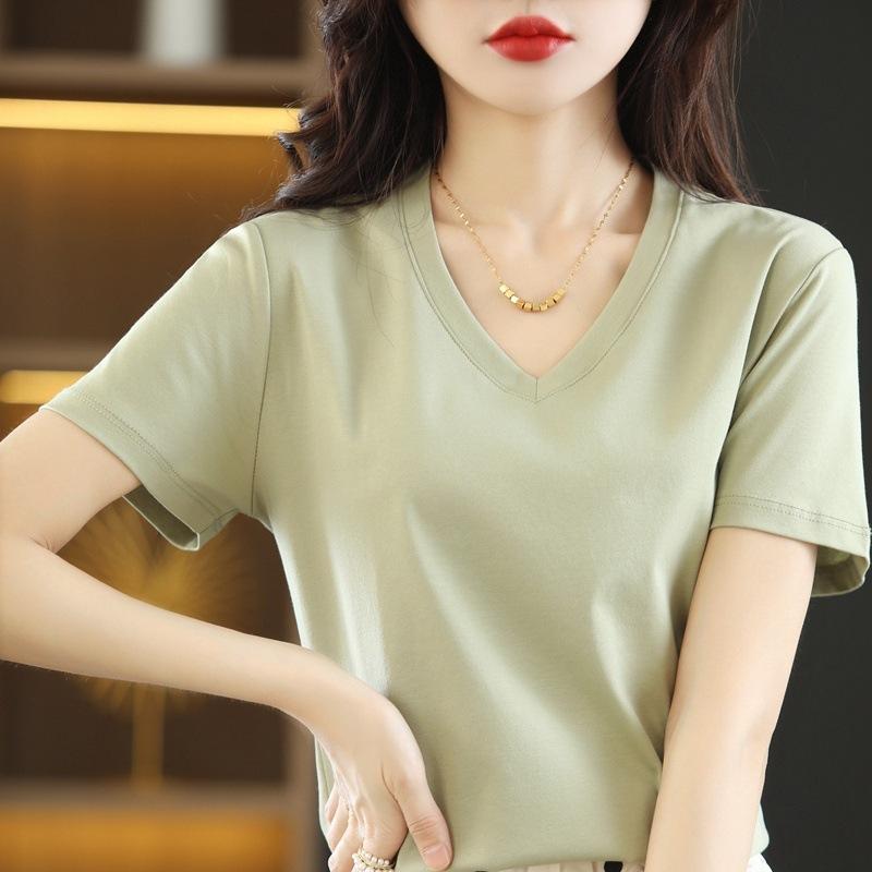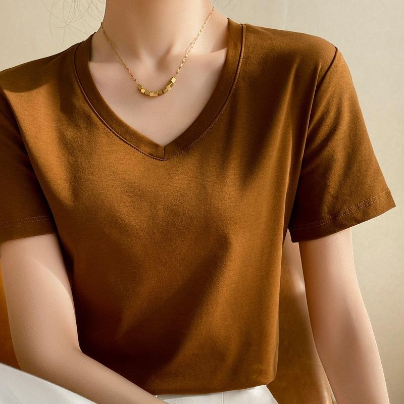 | Camiseta de verano de seda morera de doble cara de algodón mercerizado 80 para mujer, camiseta de corte entallado con cuello en V, hombros rectos, manga corta, estilo sencillo. |
