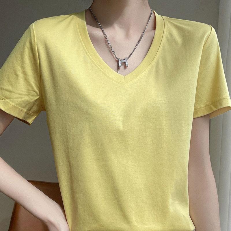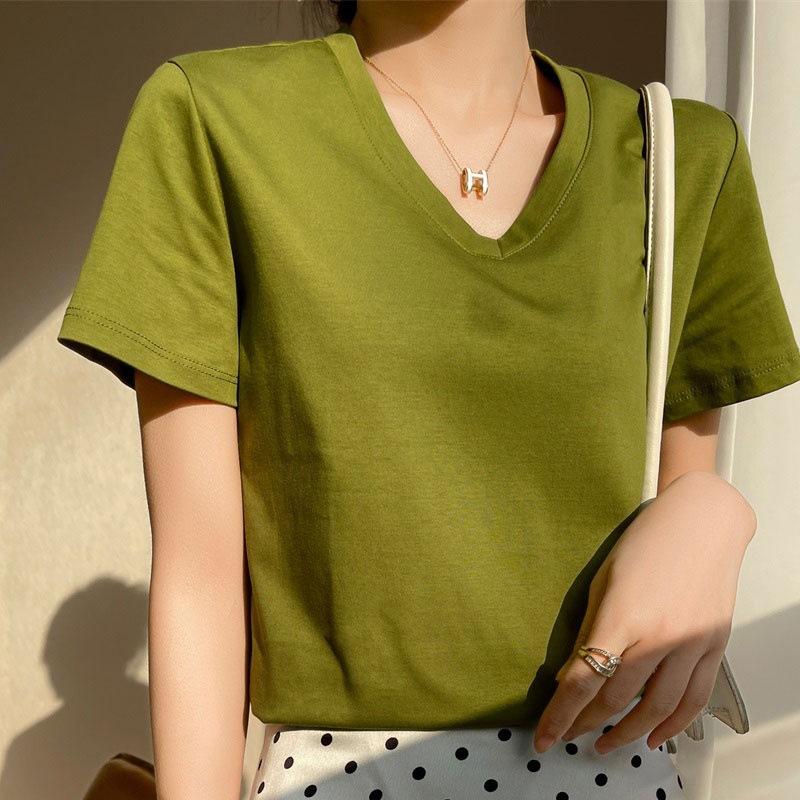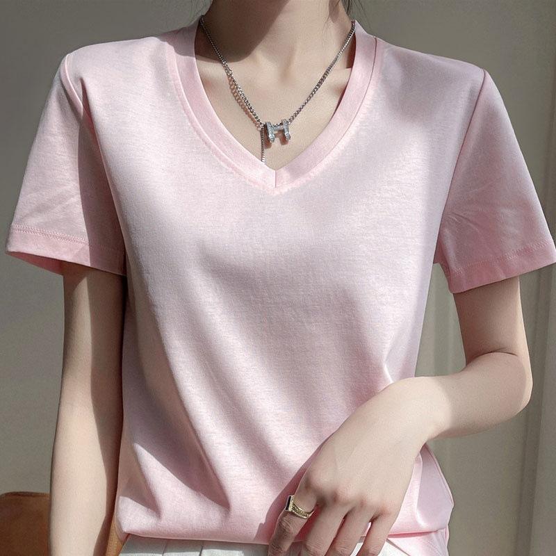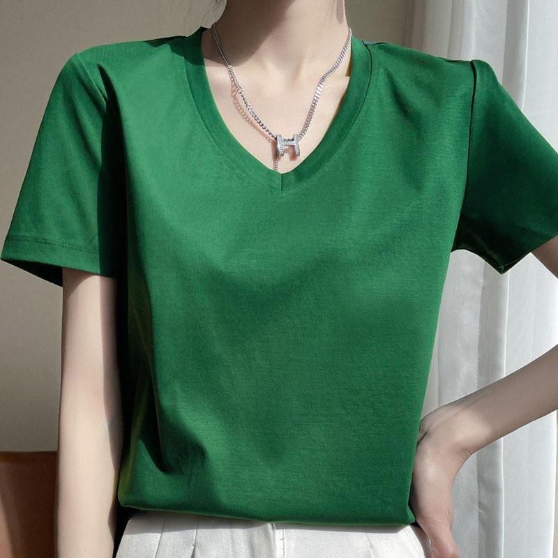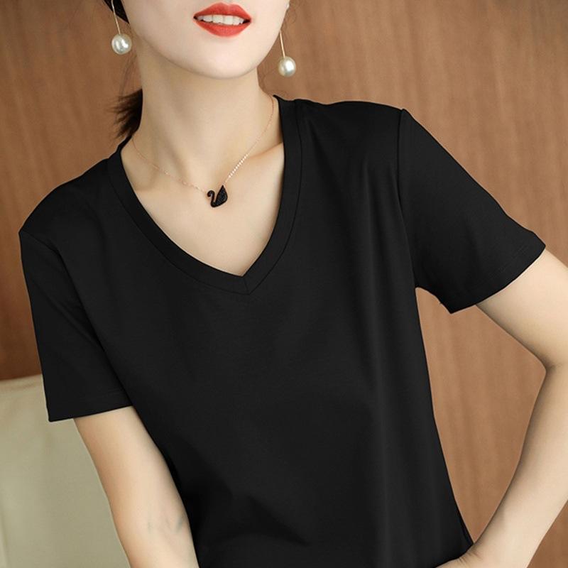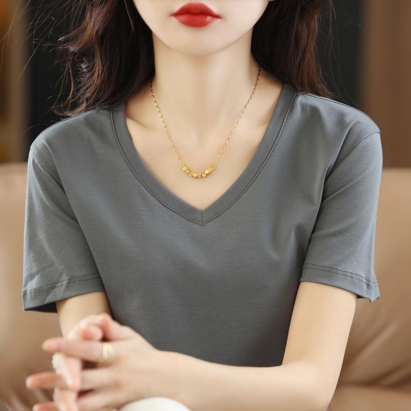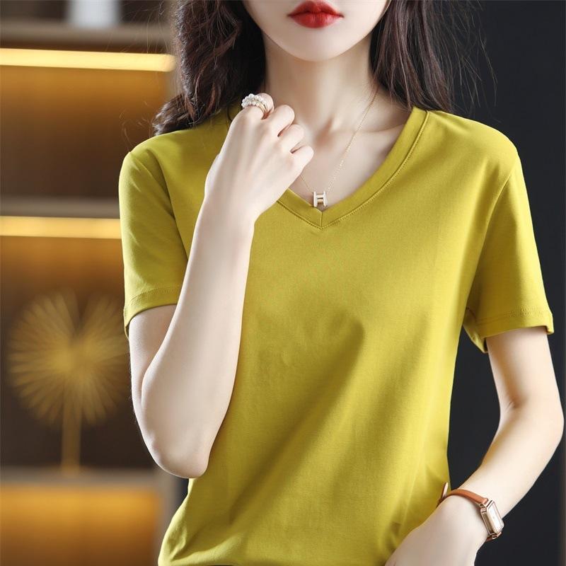 | Camiseta de verano de seda morera de doble cara de algodón mercerizado 80 para mujer, camiseta de corte entallado con cuello en V, hombros rectos, manga corta, estilo sencillo. |