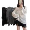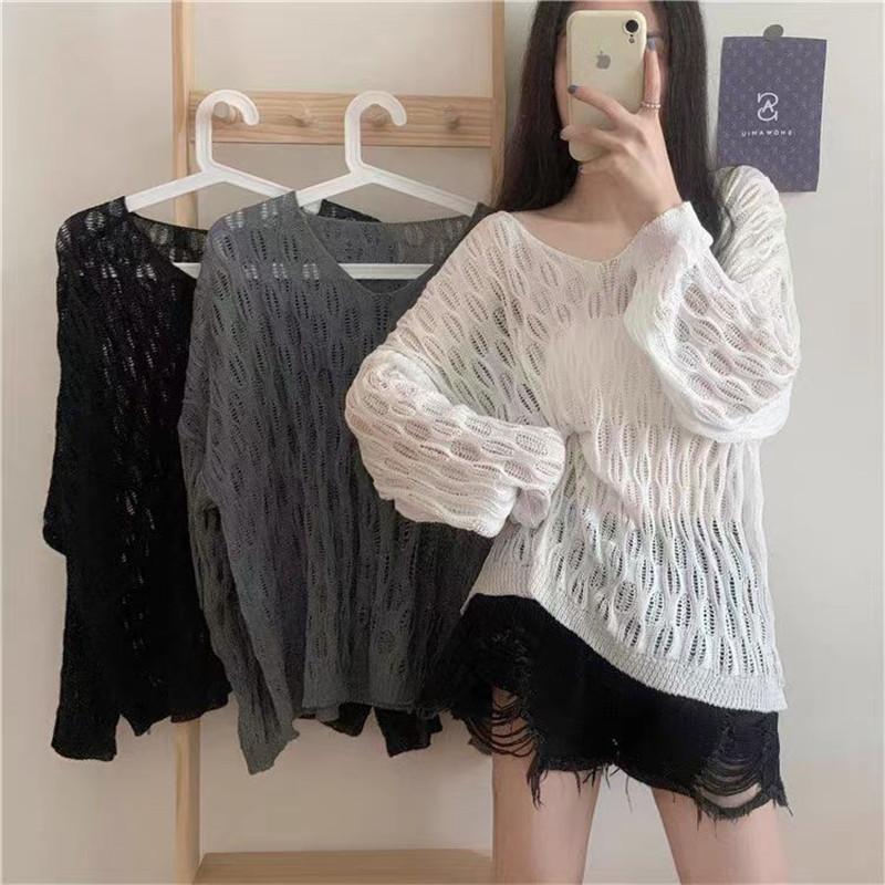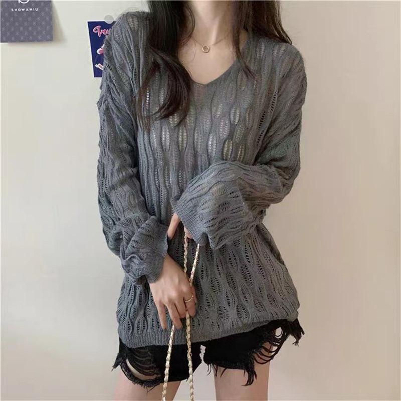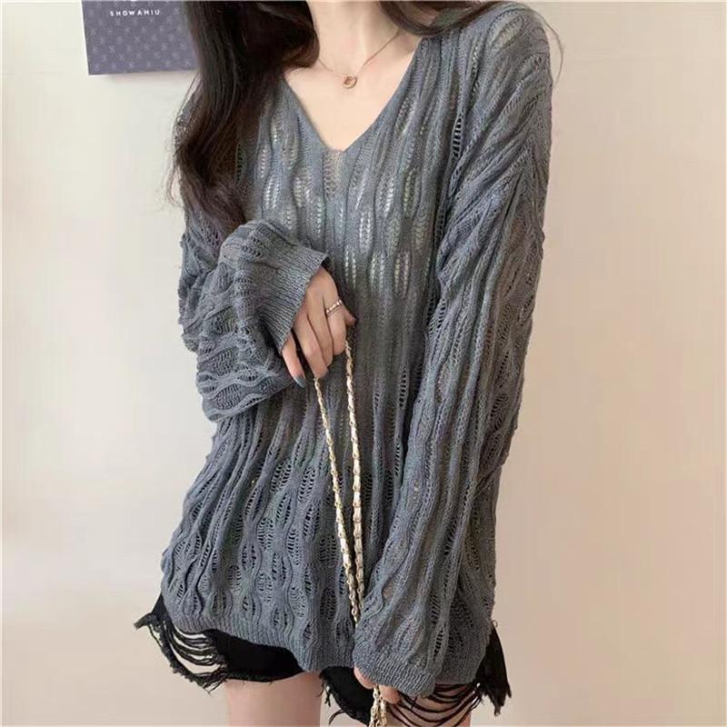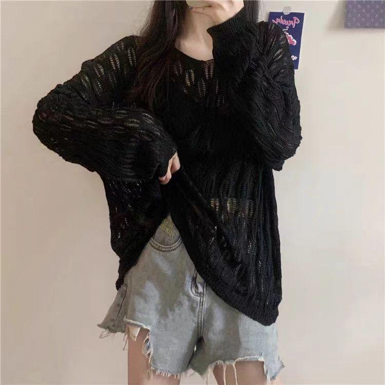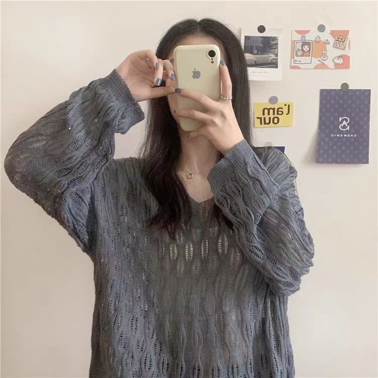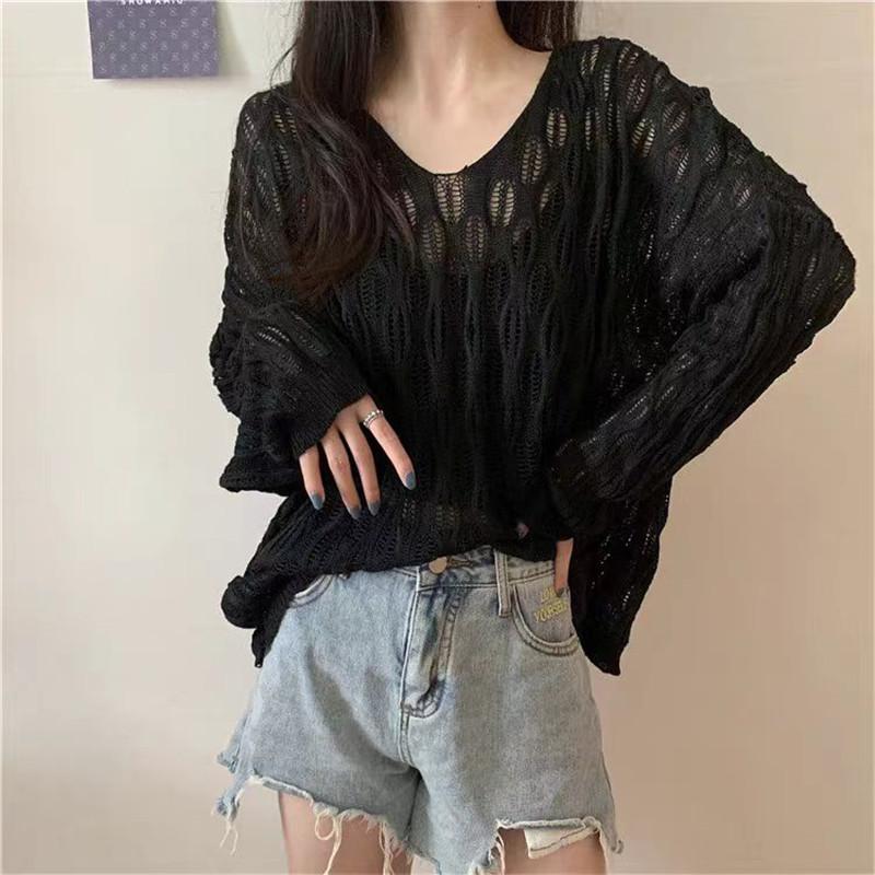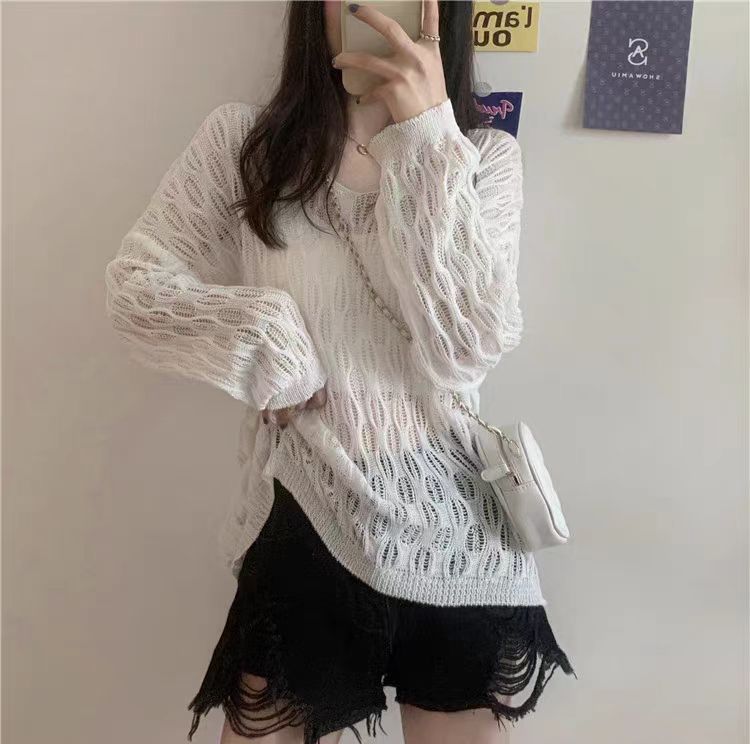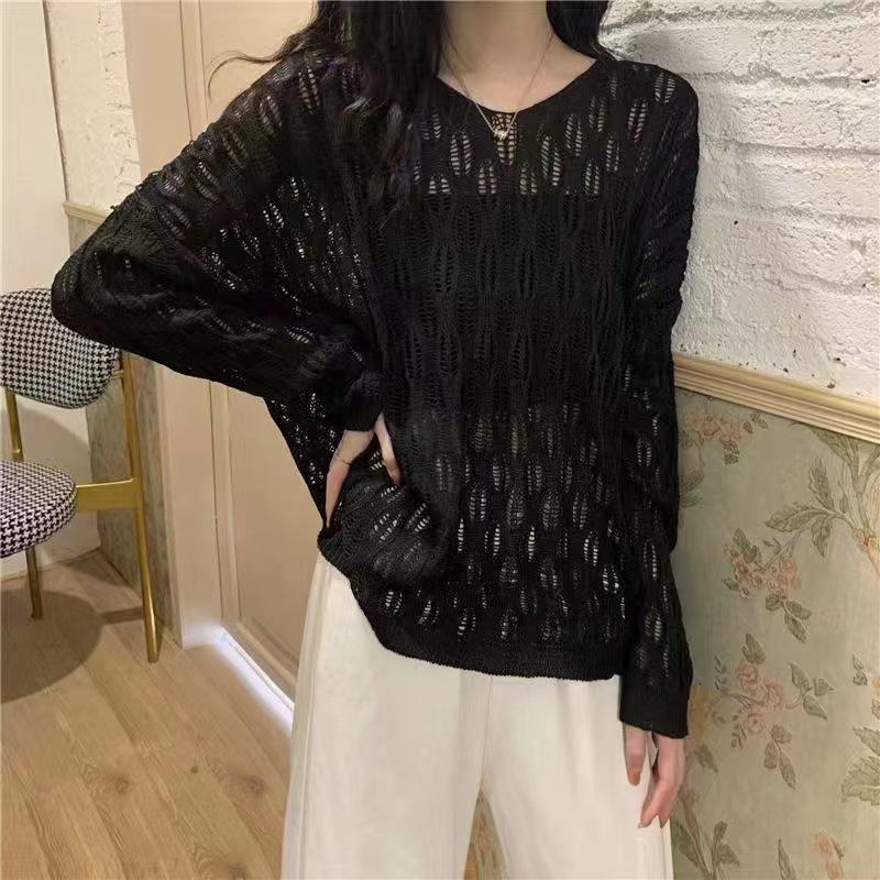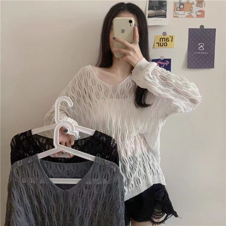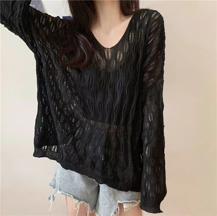 Camisa hueca con protector solar y aire acondicionado para mujer, nueva blusa de verano de color liso, estilo holgado, de manga larga y cuello en V, combinable con todo.