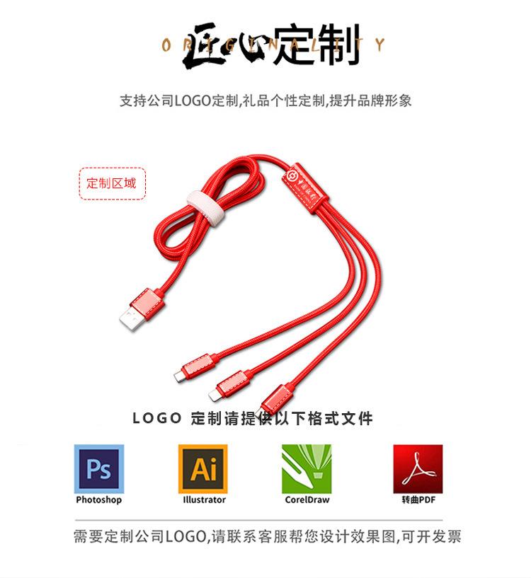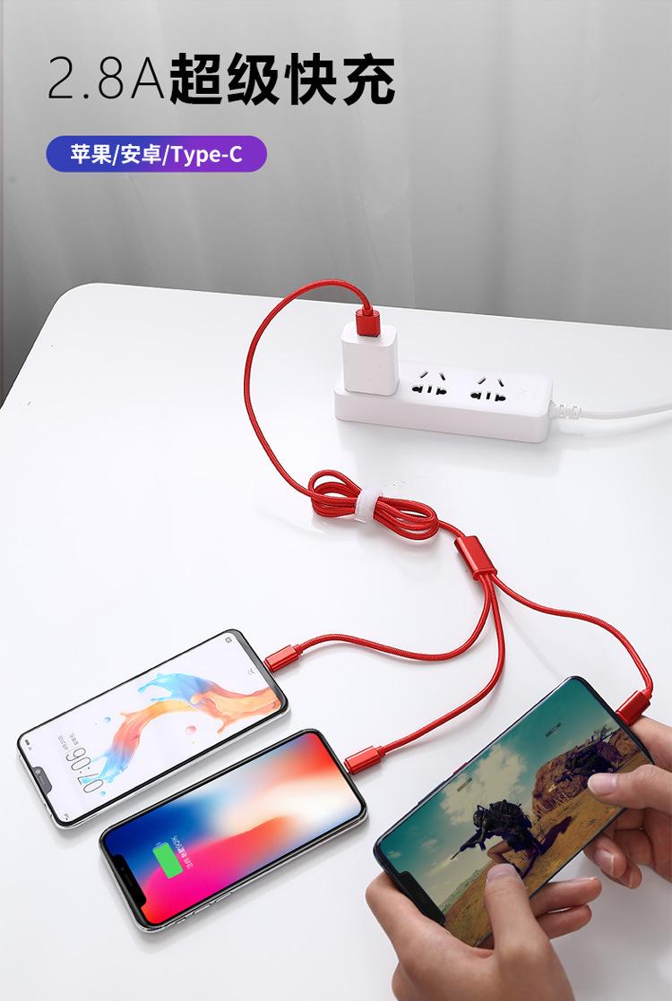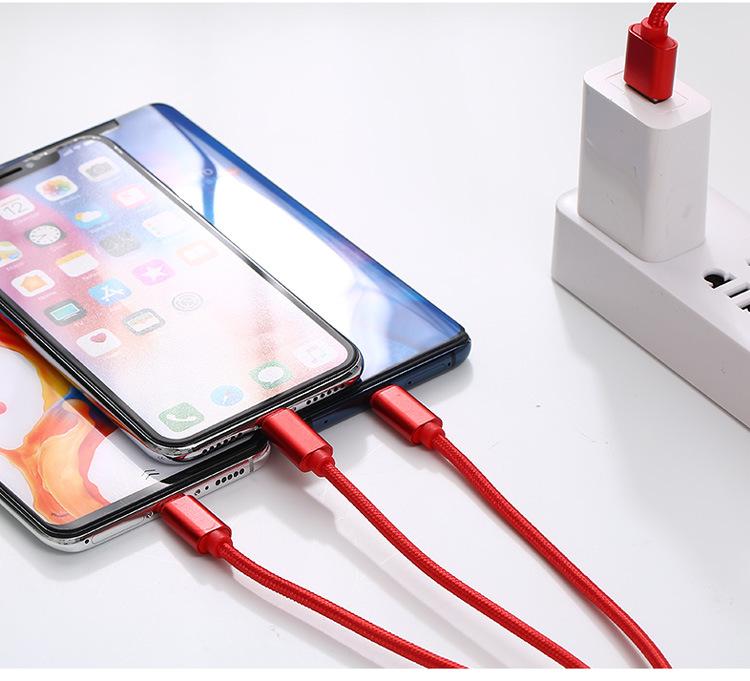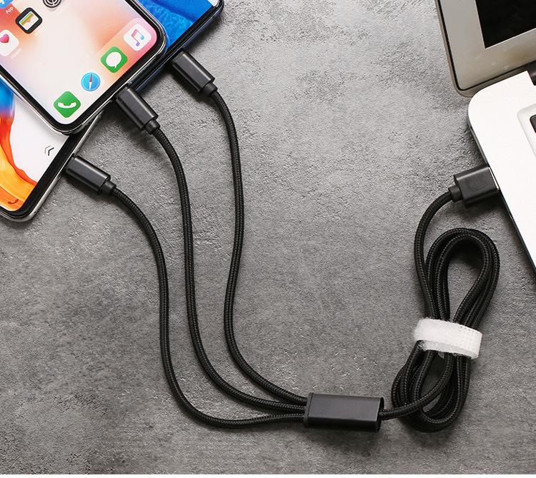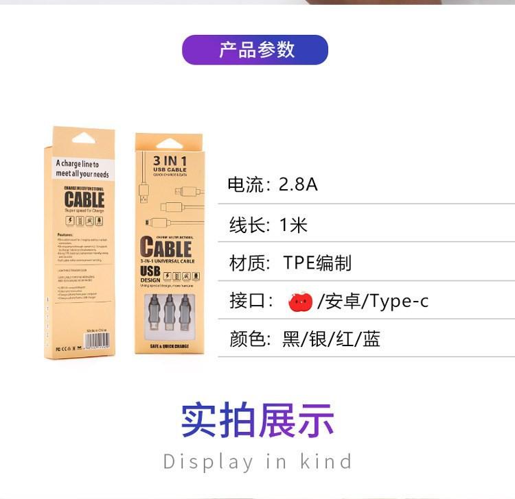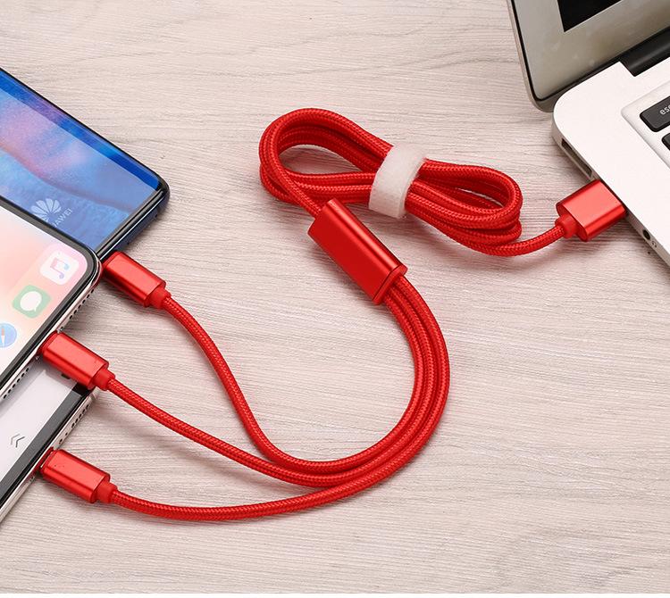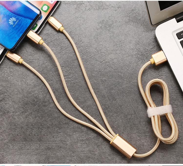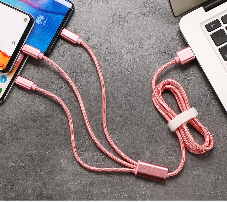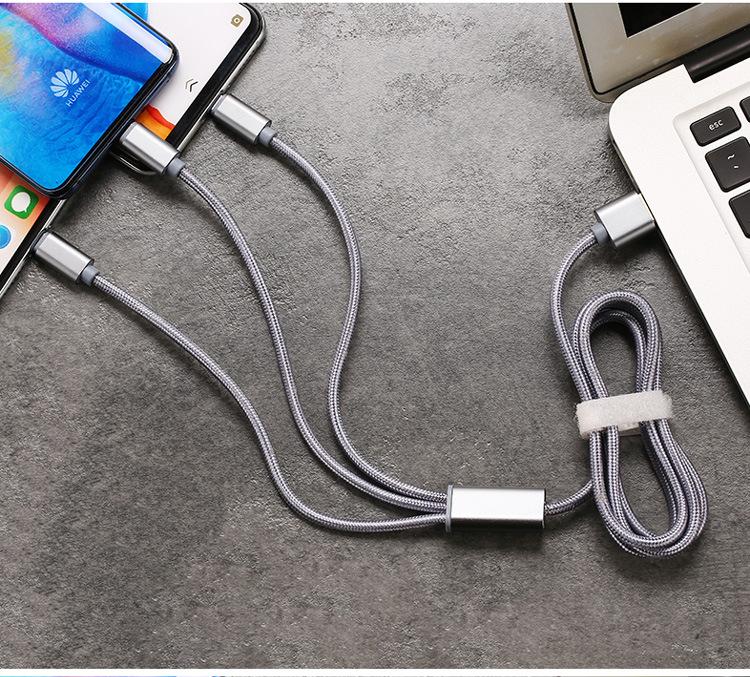 Cable de datos trenzado uno arrastre tres nailon tres en uno cable de carga rápida para teléfono móvil láser pequeño regalo impresión de logotipo