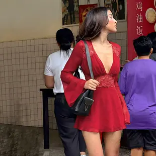 Estilo ins europeo y americano francés puro y sexy profundo V encaje empalmado cintura ceñida malla manga acampanada temperamento vestido corto