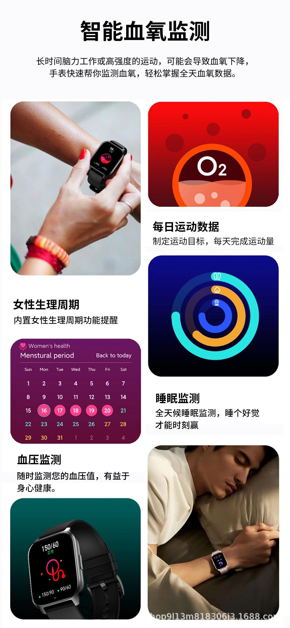 5- Realizar y recibir llamadas, música Bluetooth, rescate SOS con un solo clic, ciclo menstrual femenino, clima, frecuencia cardíaca en tiempo real, monitoreo de oxígeno en sangre y temperatura corporal, etc.