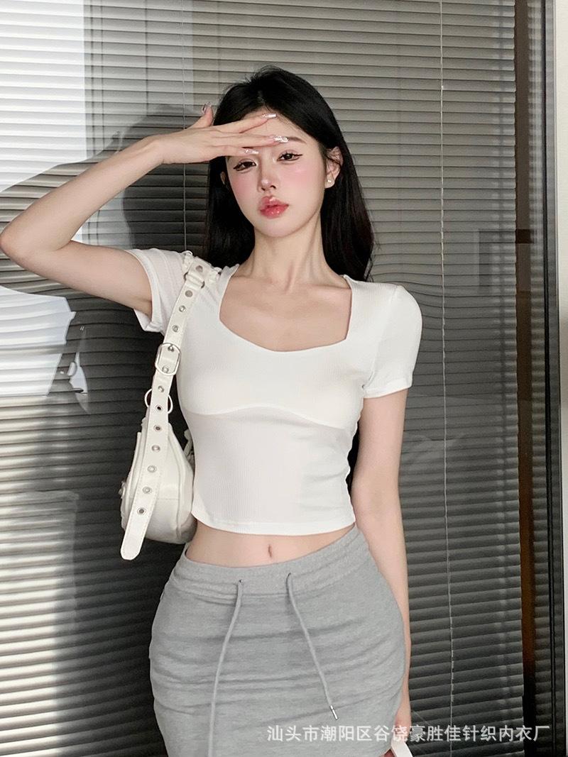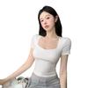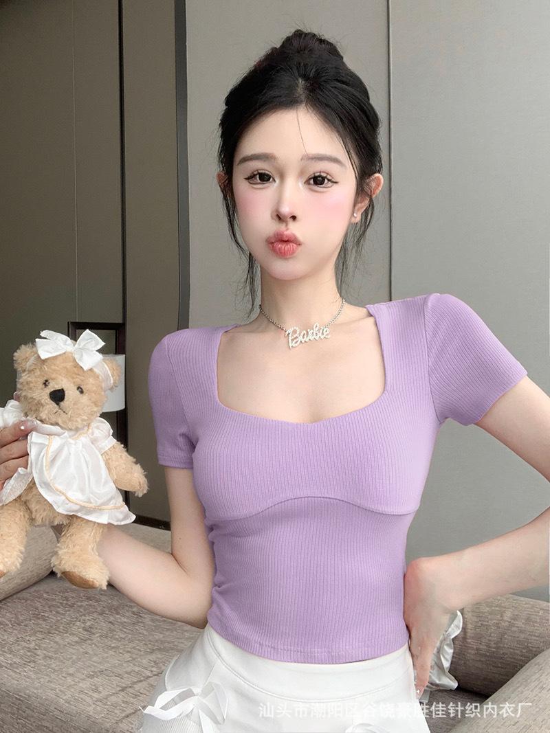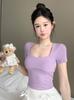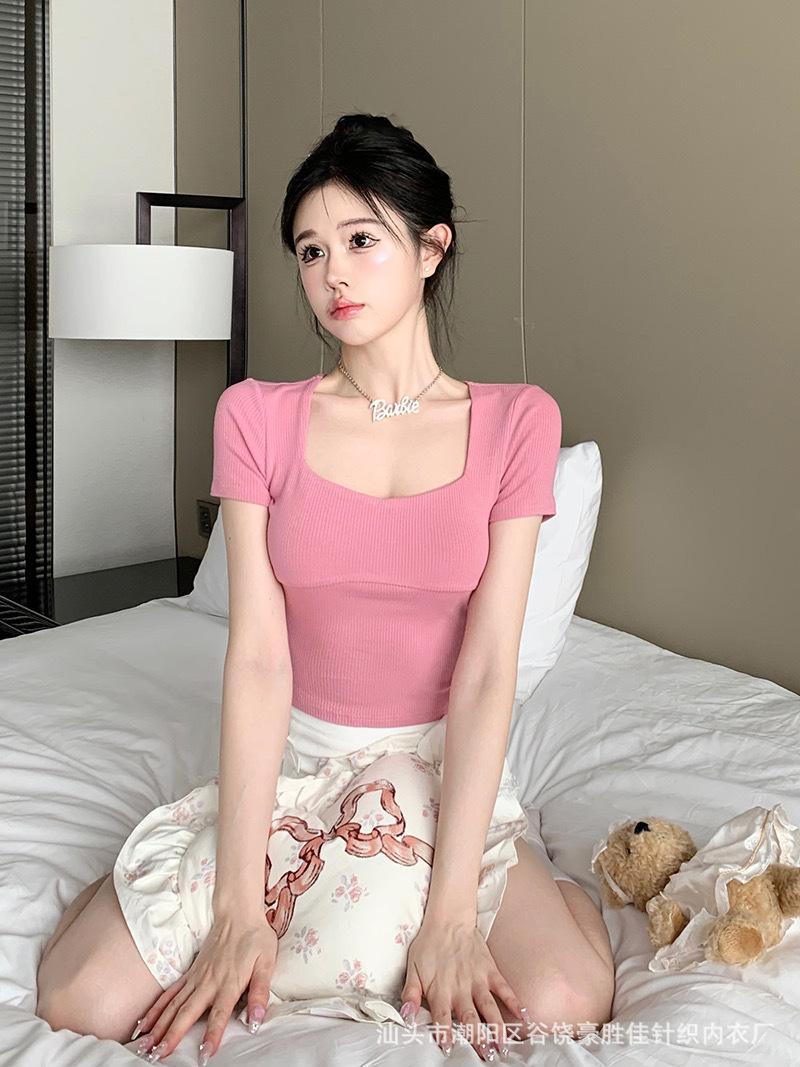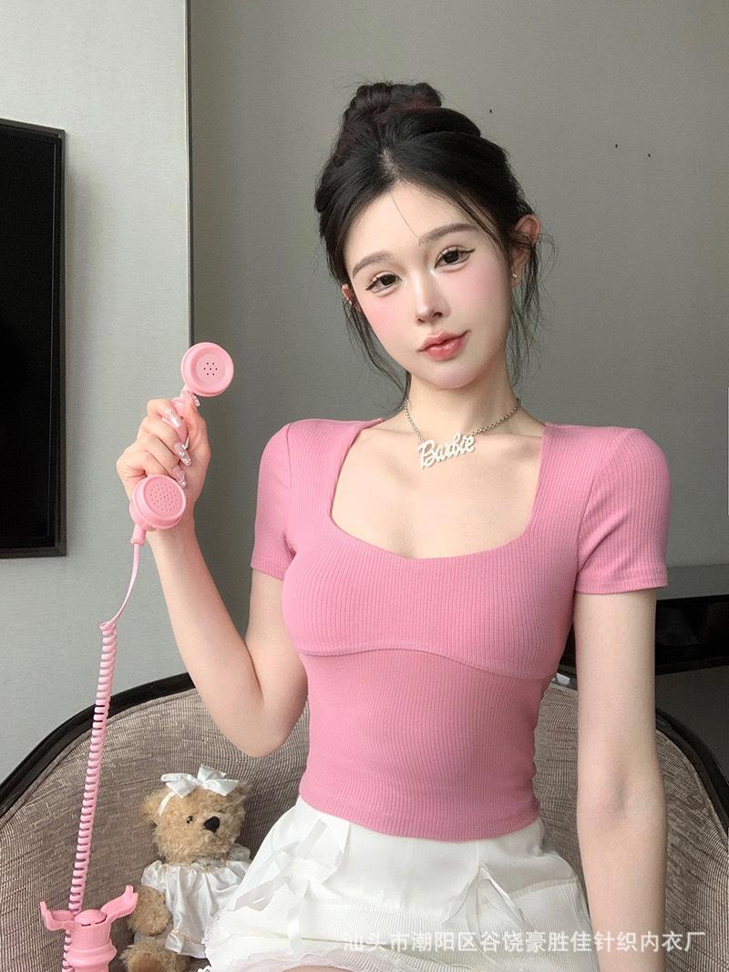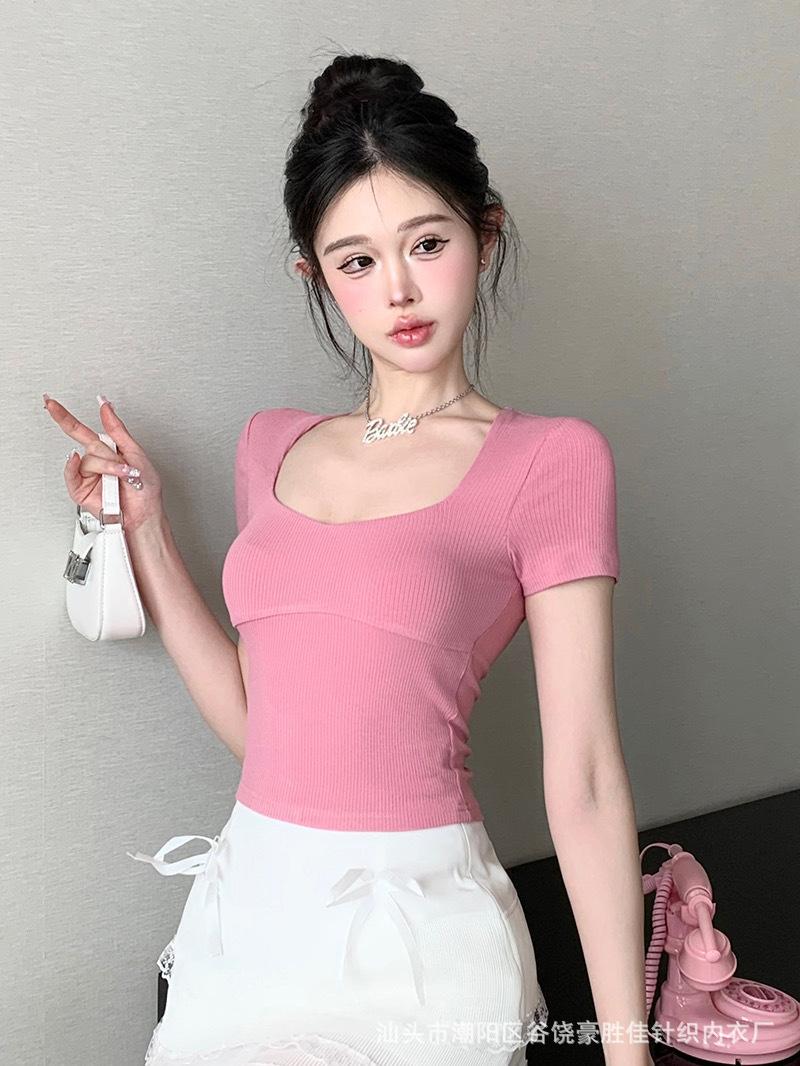 Compra Camiseta de manga corta con cuello cuadrado rosa de alta gama para mujer, de corte entallado, de color liso, sexy y corta, de verano al por mayor en Joom.pro