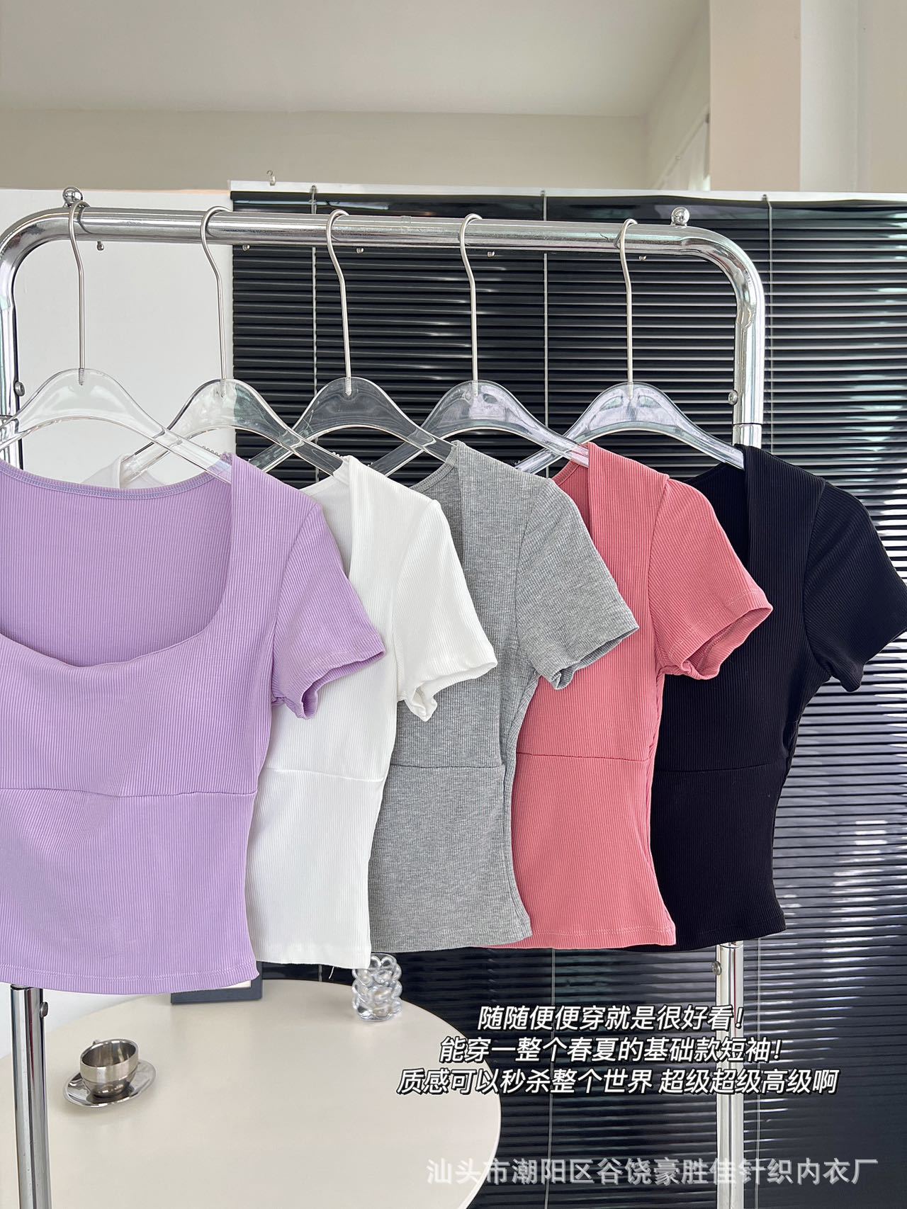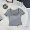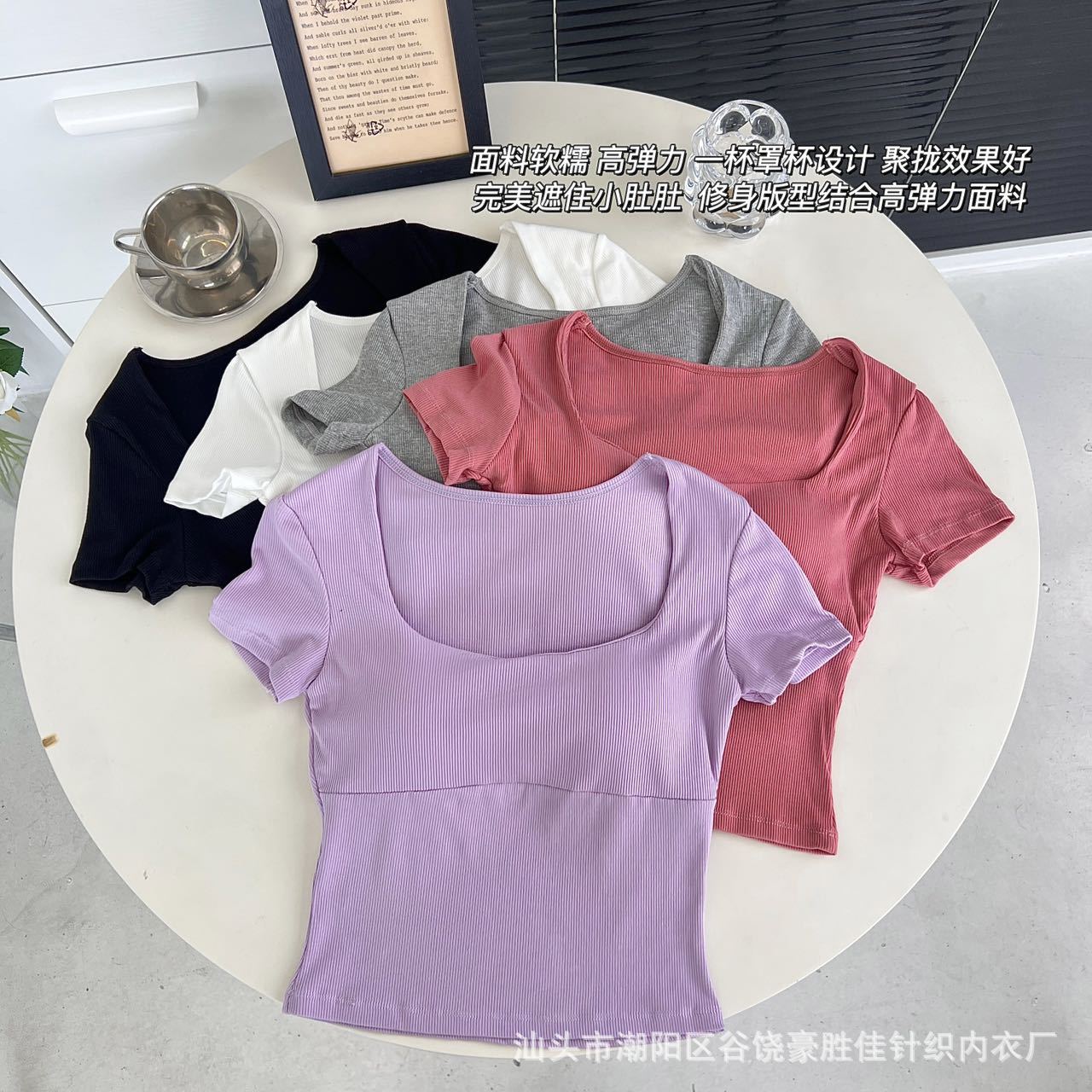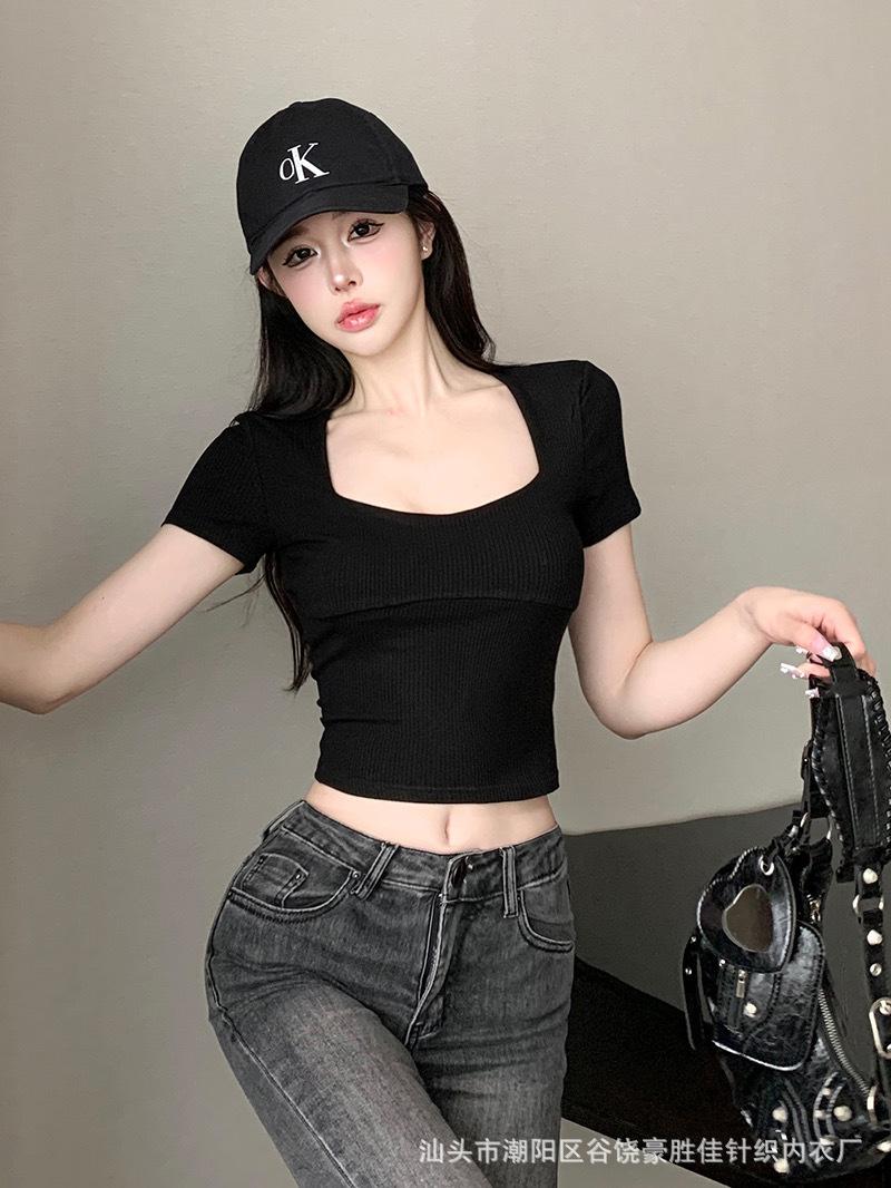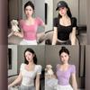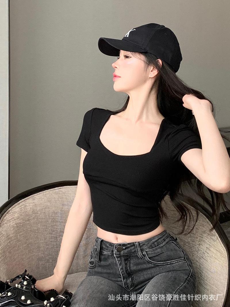 Compra Camiseta de manga corta con cuello cuadrado rosa de alta gama para mujer, de corte entallado, de color liso, sexy y corta, de verano al por mayor en Joom.pro