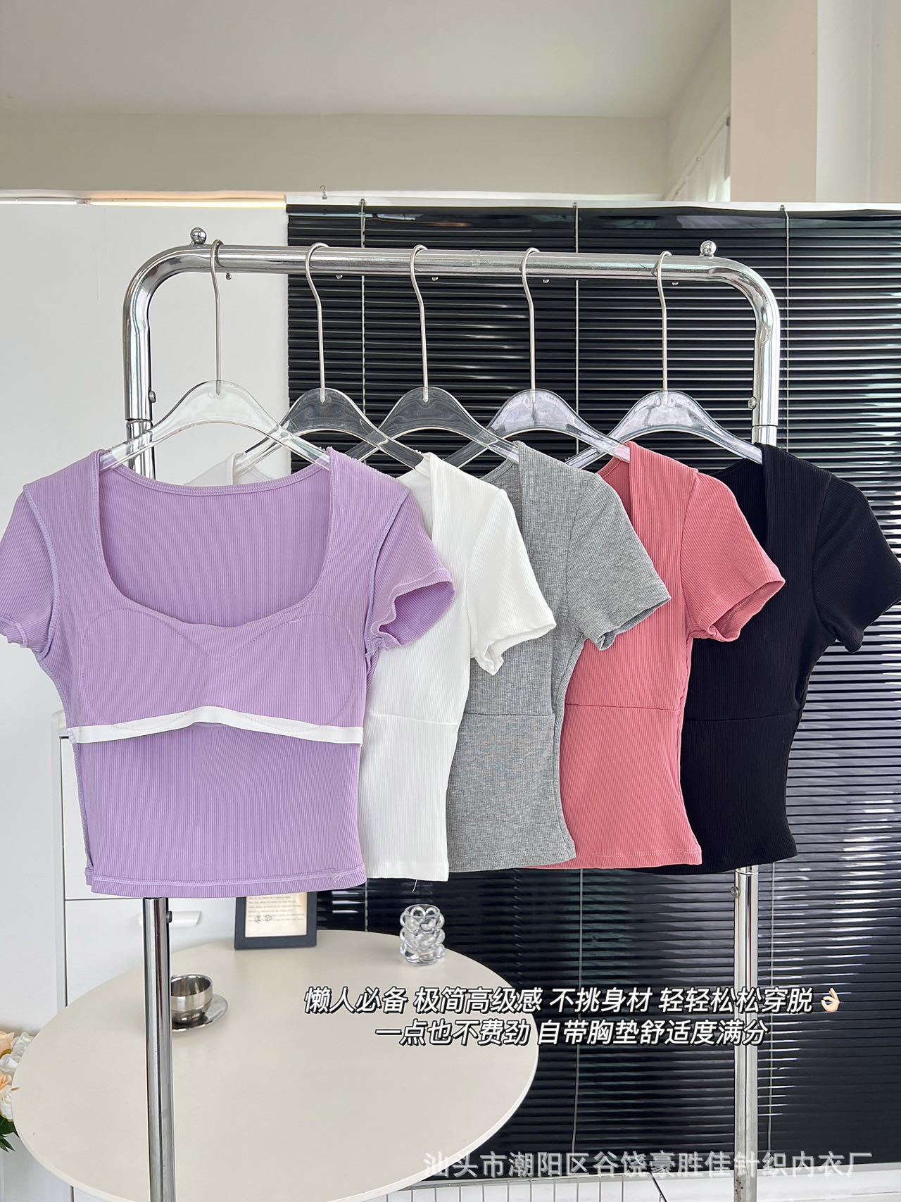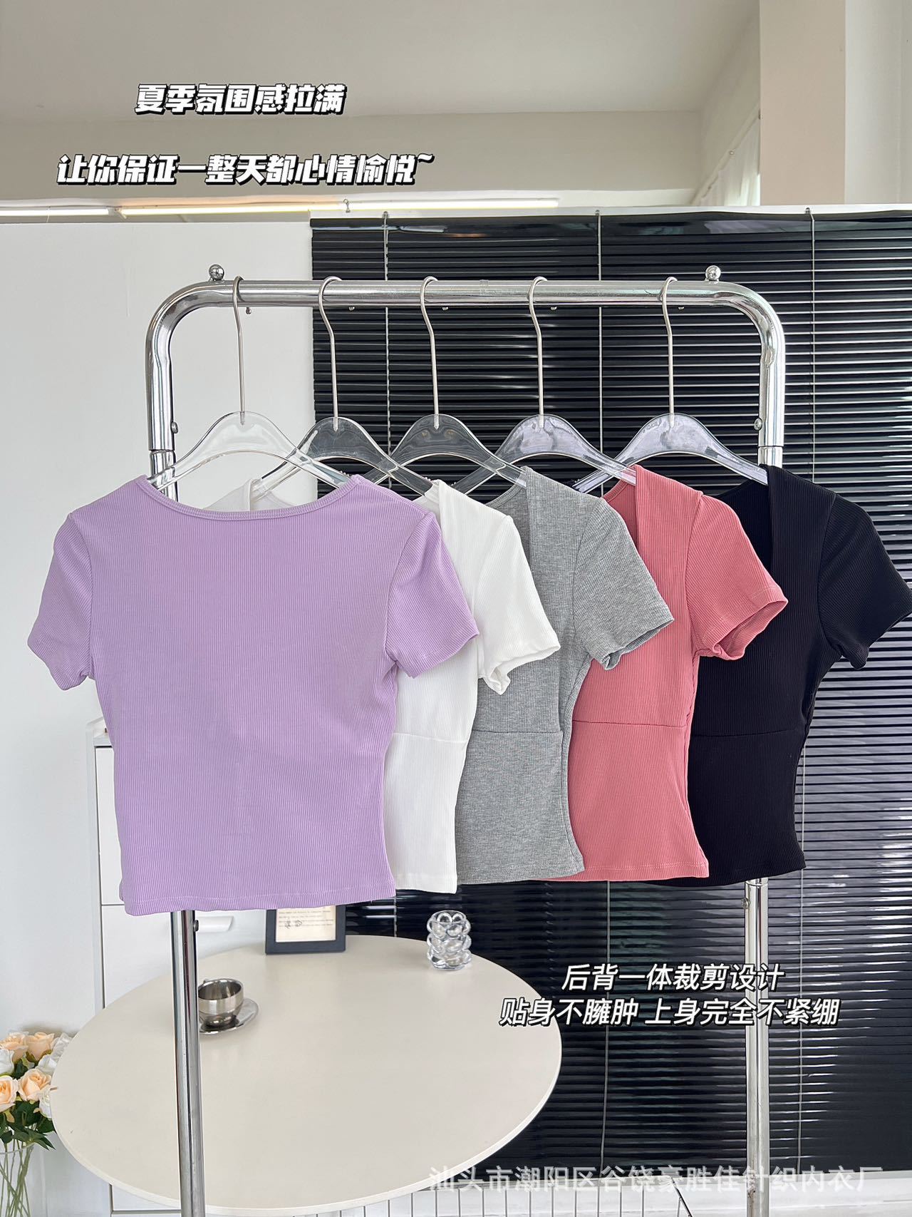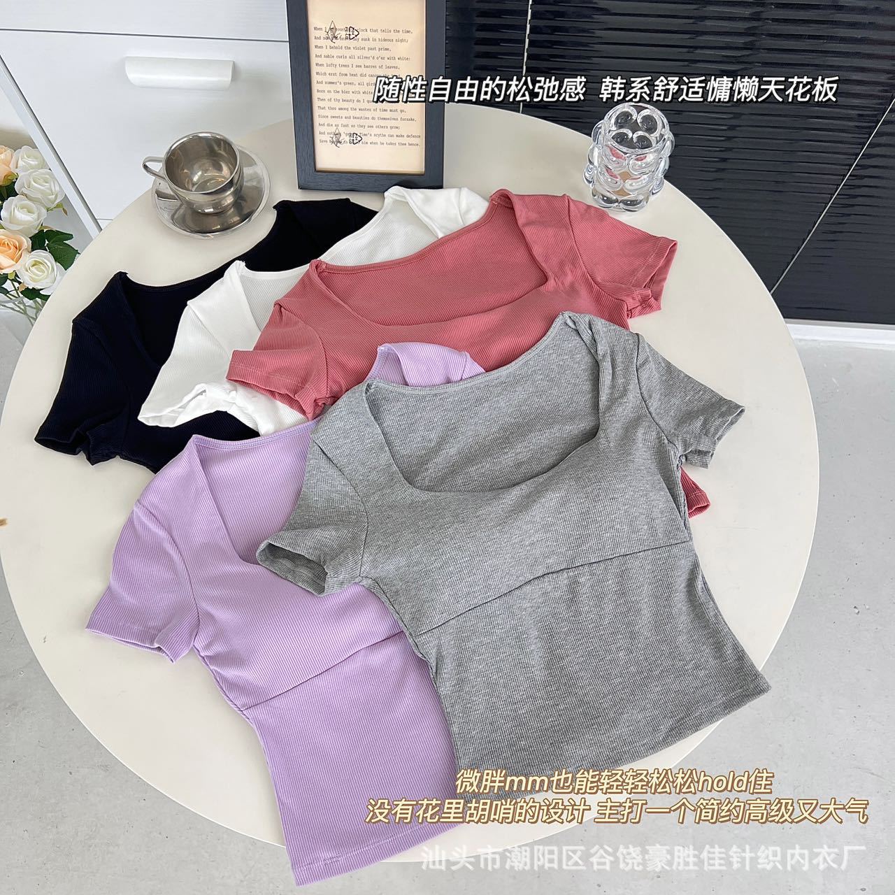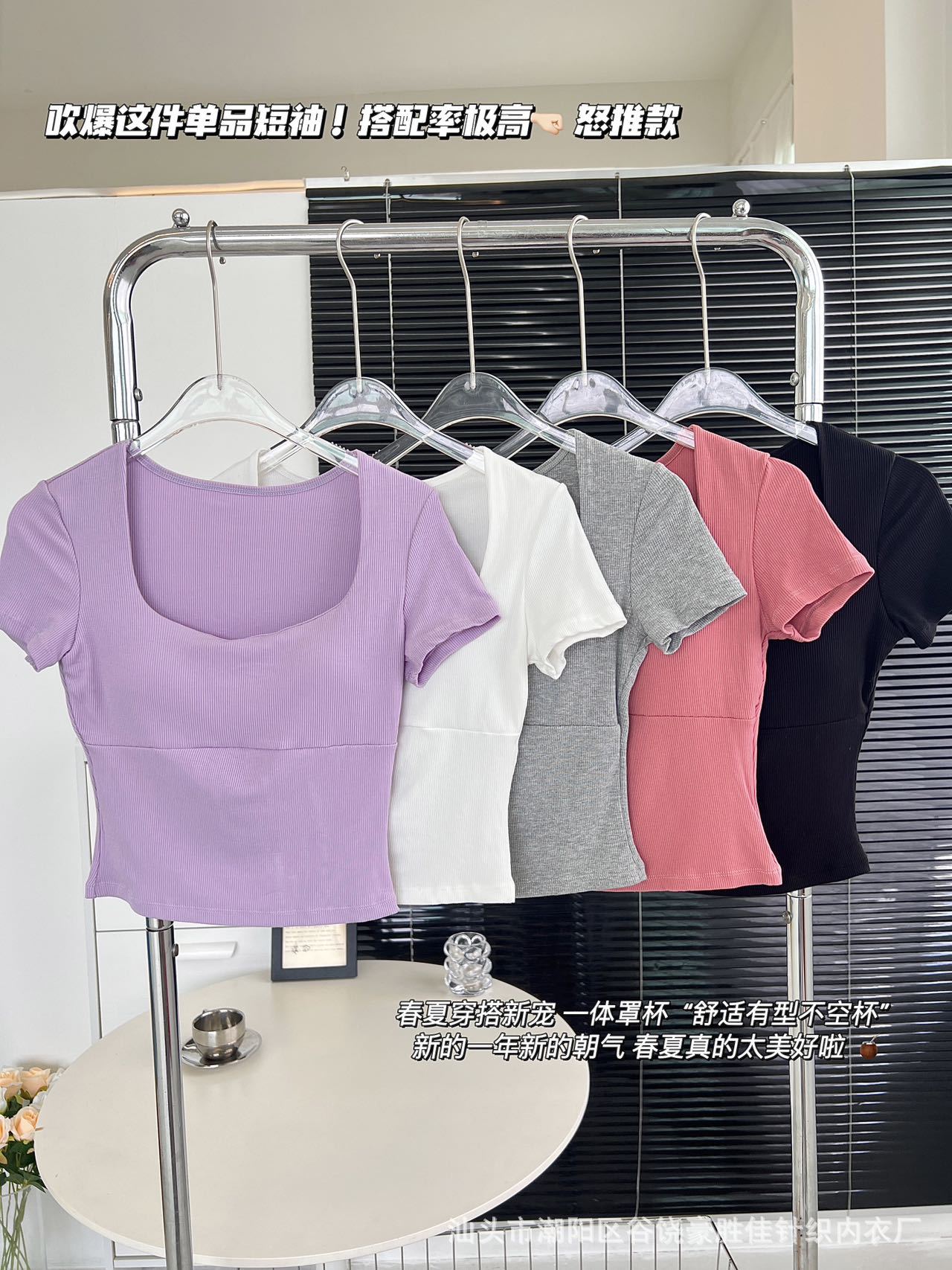 Compra Camiseta de manga corta con cuello cuadrado rosa de alta gama para mujer, de corte entallado, de color liso, sexy y corta, de verano al por mayor en Joom.pro