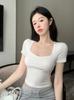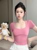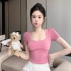 Camiseta de manga corta con cuello cuadrado rosa de alta gama para mujer, de corte entallado, de color liso, sexy y corta, de verano