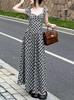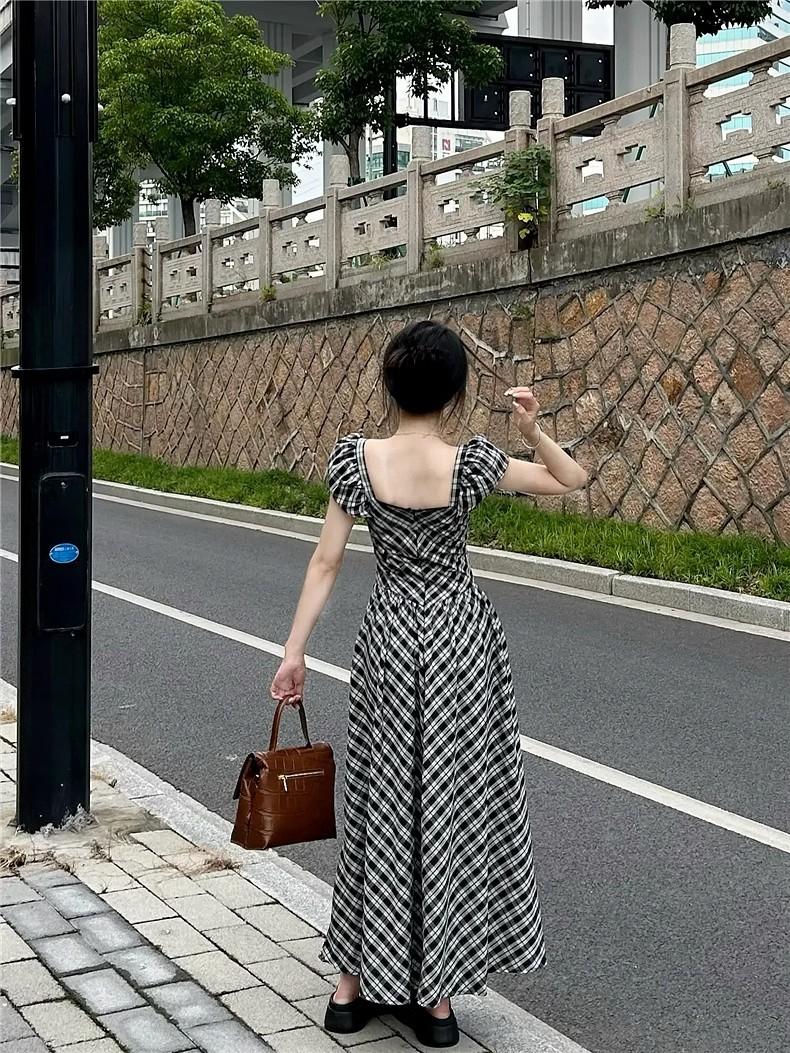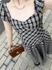 Vestido a cuadros con cuello cuadrado retro francés para mujer, nuevo vestido largo ajustado elegante de alta moda de verano