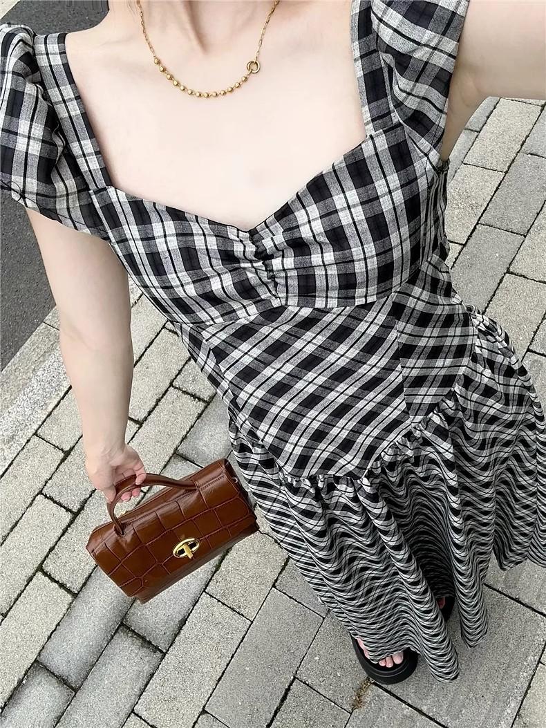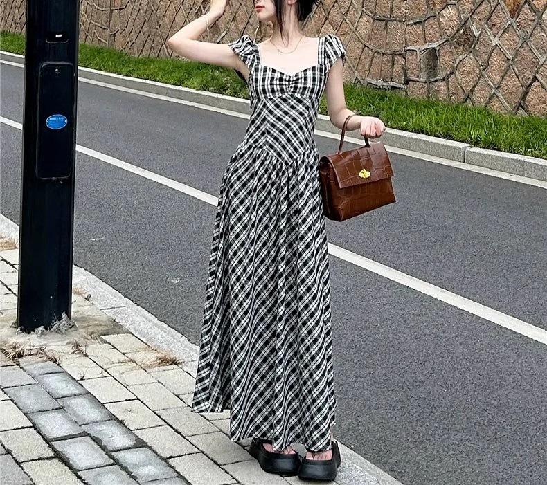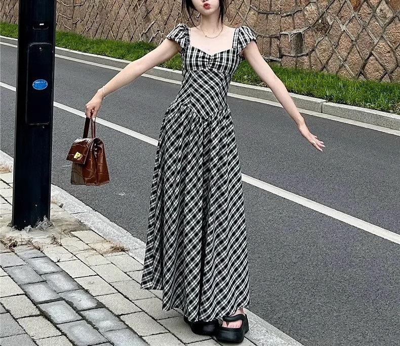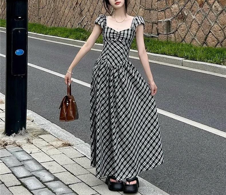 Compra Vestido a cuadros con cuello cuadrado retro francés para mujer, nuevo vestido largo ajustado elegante de alta moda de verano al por mayor en Joom.pro