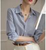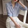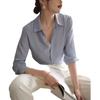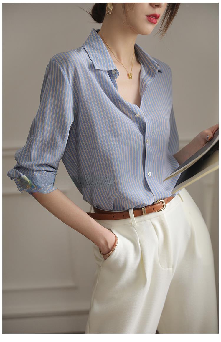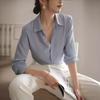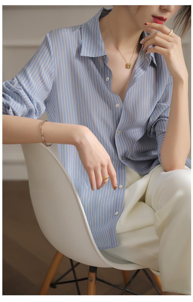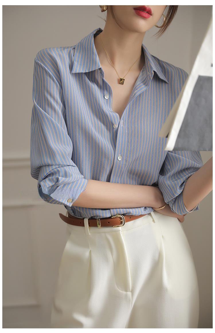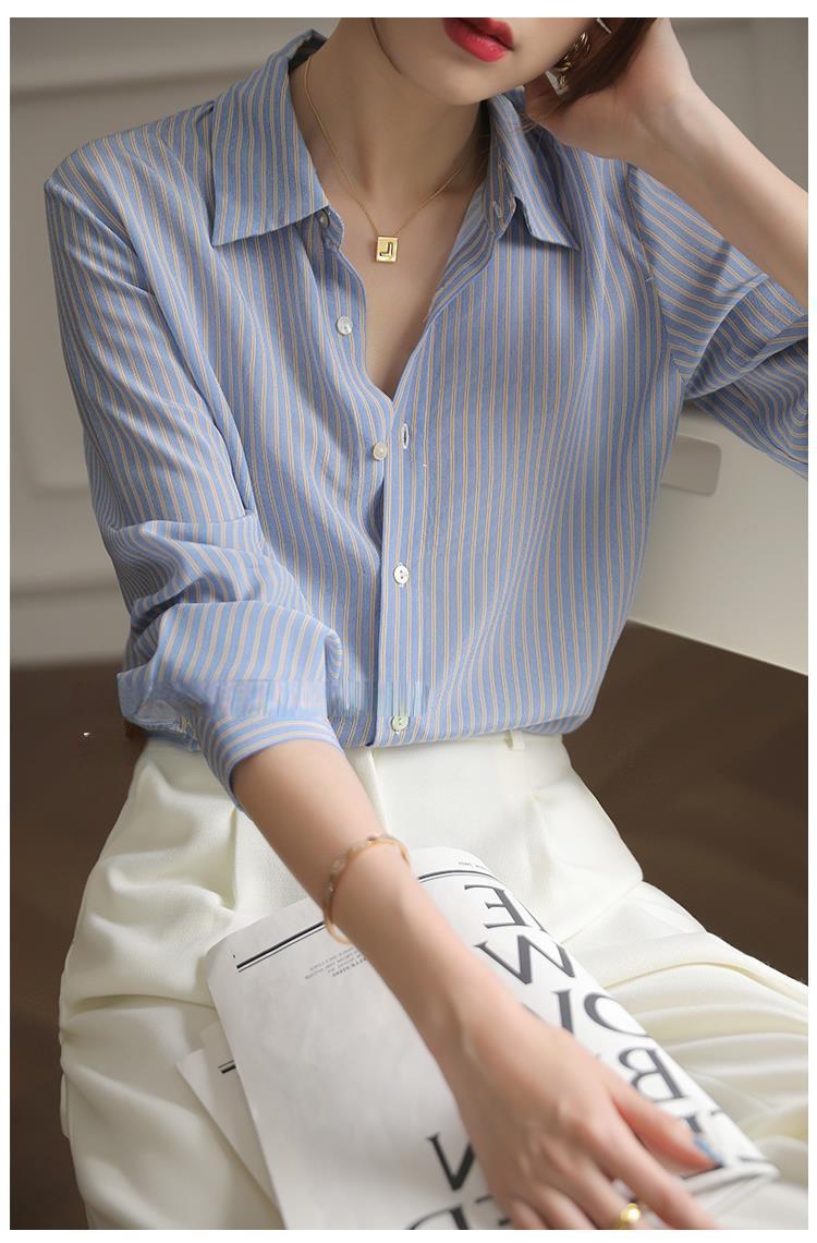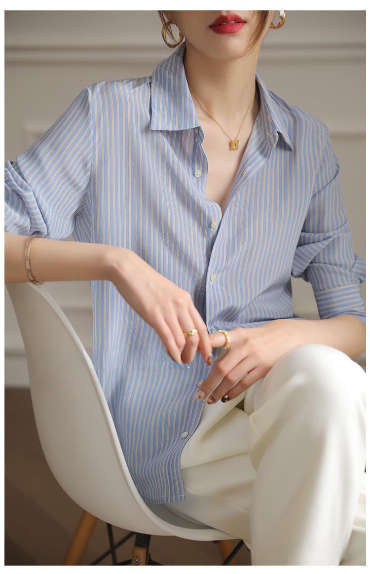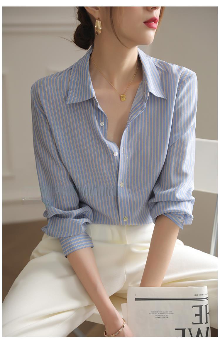 Camisa retro de rayas azules estilo Hong Kong para mujer primavera y verano Nueva camisa de manga larga con temperamento commuter de nicho con sentido del diseño suelto