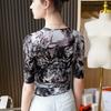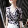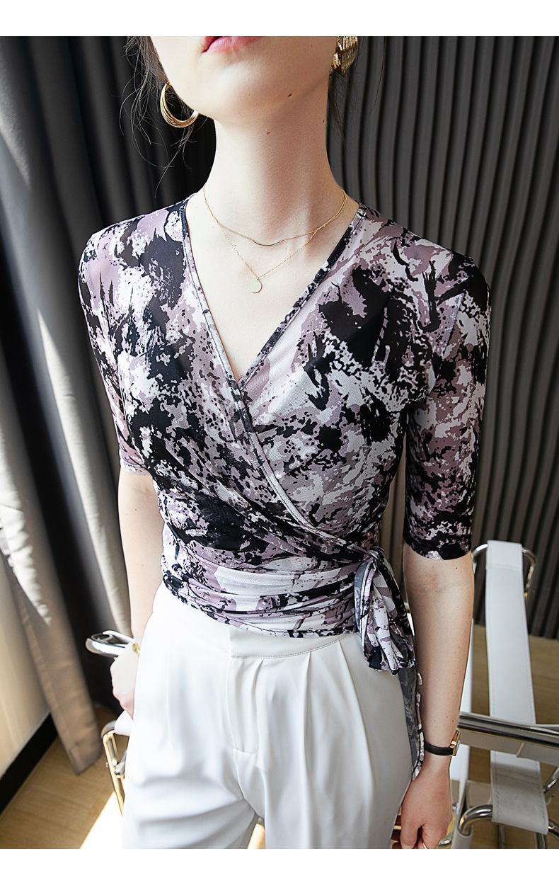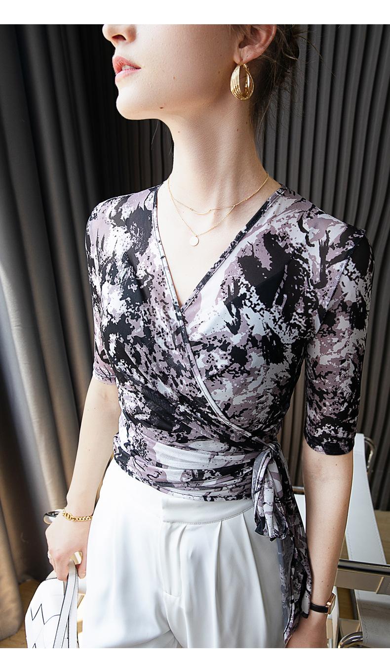 Top Estampado Abstracto Primavera y Verano Nuevo Tirantes Cruzados Malla Cuello en V Manga Media Estilo Occidental