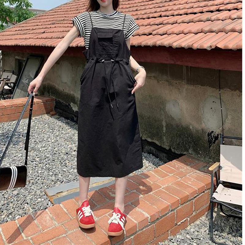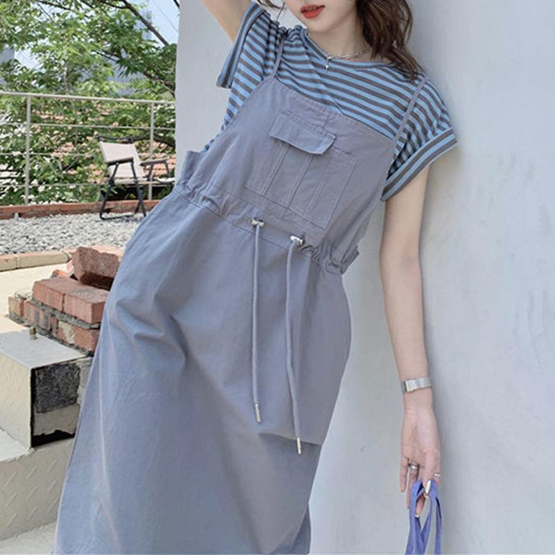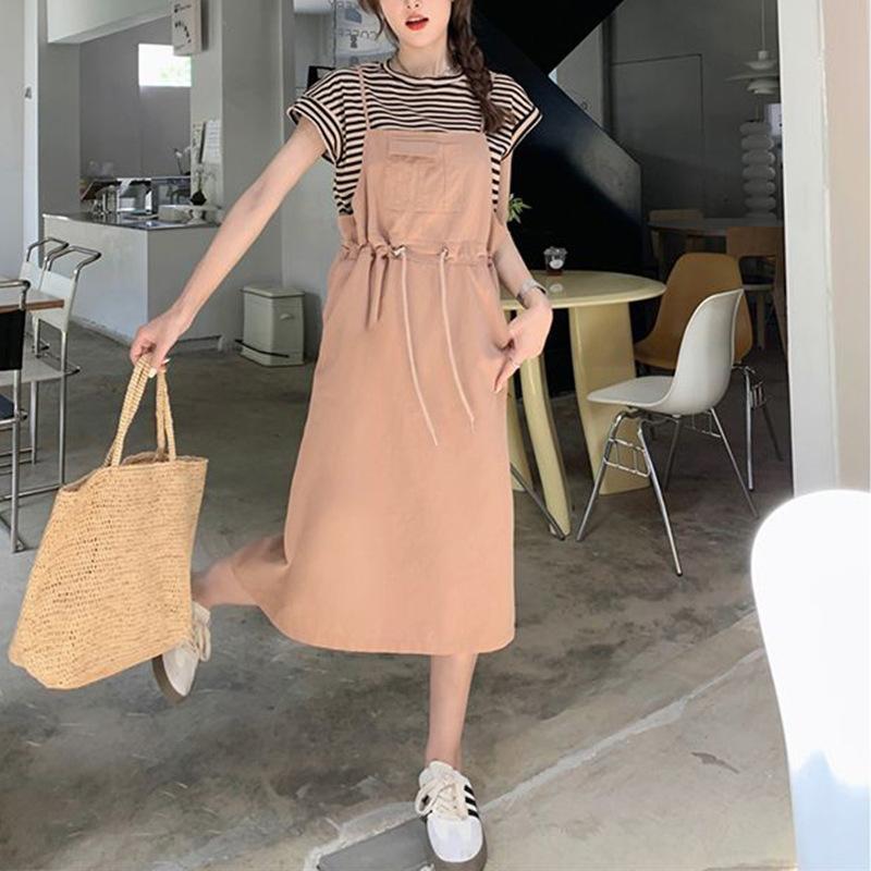 Vestido de Tirantes con Cintura Ajustable Camiseta de Manga Corta a Rayas Nuevo Conjunto de Dos Piezas de Moda Fresca para Verano 2025 para Mujer