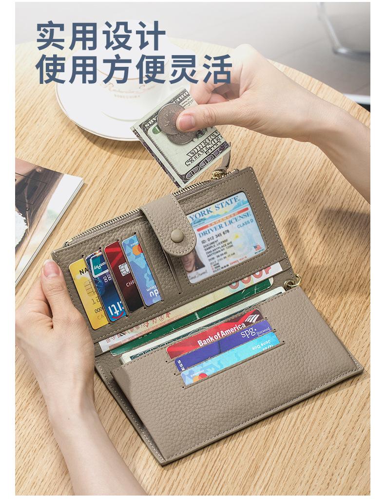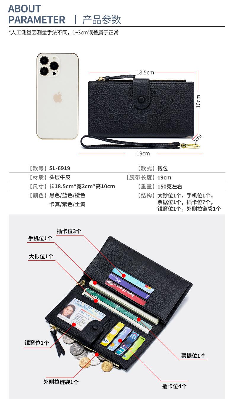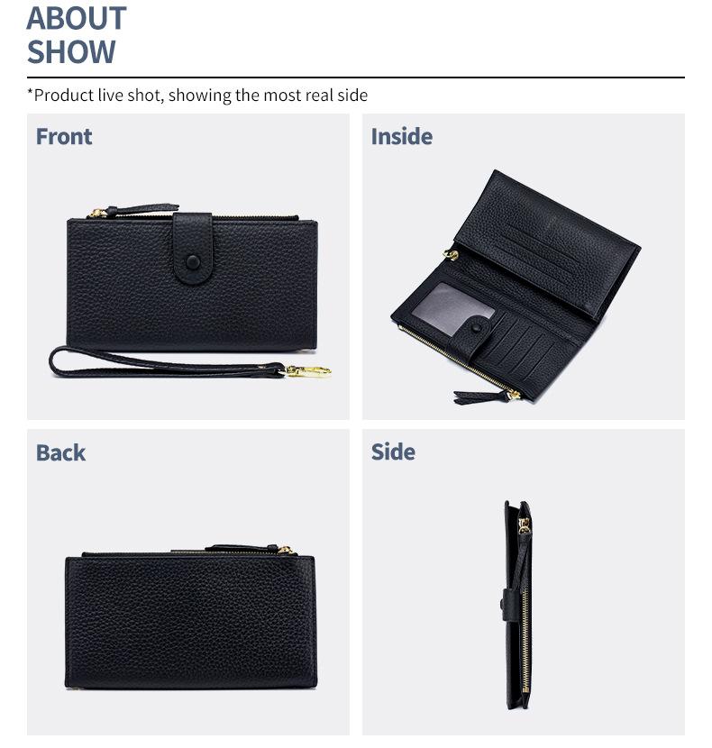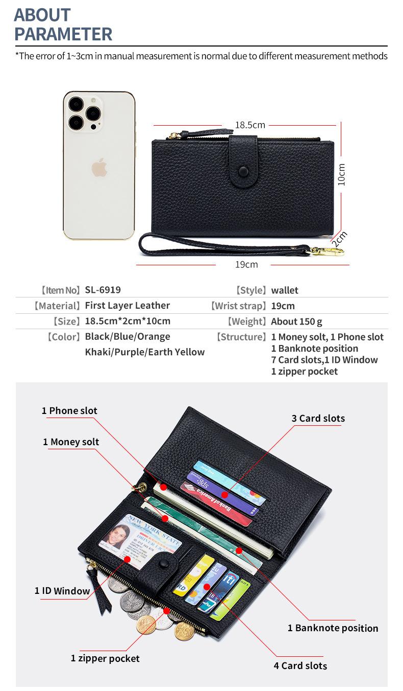 Estructura: 1 ranura para billetes/1 ranura para teléfono móvil/1 ranura para recibos/7 ranuras para tarjetas/1 ranura para espejo/1 bolsillo exterior con cremallera