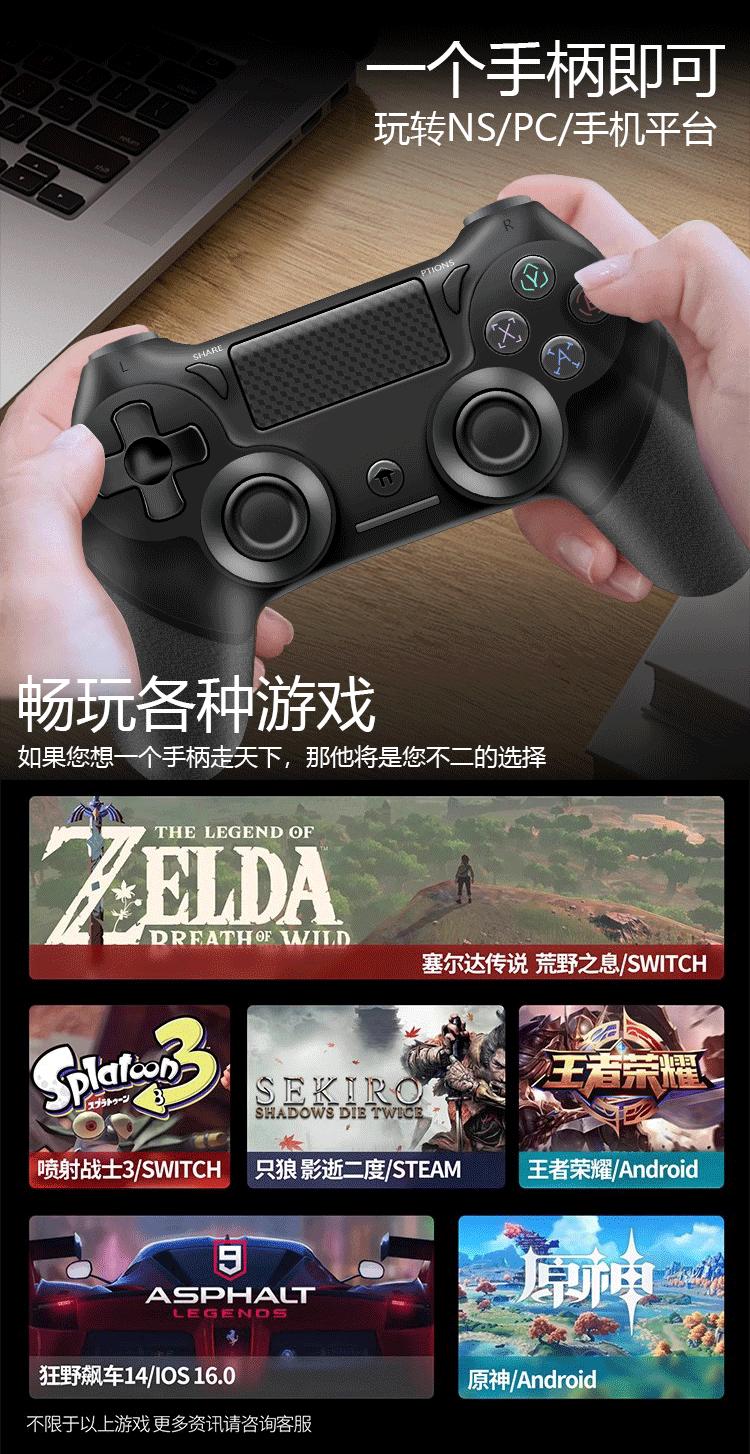 Este producto es compatible con la consola de juegos P4, es un control inalámbrico Bluetooth de doble vibración, fabricado con una solución estable 5.0 para sin retraso y sin desconexiones. Admite personalización de capacidad de batería, personalización de joystick 3D, personalización de embalaje, personalización de logotipo. Compatible con la consola de juegos P4, compatible con algunas funciones de la consola de juegos P5, compatible con la consola de juegos P3, compatible con PC.
