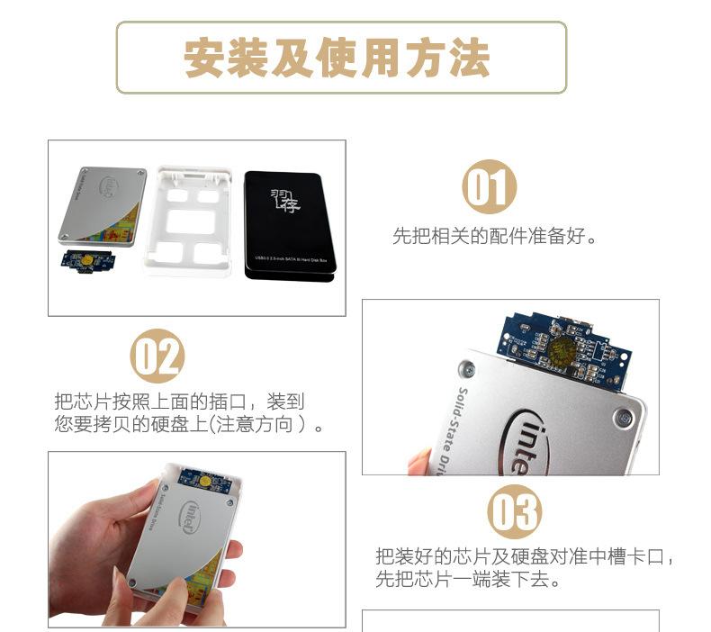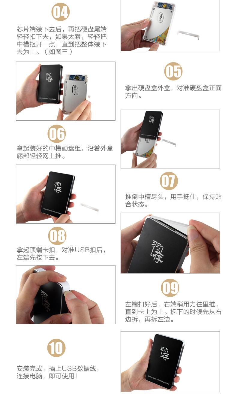 ⊙Montar el disco duro: inserte el disco duro directamente en la placa PCBA, luego instálelo en la carcasa de plástico, y luego empuje la carcasa de plástico con el disco duro instalado en la cubierta de aleación de aluminio. Cuando la computadora esté funcionando normalmente, finalmente conecte la interfaz USB.