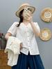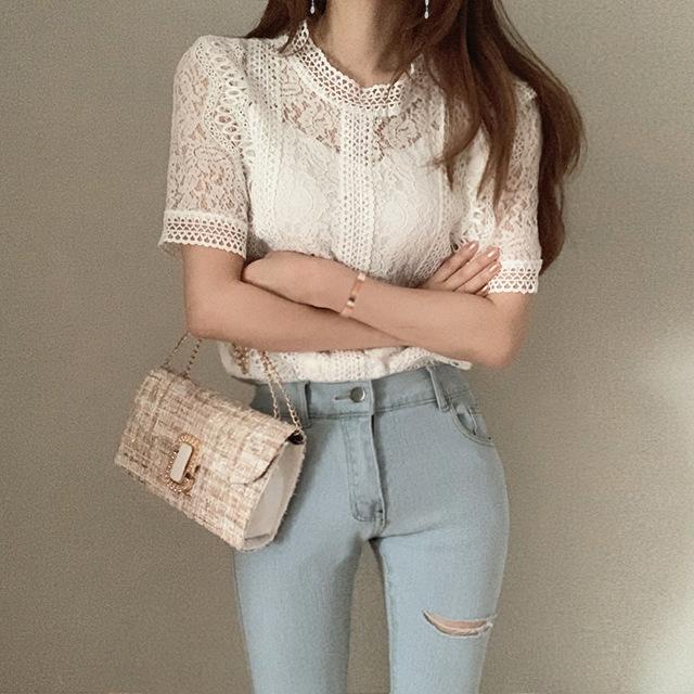 Camisa de Encaje para Mujer 2023 Verano Nueva Color Puro Cuello Redondo Manga Corta Crochet Calado Holgada Versátil Estilo Extranjero Camisa para Mujer