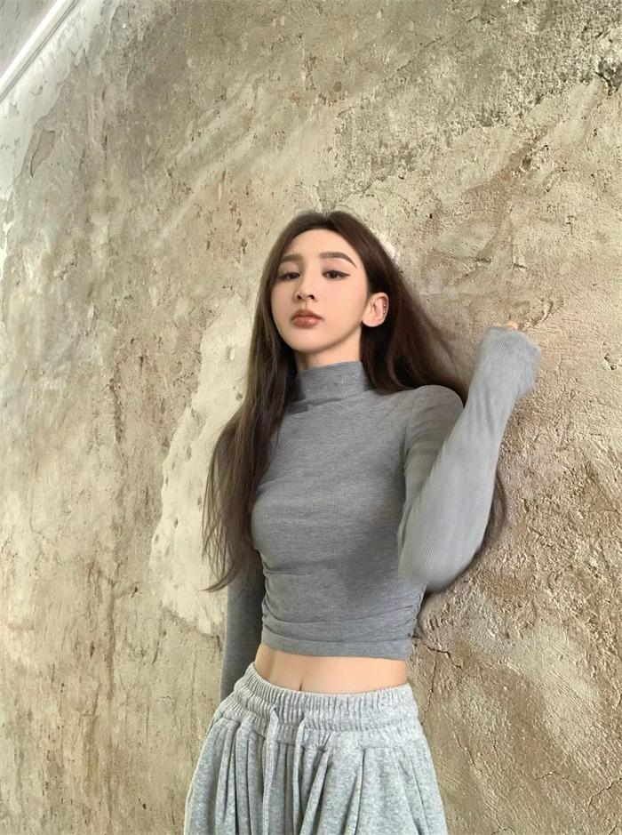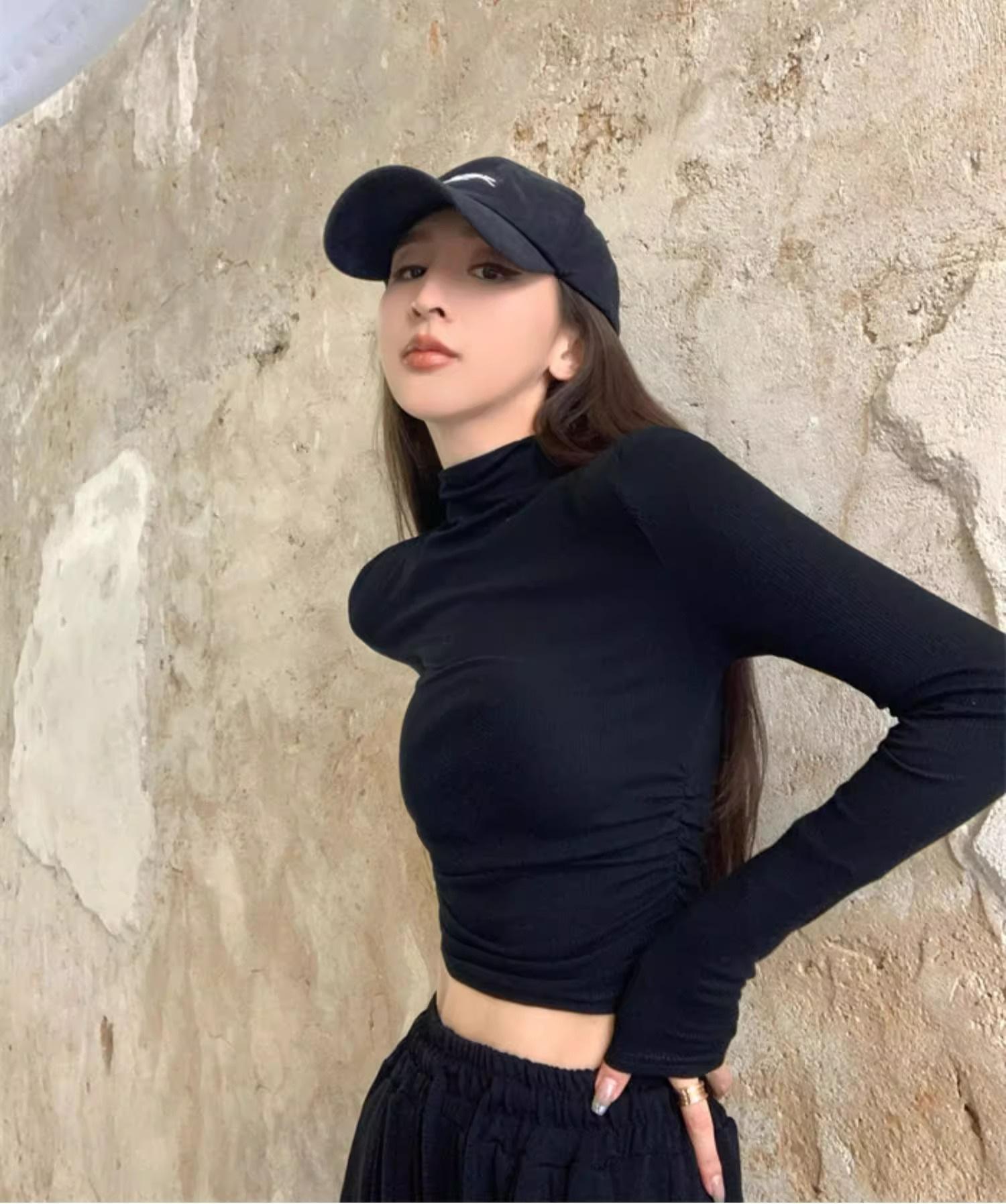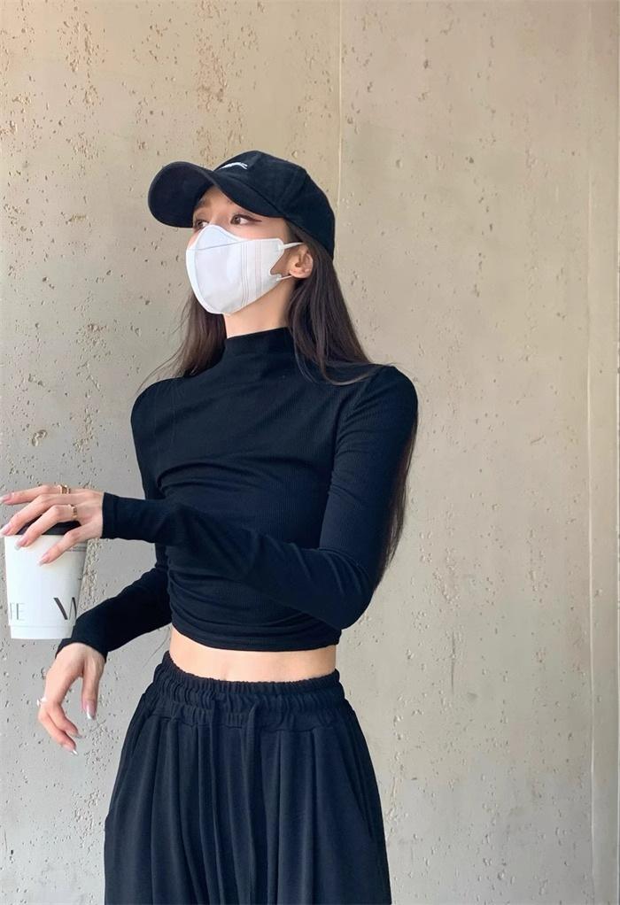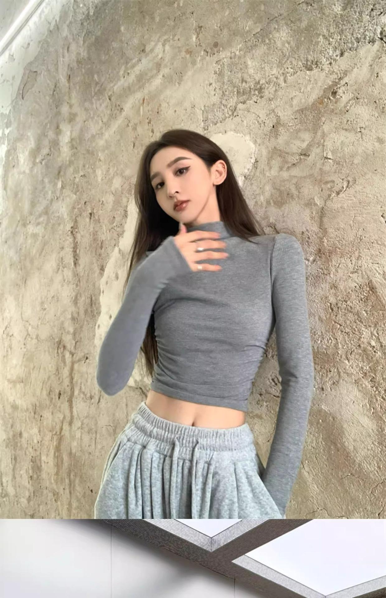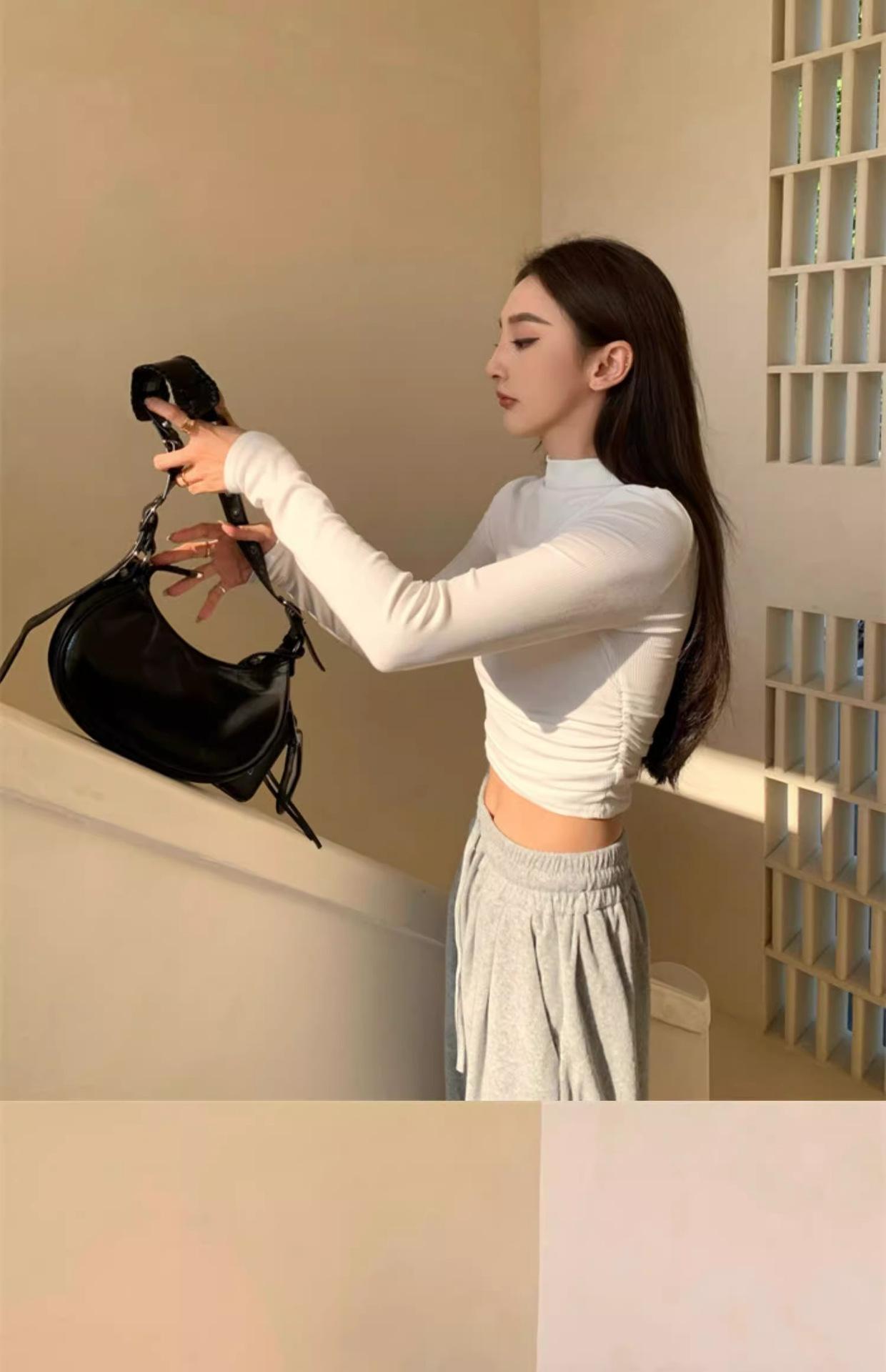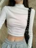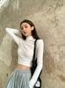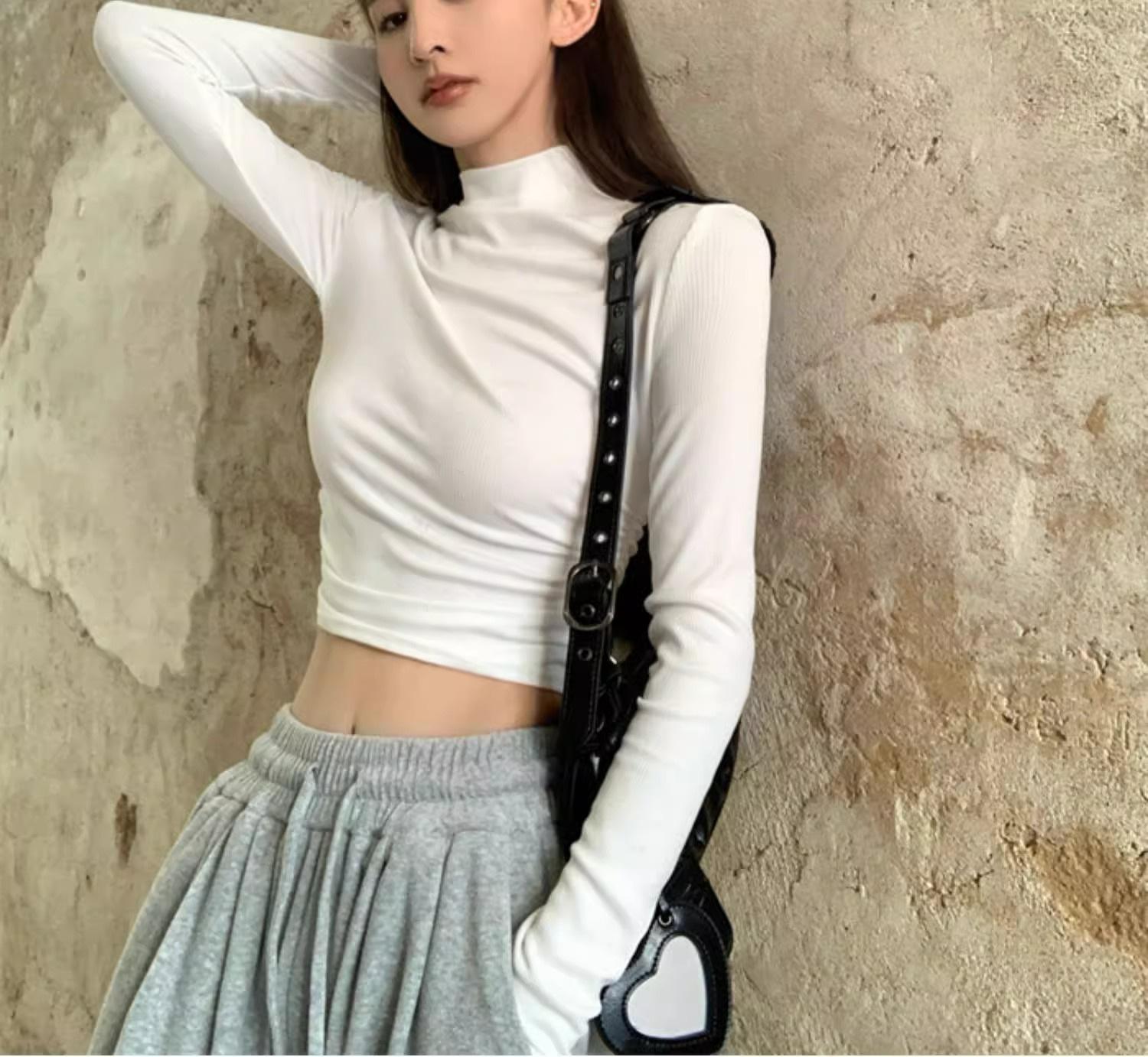 Camiseta de manga larga interior para mujer, color blanco puro, con cuello alto y parte superior corta ajustada de estilo occidental de moda de otoño e invierno