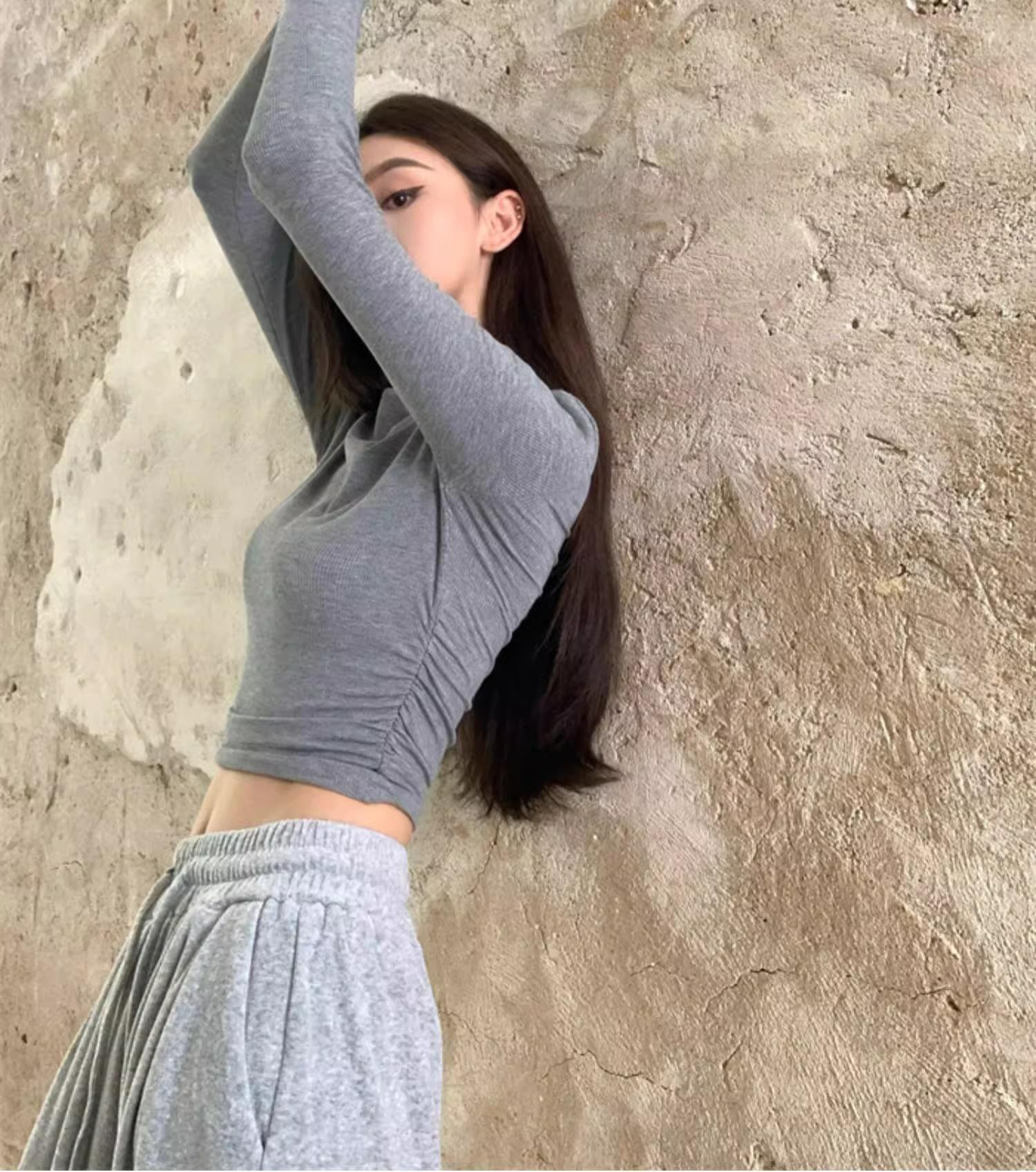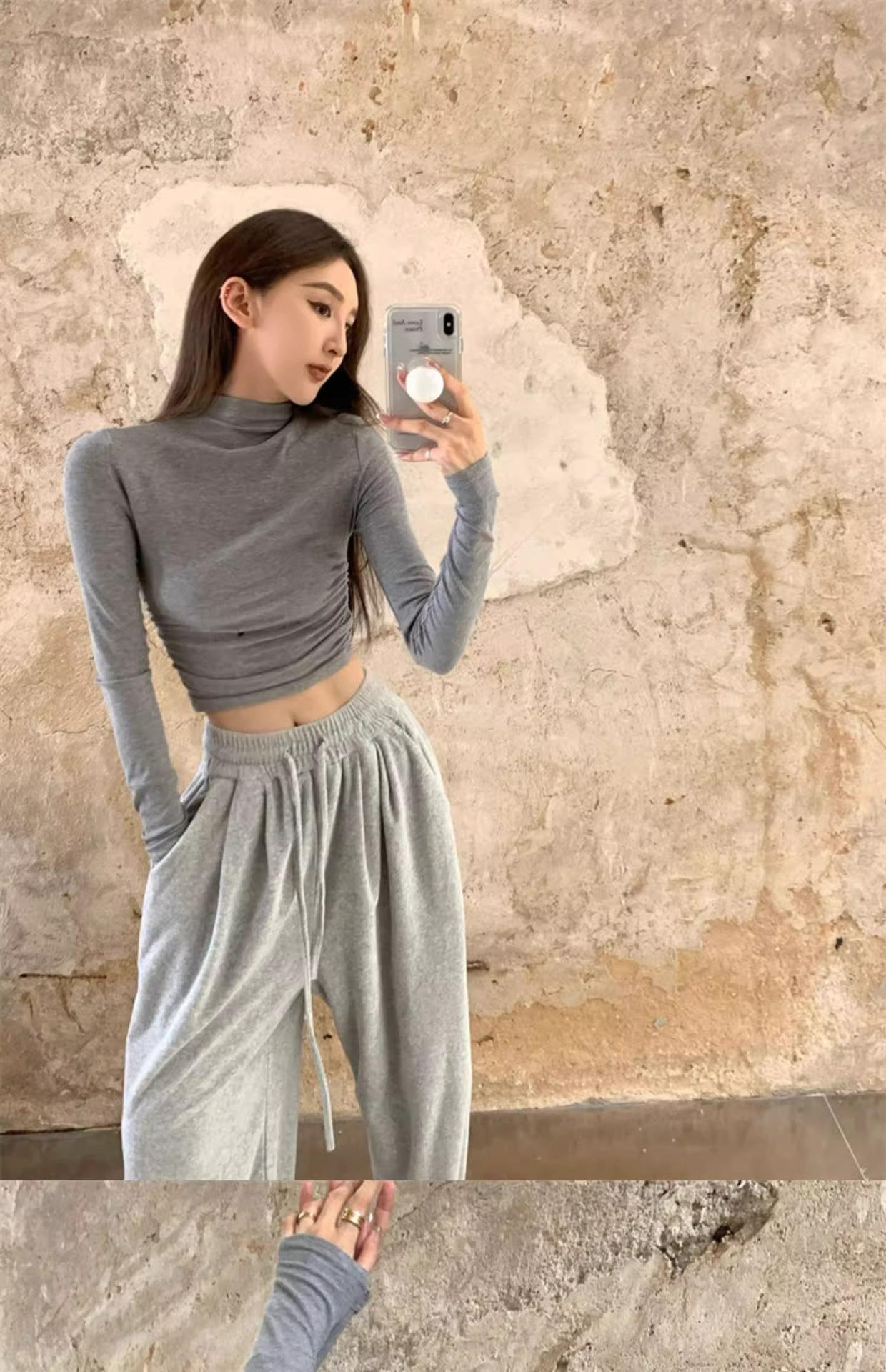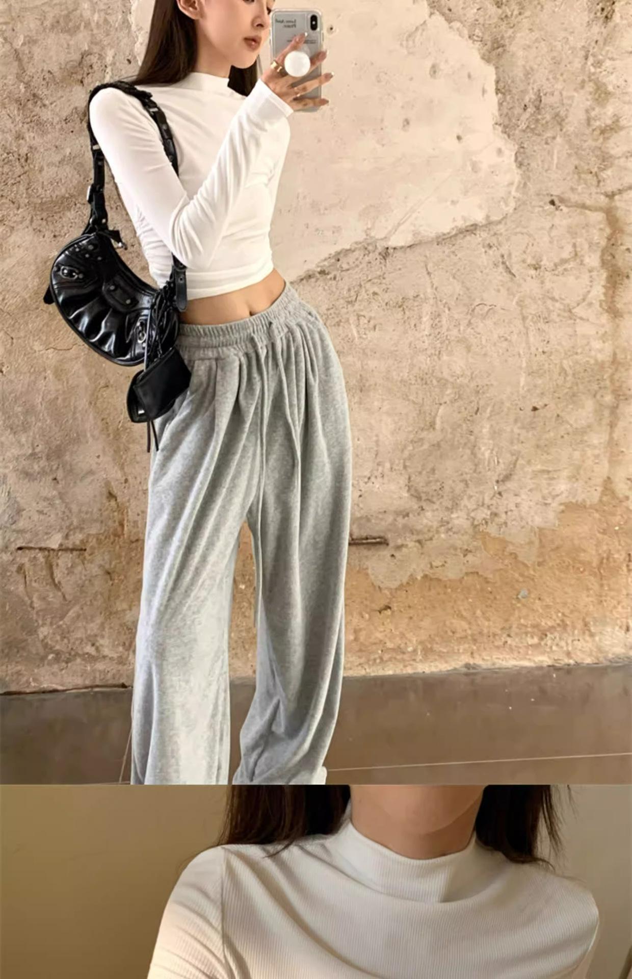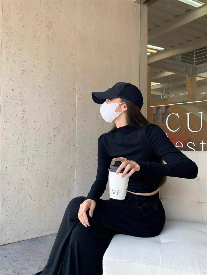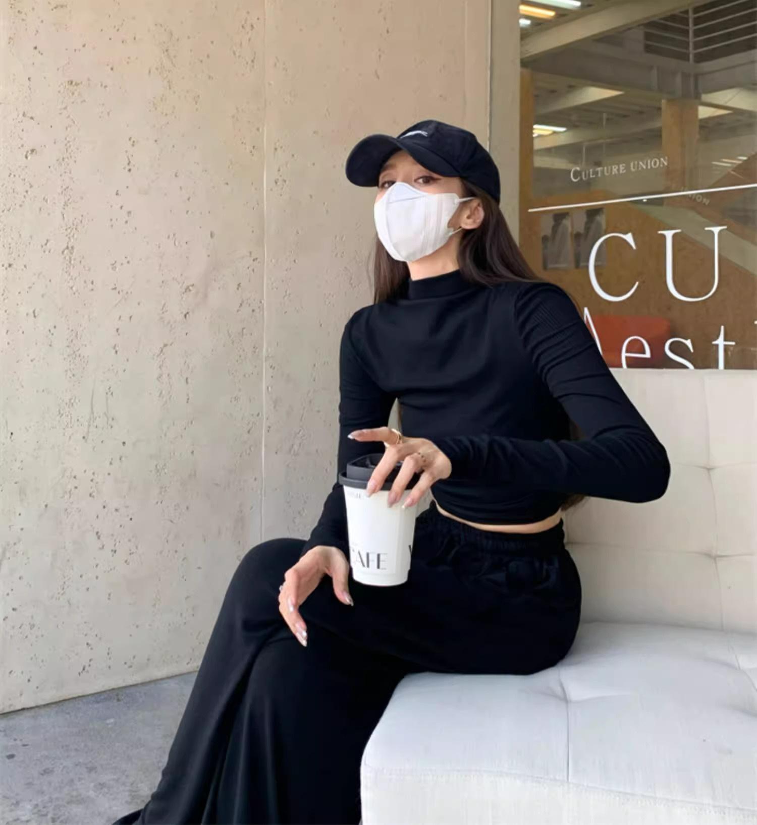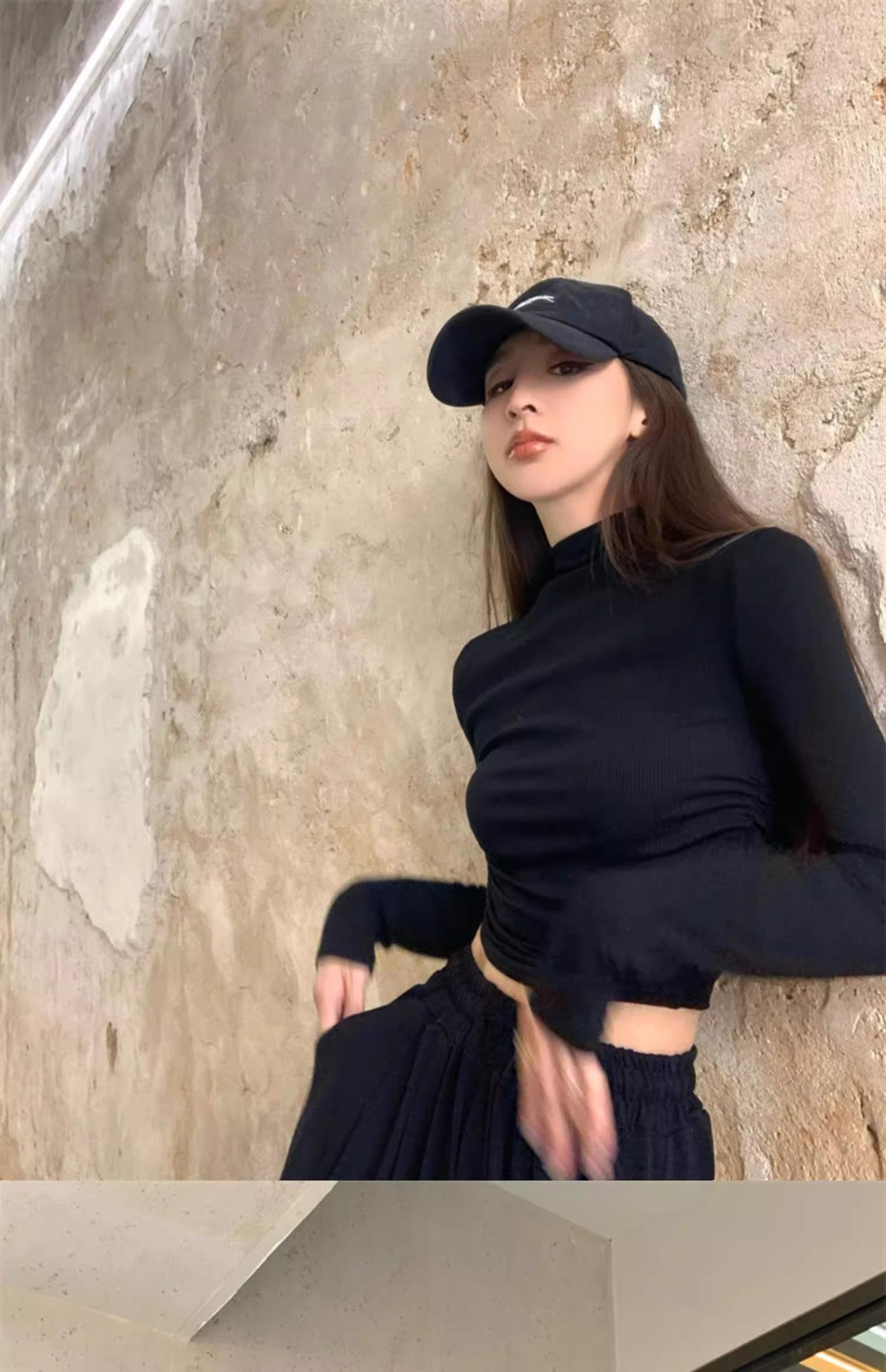 Camiseta de manga larga interior para mujer, color blanco puro, con cuello alto y parte superior corta ajustada de estilo occidental de moda de otoño e invierno