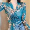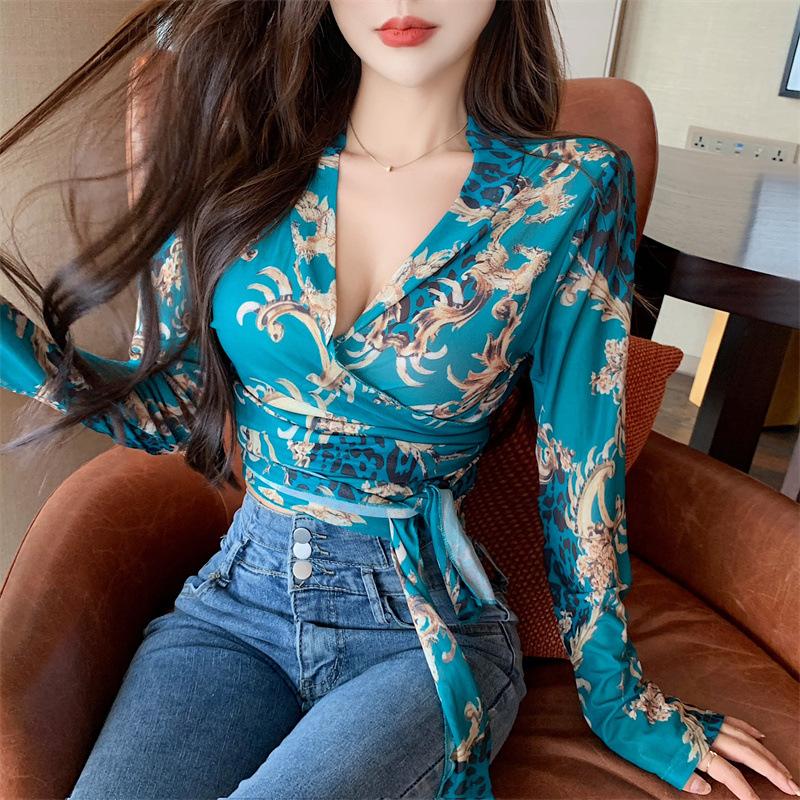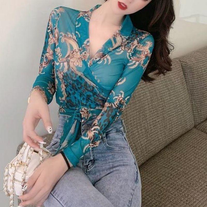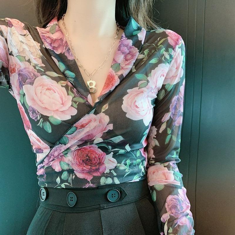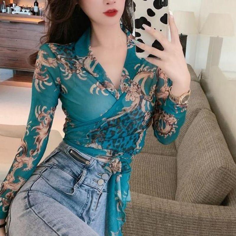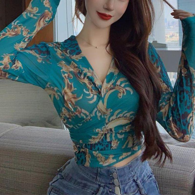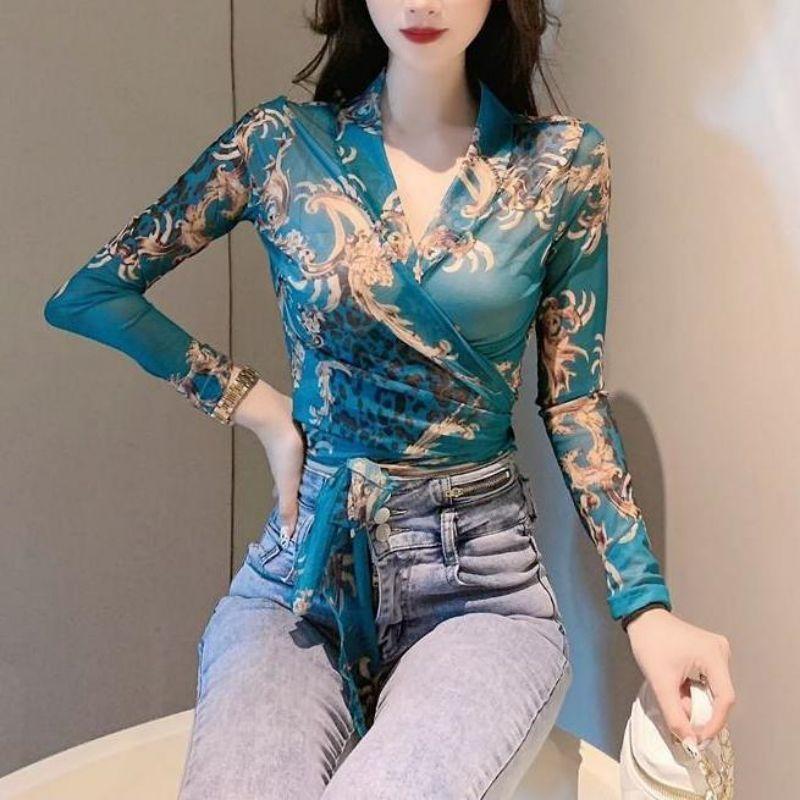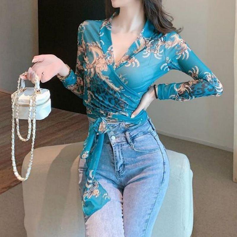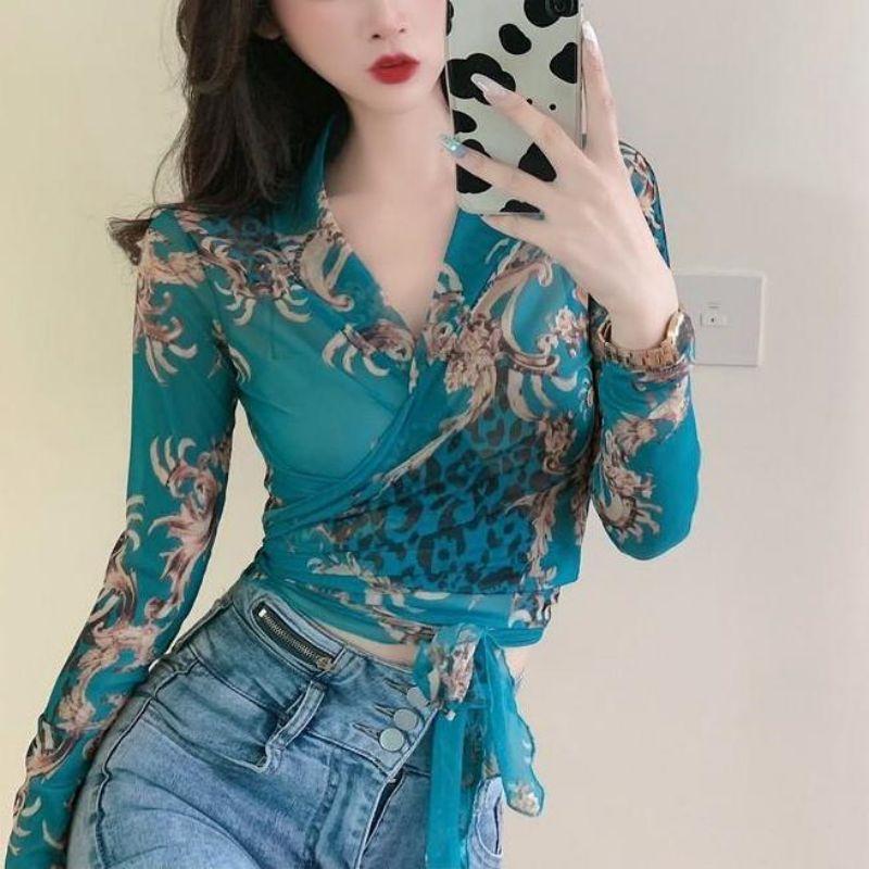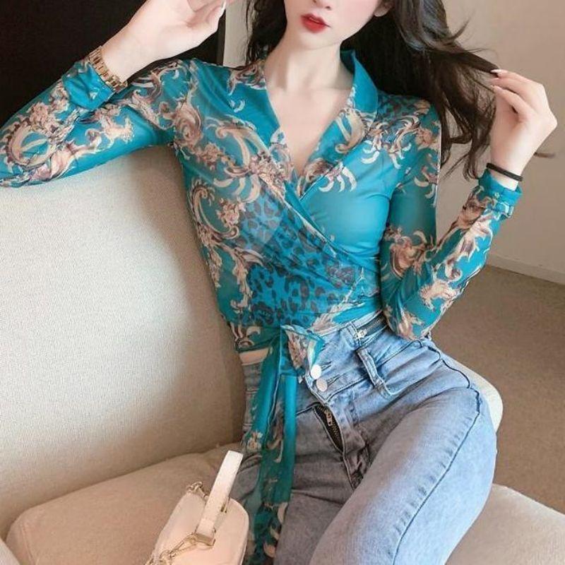 Camisa de Encaje Fino para Mujer Principios de Otoño Nuevo Nicho Francés Elegante Adelgazante Cuello Manga Larga Top Corto de Malla Ropa de Mujer
