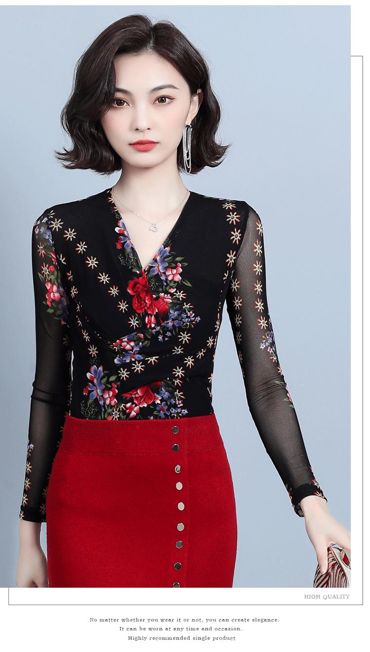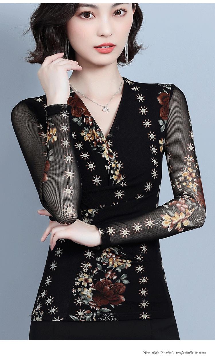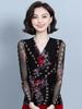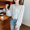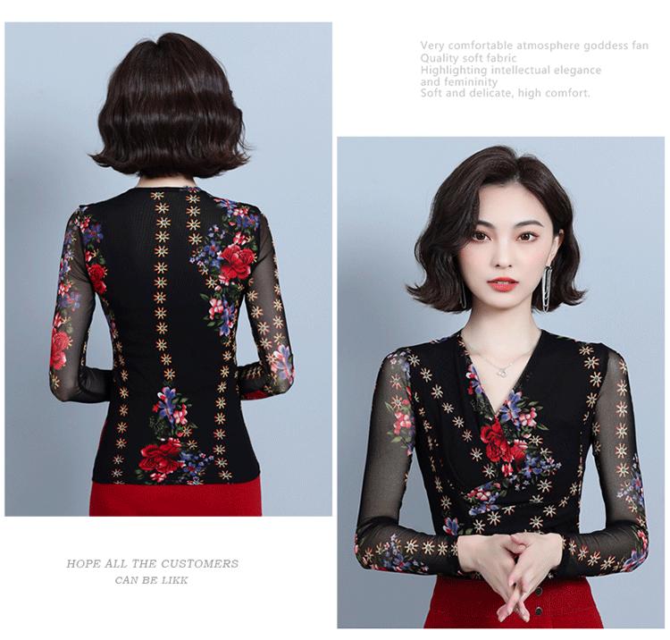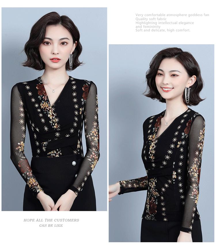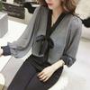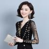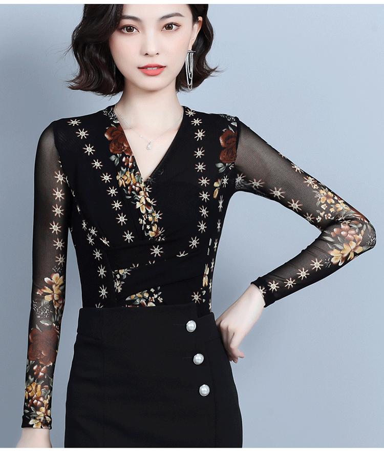 Camisa de encaje con cuello en V para mujer, nueva blusa de gasa de malla de manga larga de otoño 2021, camisa de estilo occidental que combina con todo