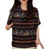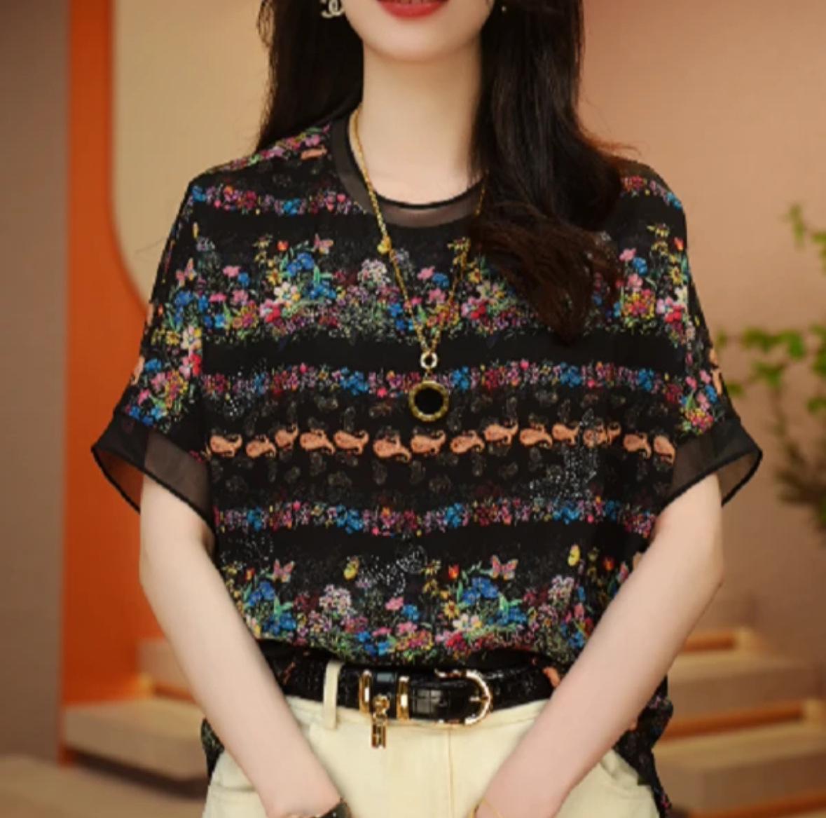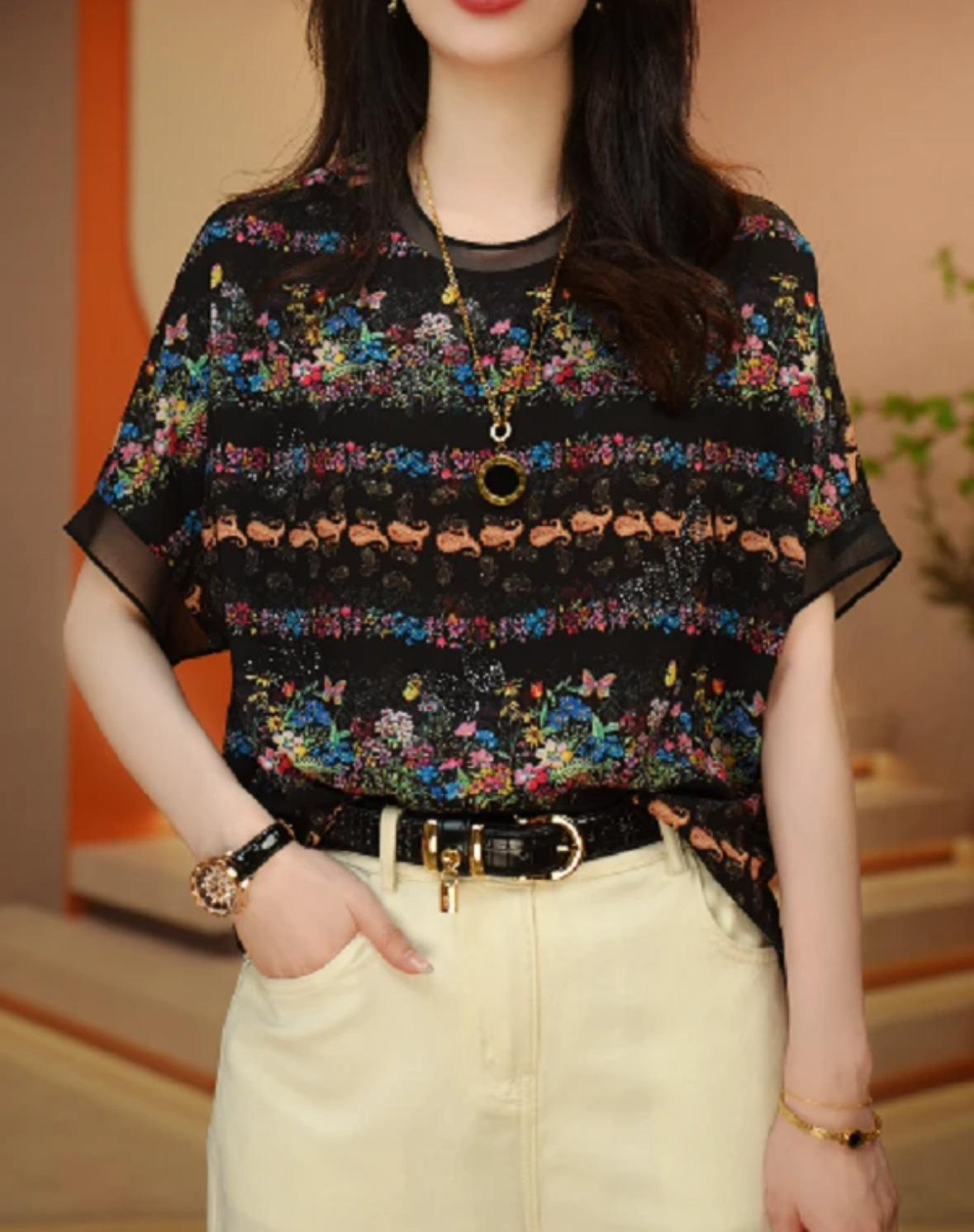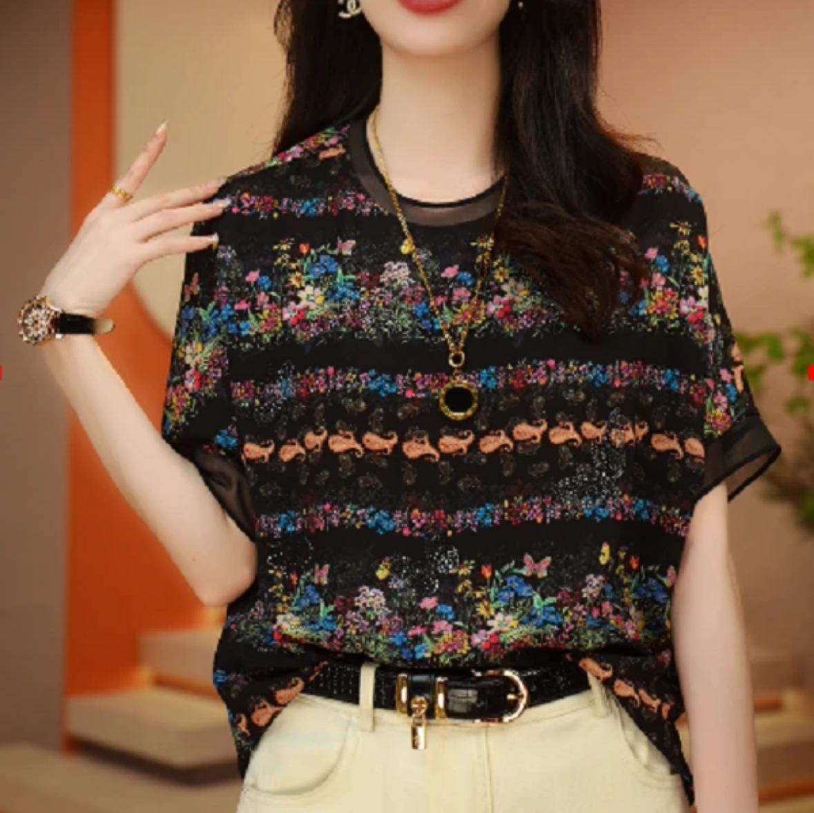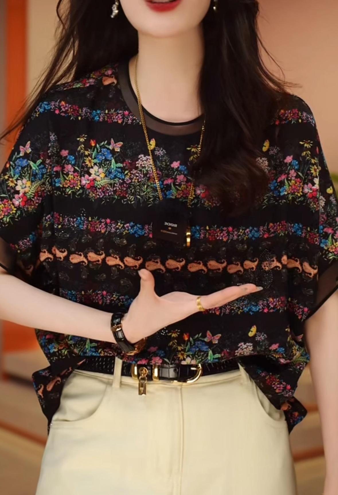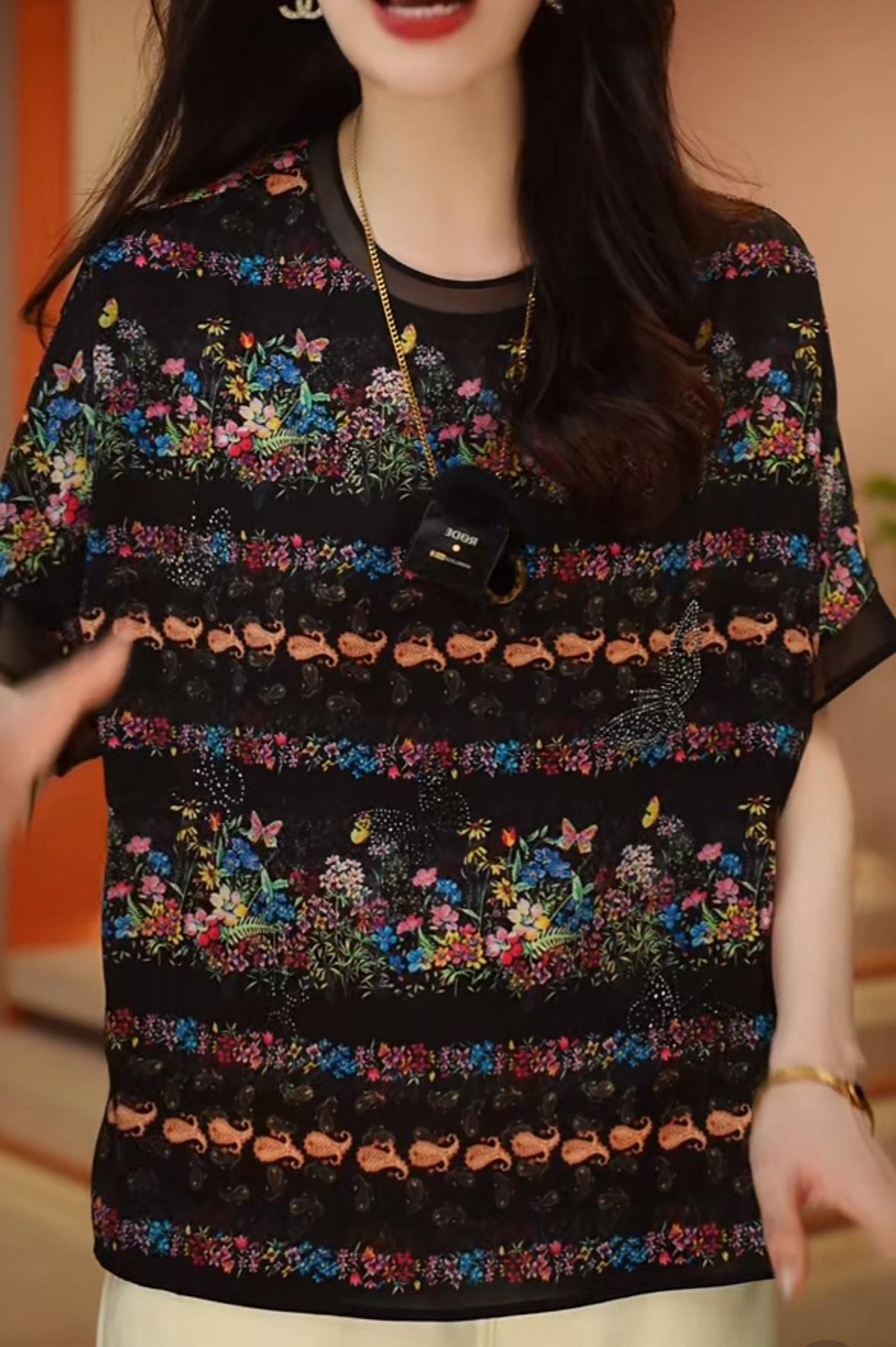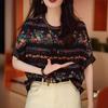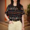 Camiseta negra con estampado vintage para mujer, novedad de verano 2024, estilo occidental de alta gama, a la moda, combinable, de manga corta.