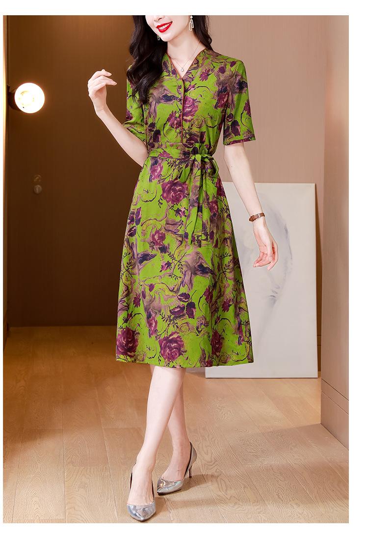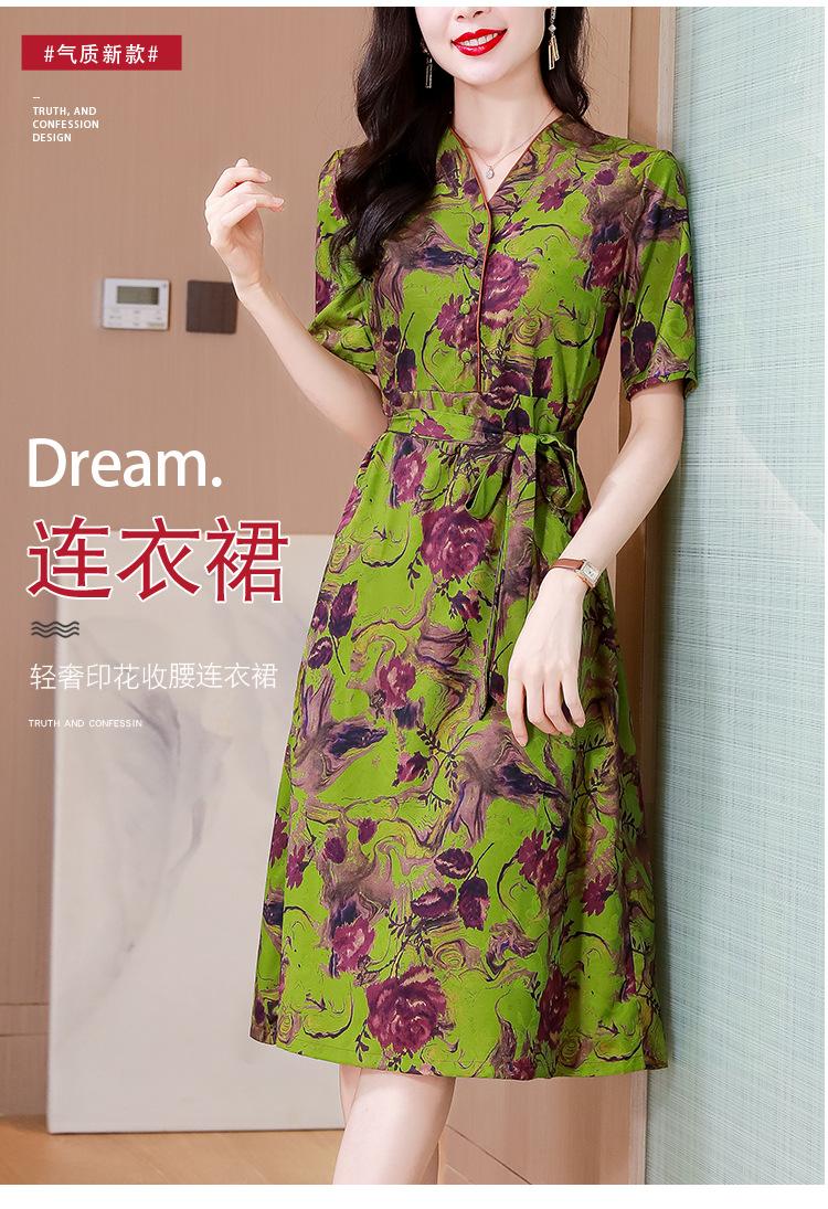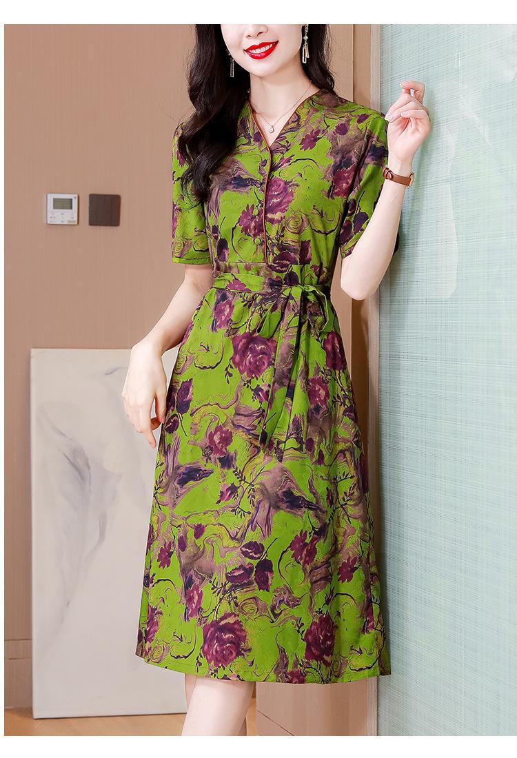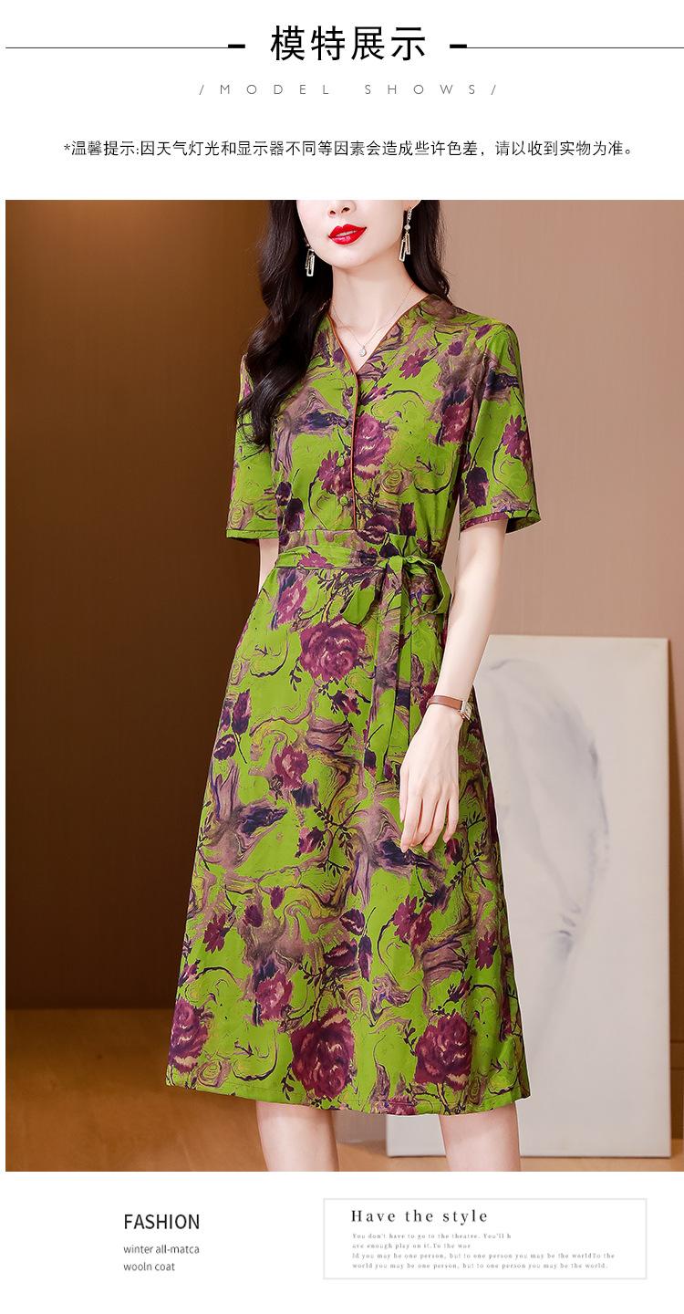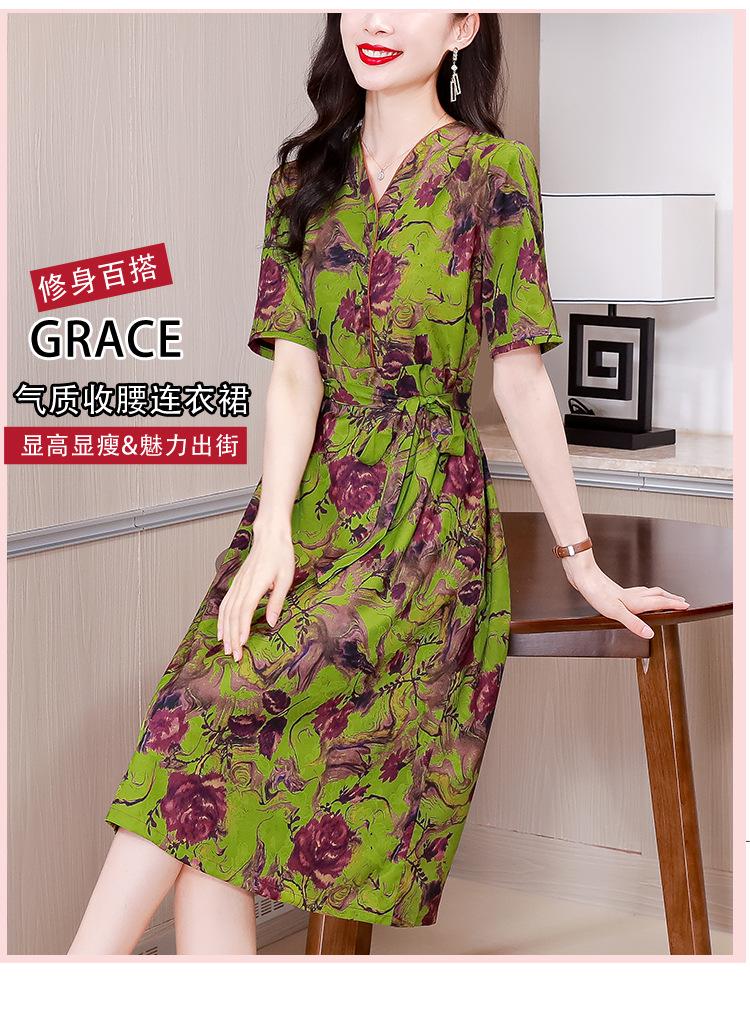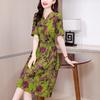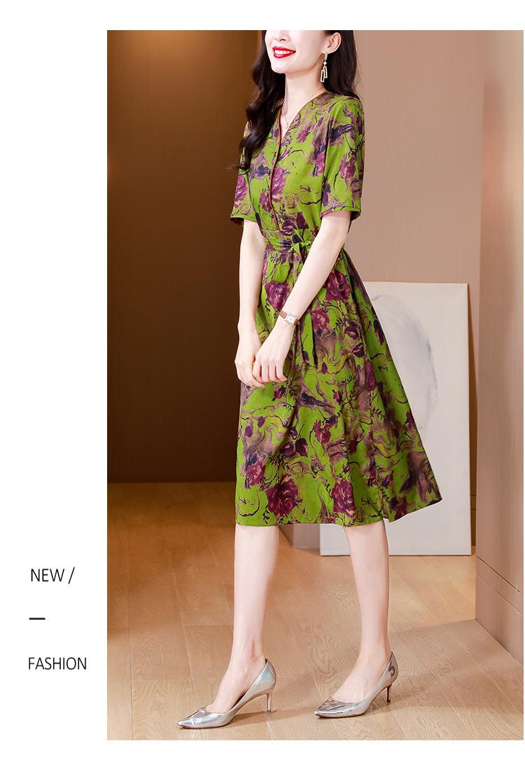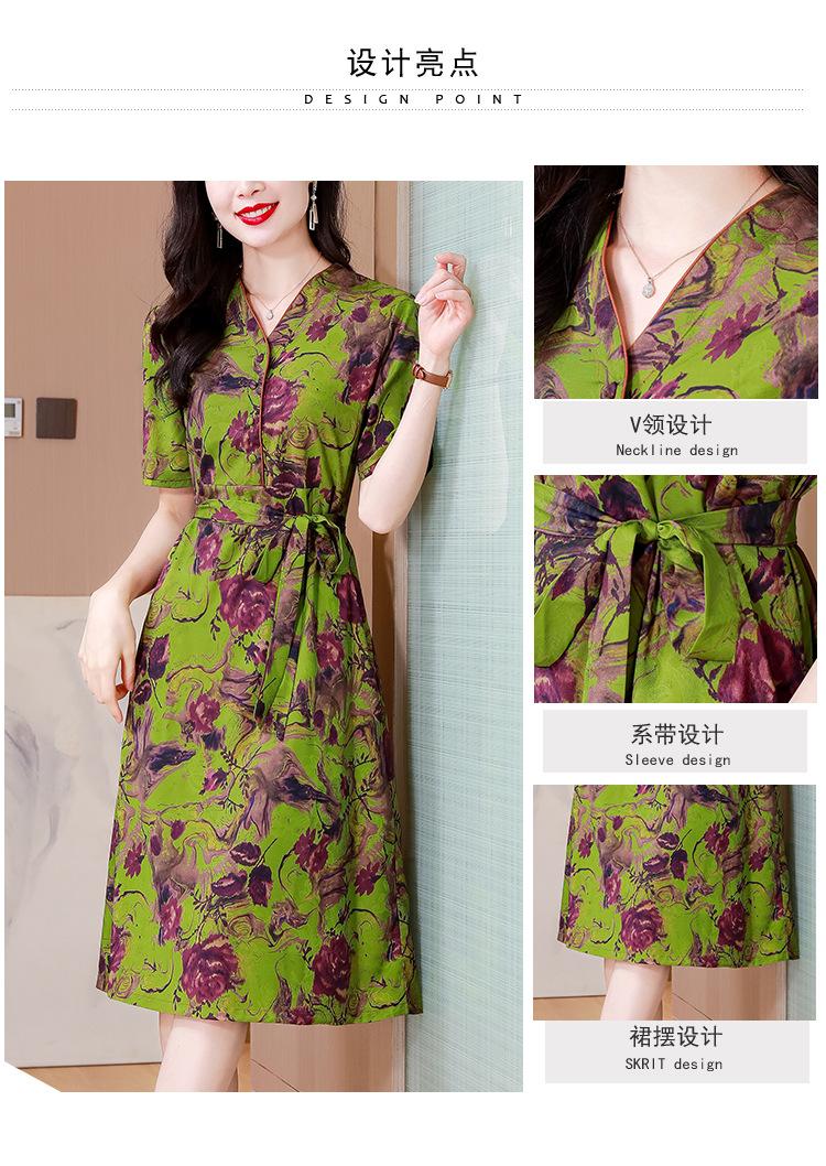 Vestido Estampado para Mujer Verano 2024 Nuevo Estilo Cuello en V Ajustado a la Cintura Aspecto Adelgazante Largo Medio Falda Línea A