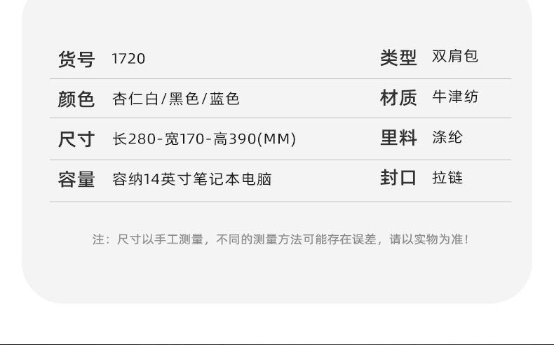 Tamaño 1720: largo 28 ancho 17 alto 39cm, el compartimento puede contener una laptop empresarial de 14 pulgadas, tela: tela Oxford, forro: poliéster, peso 0.7kg, capacidad: 19L, puedes consultarlo