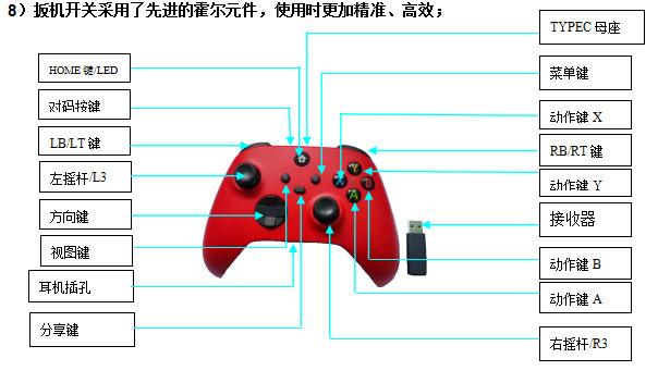 1)yXBOX ONEConexión inalámbrica del host: Conecte el receptor al hostUSBLa luz del receptor parpadeará, y el botón de emparejamiento de Changan parpadeará rápidamente, entrando en el estado de emparejamiento; luego coloque la batería en el compartimento de la batería del mando y presione el mandoHOGARtecla, la luz del control parpadeará, presione el botón de emparejamiento en el control nuevamente, la luz en el control parpadeará rápidamente, después de parpadear durante unos segundos, se conectará al receptor, las luces tanto en el control como en el receptor permanecerán encendidas, indicando una conexión exitosa, y luego puede funcionar normalmente en la consola.Uso; (Conexión por cable incluida)USBInserte un extremo del alambre en el mangoTIPO CEl conector hembra se inserta en el hostUSBDespués de que se abra el puerto, la luz en el mango permanecerá encendida, indicando que la conexión con el host es exitosa y que se puede usar normalmente en el host);((Conectar a la computadora igual que operar el host)