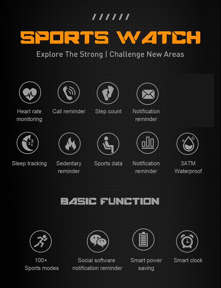 Step counting, Heart rate monitoring, Bluetooth call, Smart reminder, Remote control selfie, Sleep monitoring