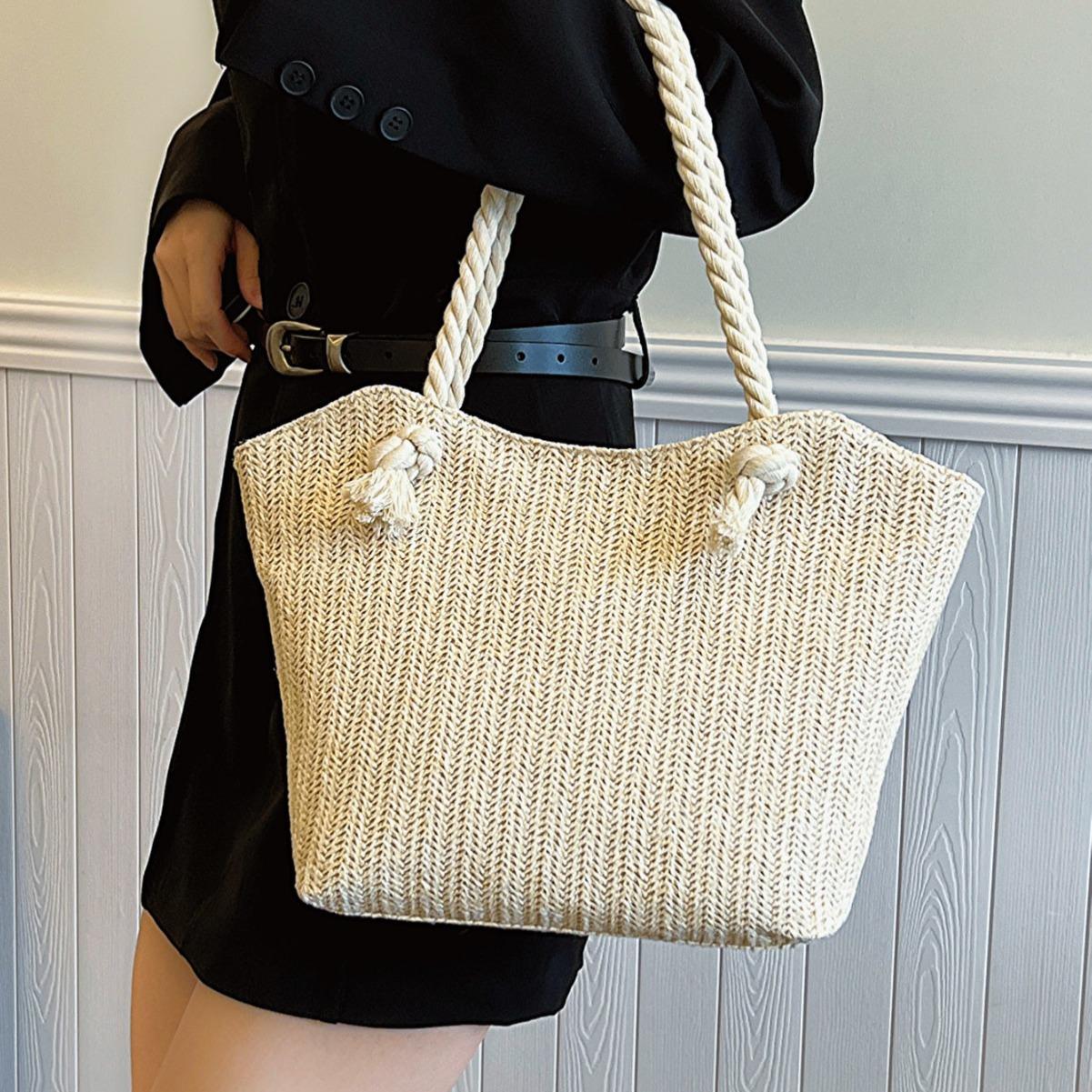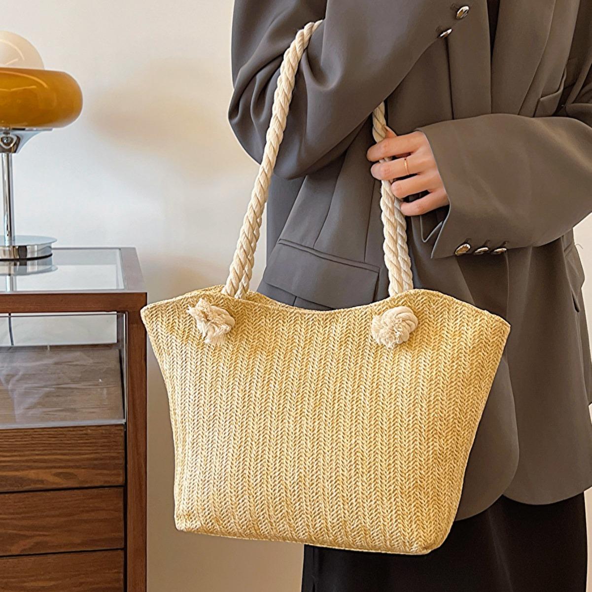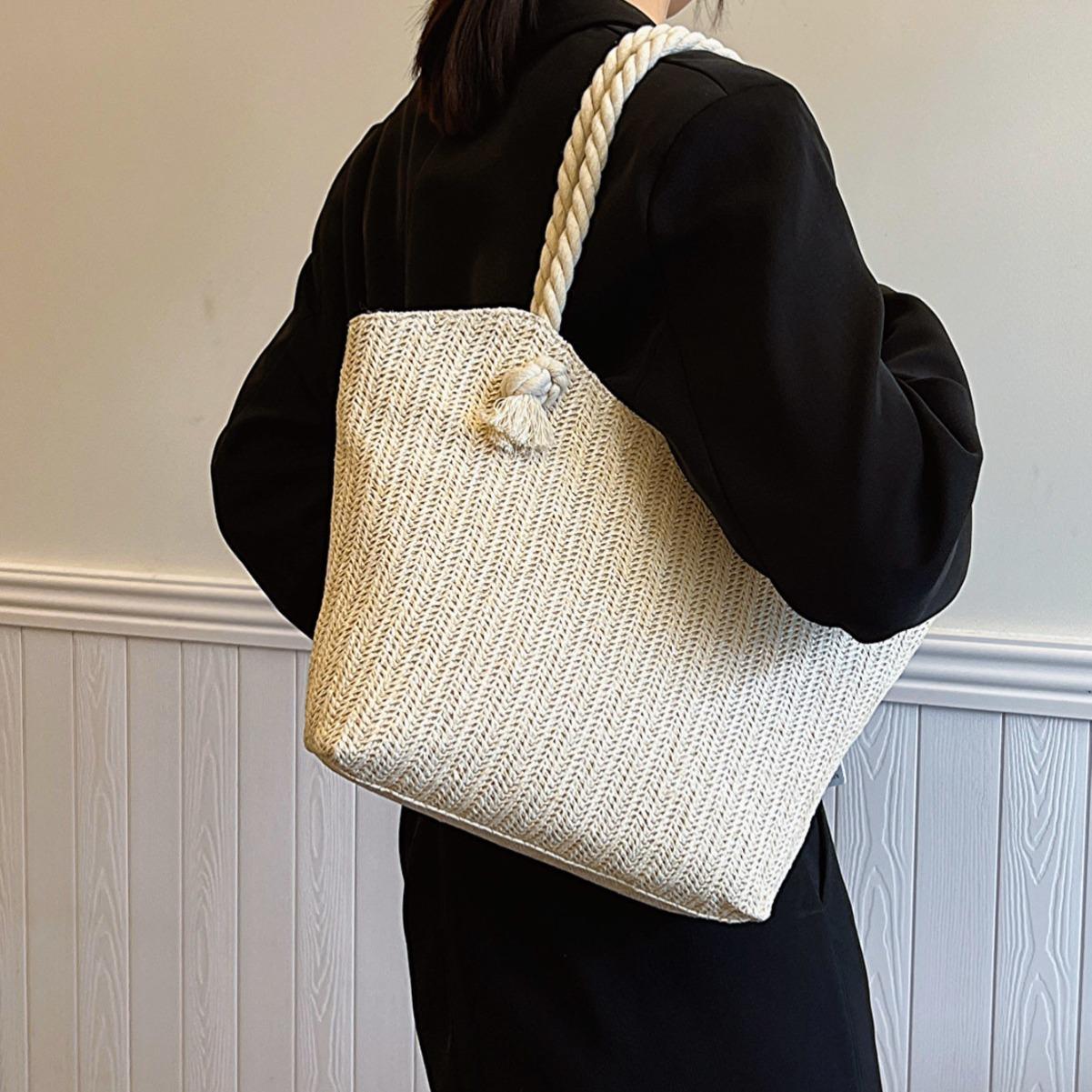 Bolso de paja tejido de gran capacidad, nuevo y elegante bolso de mano portátil para vacaciones, bolso de hombro moderno y combinable.