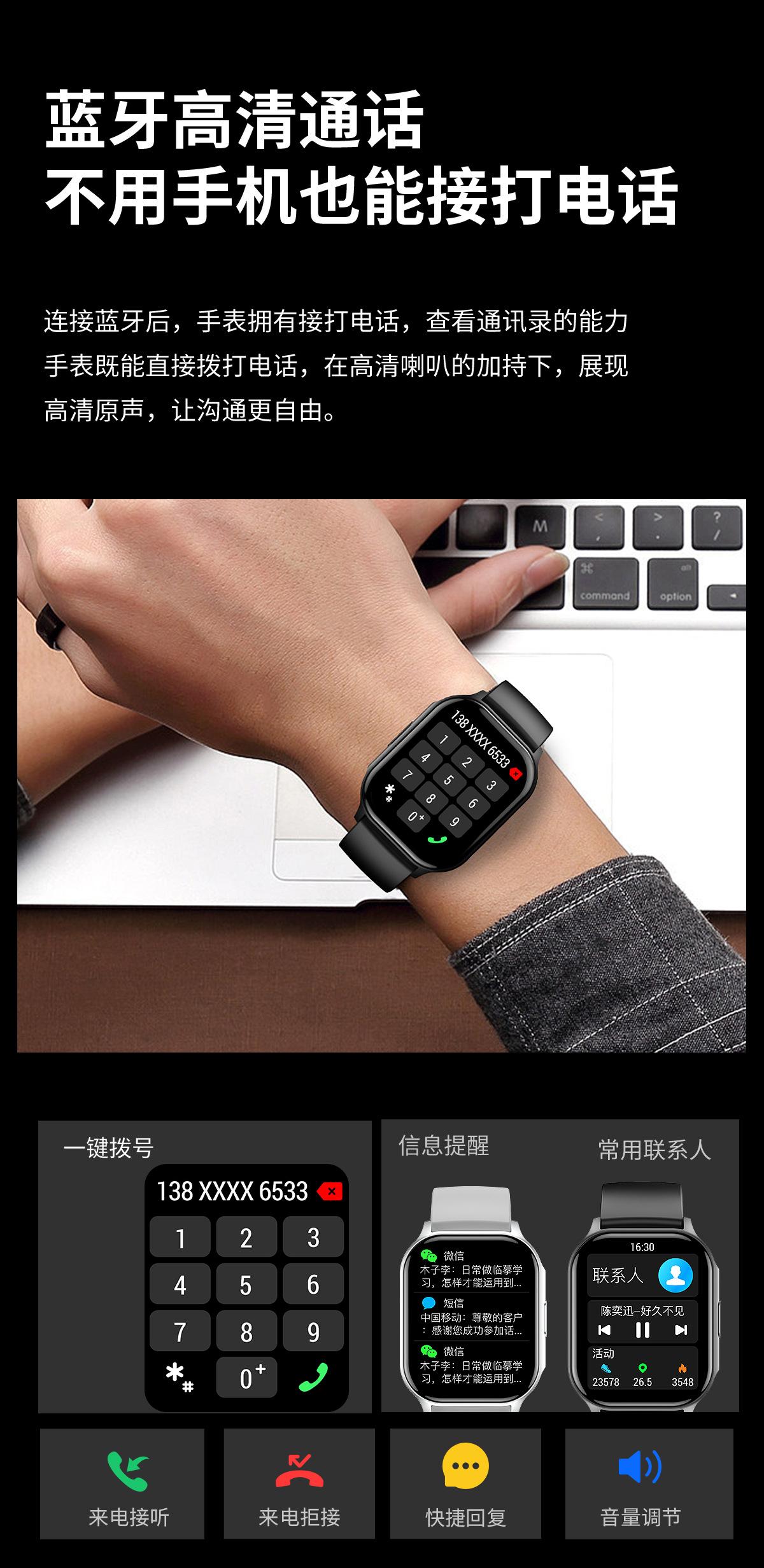 Waterproof, Heart rate monitoring, Bluetooth call, Smart reminder, Sleep monitoring