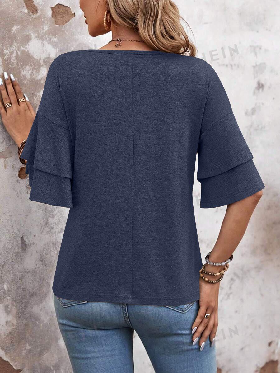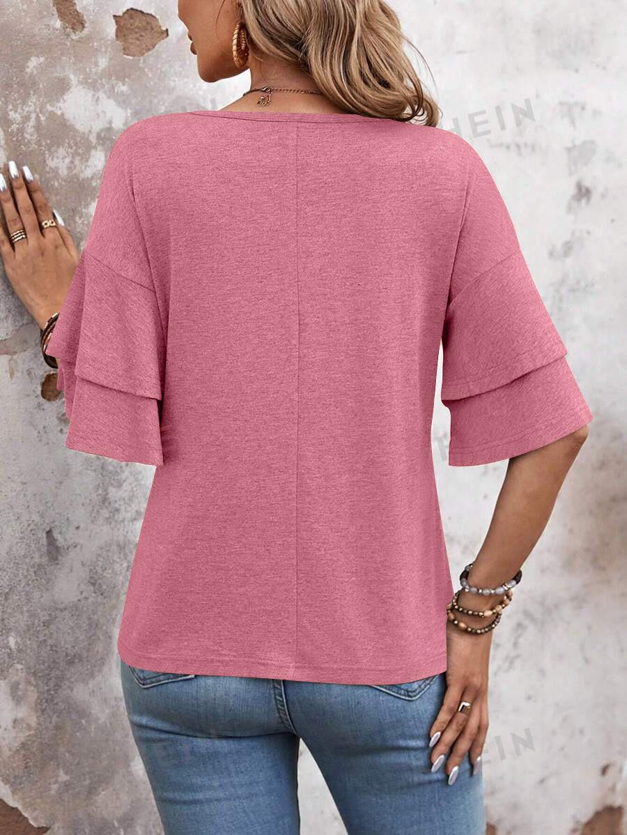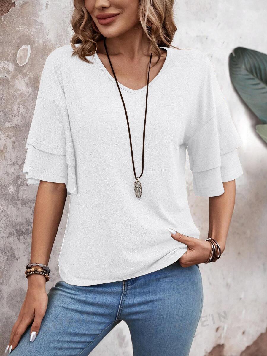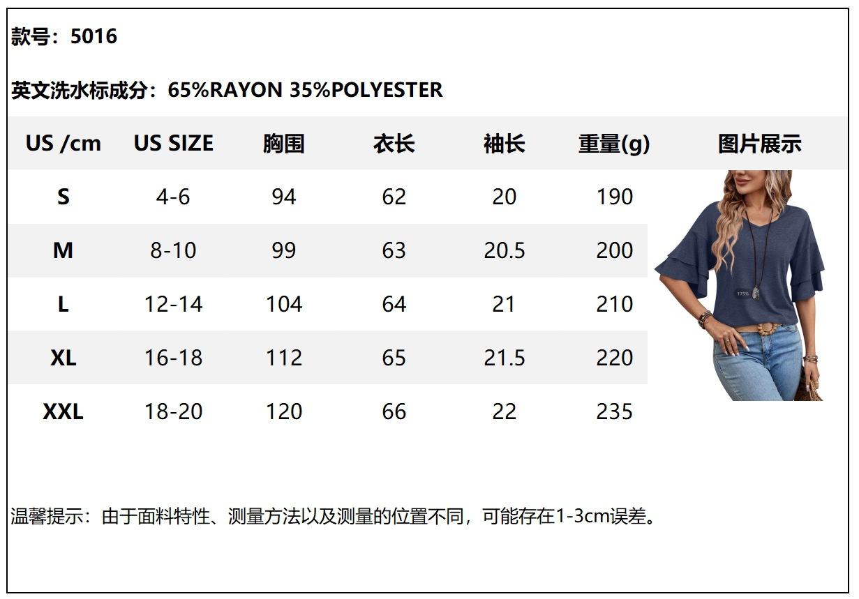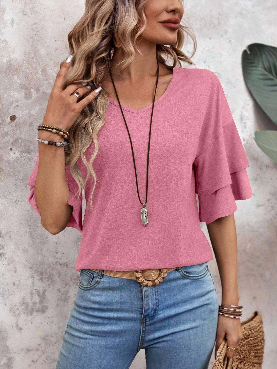 Amazon 2024 Europa y Estados Unidos comercio exterior transfronterizo verano nuevo color sólido cuello en V manga doble suelta camiseta de manga corta para mujer