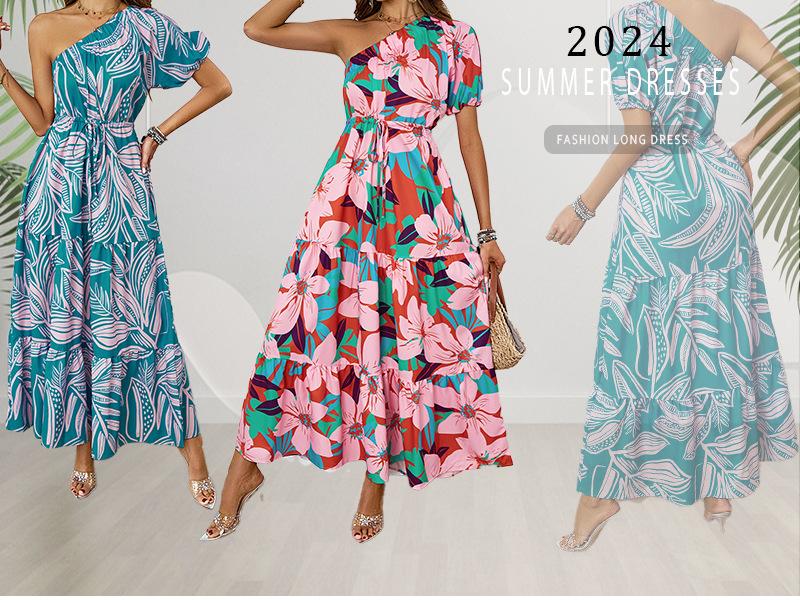 Compra Ropa de Mujer Europea y Americana Transfronteriza 2026 Verano Nuevo Sexy Hombro Descubierto Estampado Bohemio Vacaciones Junto al Mar Vestido Largo al por mayor en Joom.pro