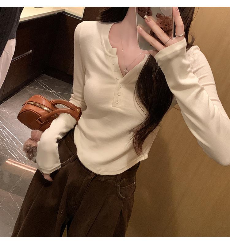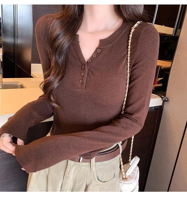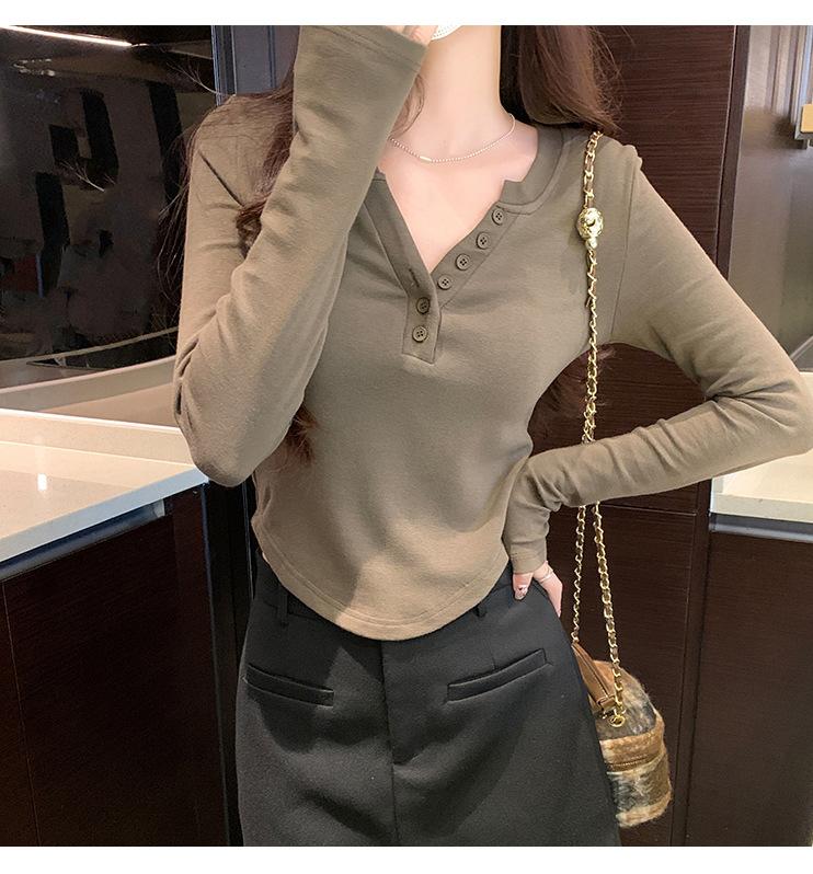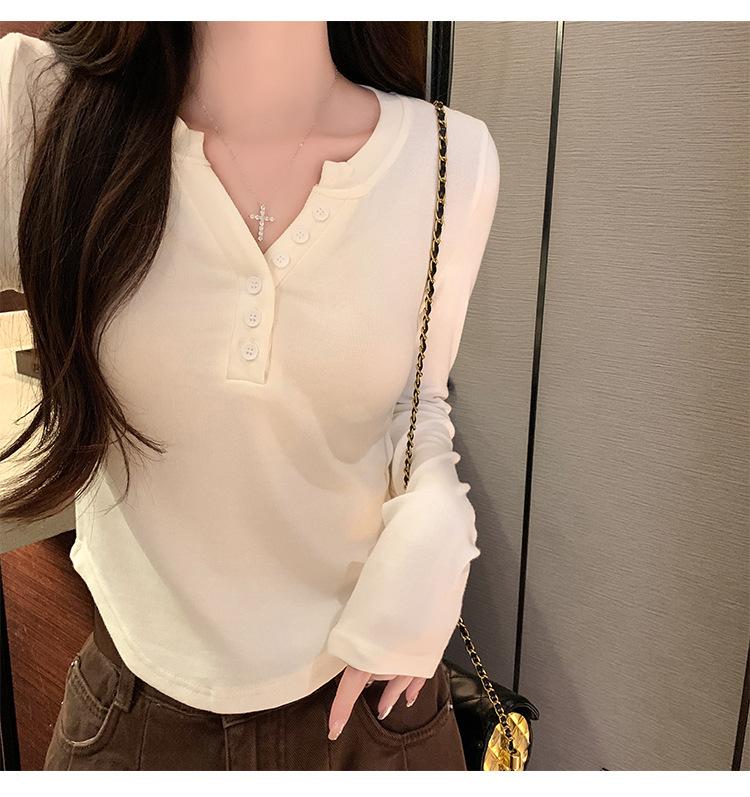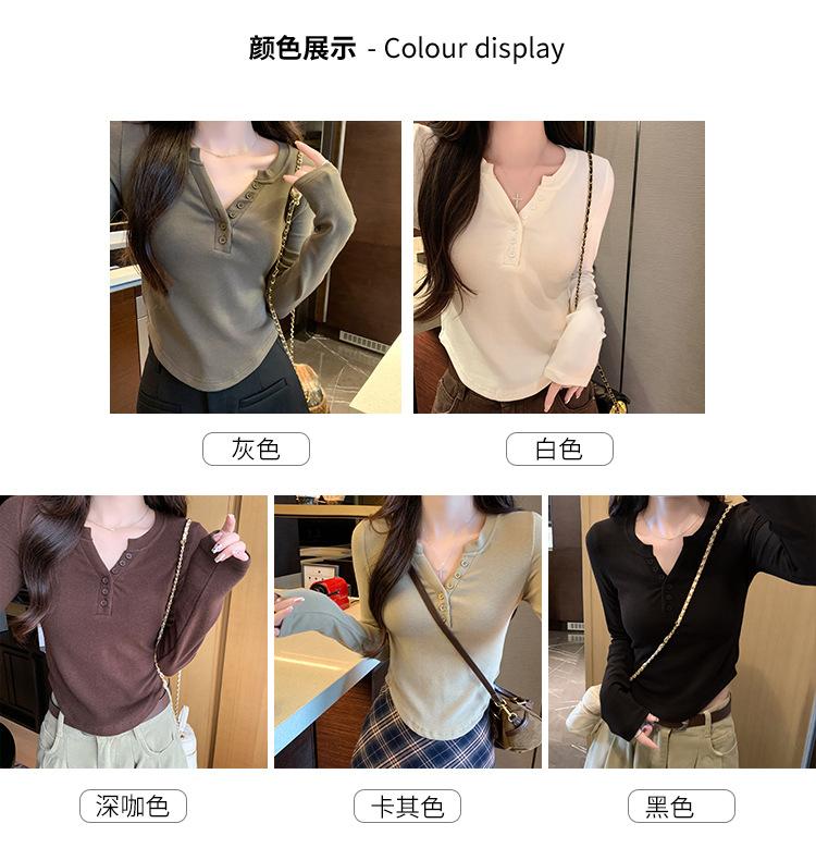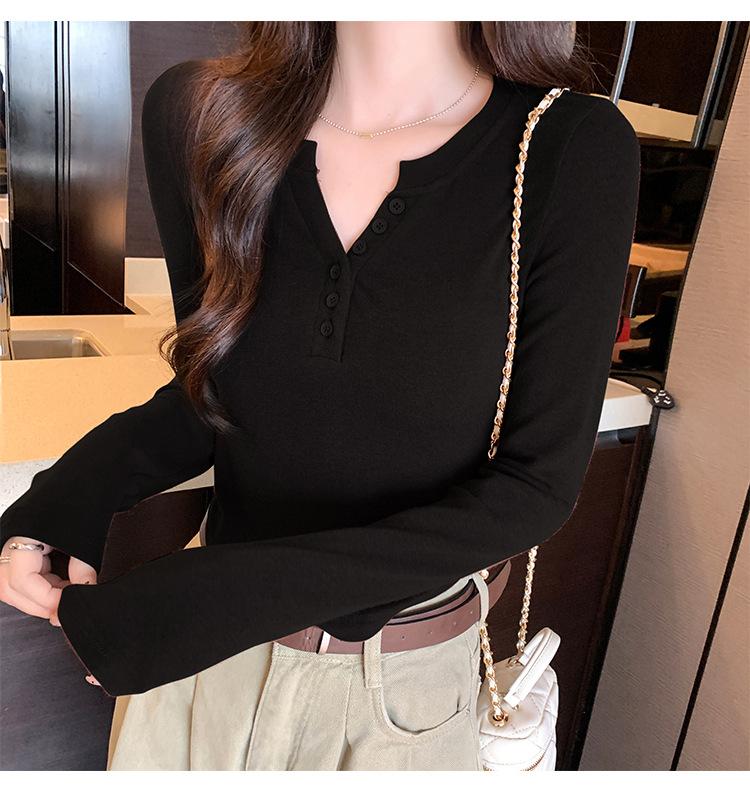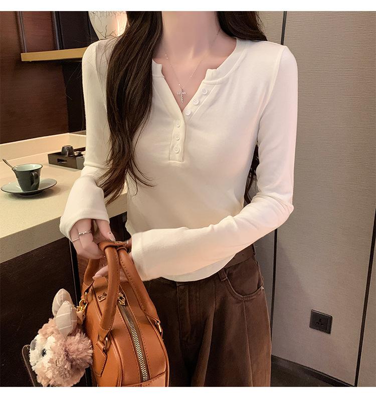 Ropa Nueva de Otoño 2023 Principios de Otoño Camisa Básica de Color Puro con Botones Camiseta de Aspecto Adelgazante Top de Manga Larga Ropa Interior para Mujer Otoño e Invierno