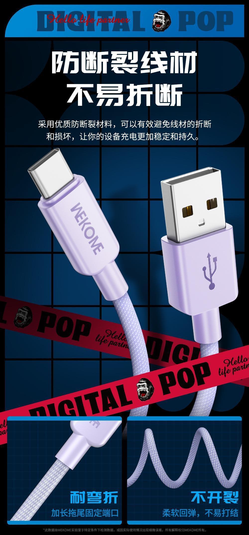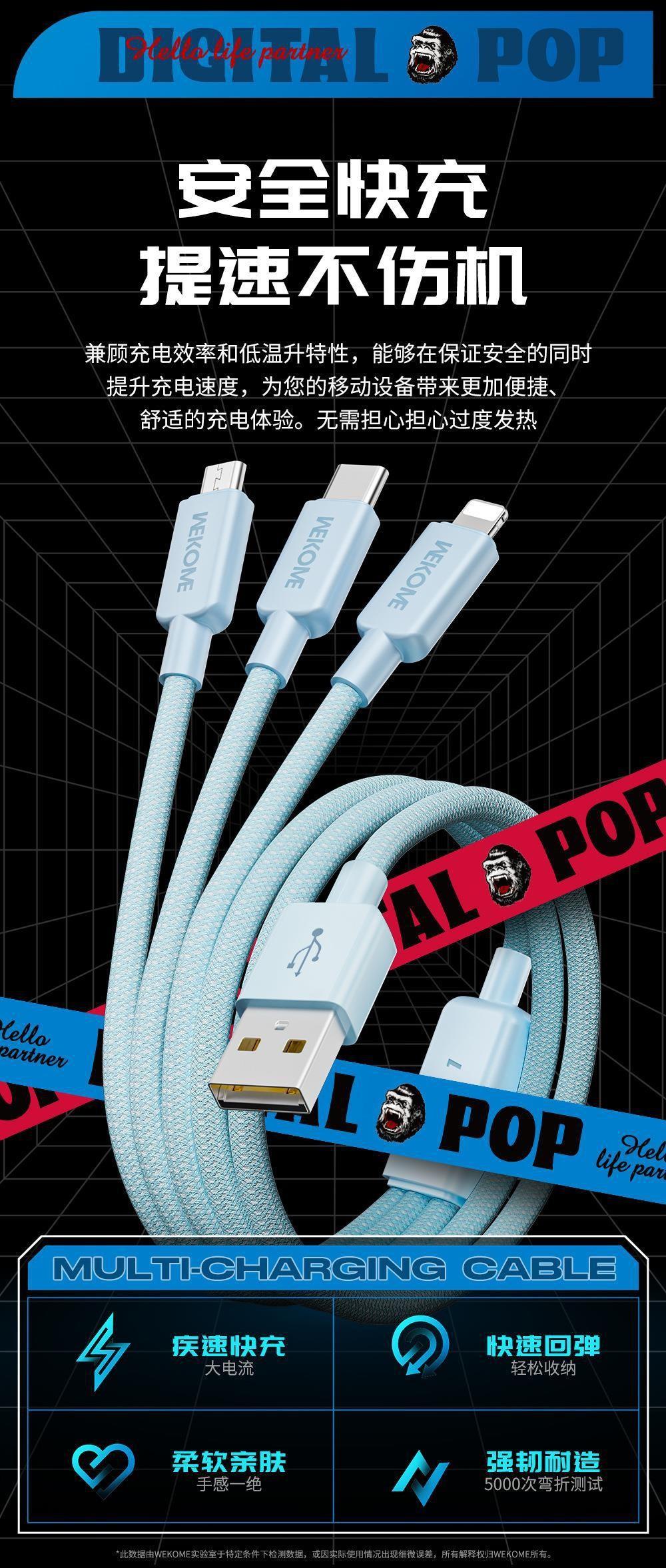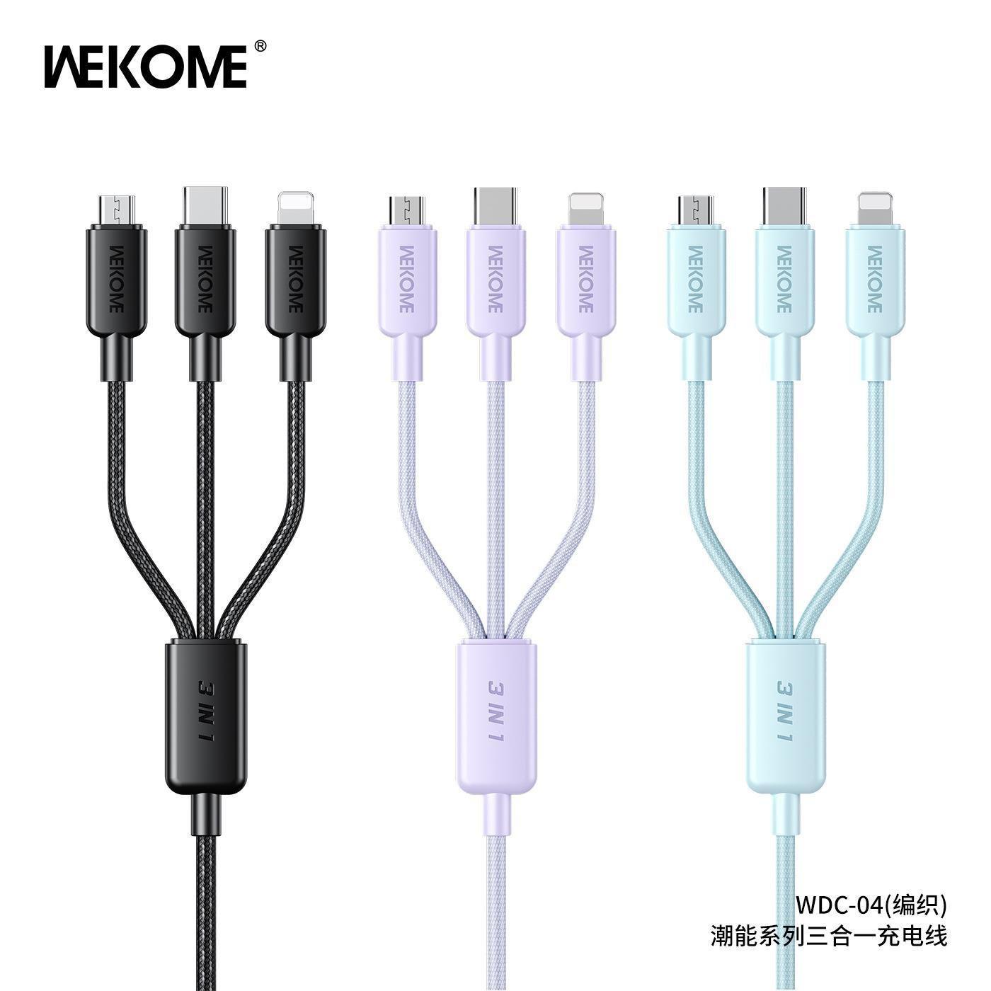 Cable de datos trenzado de nailon de la serie de moda WEKOME de 6 A de carga rápida, compatible con el cable de carga tres en uno Apple TYPE-C.