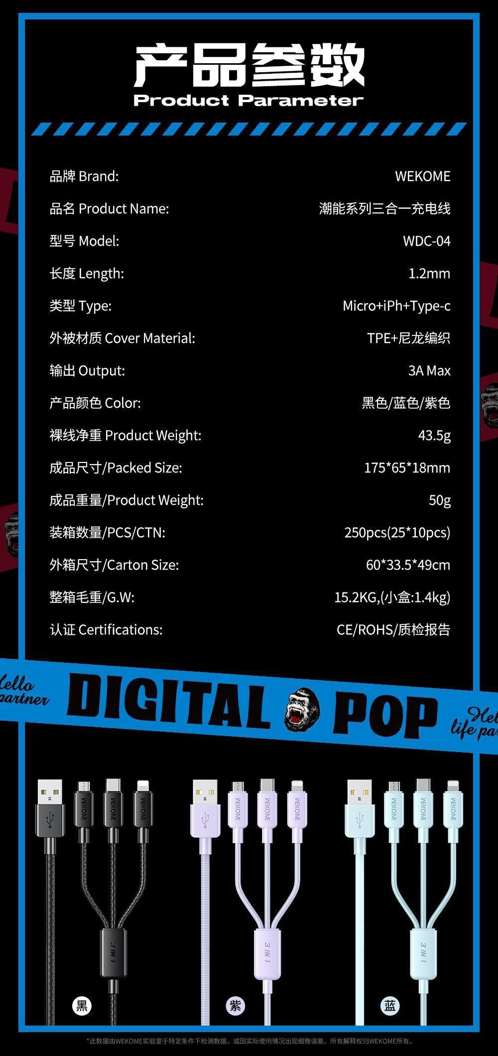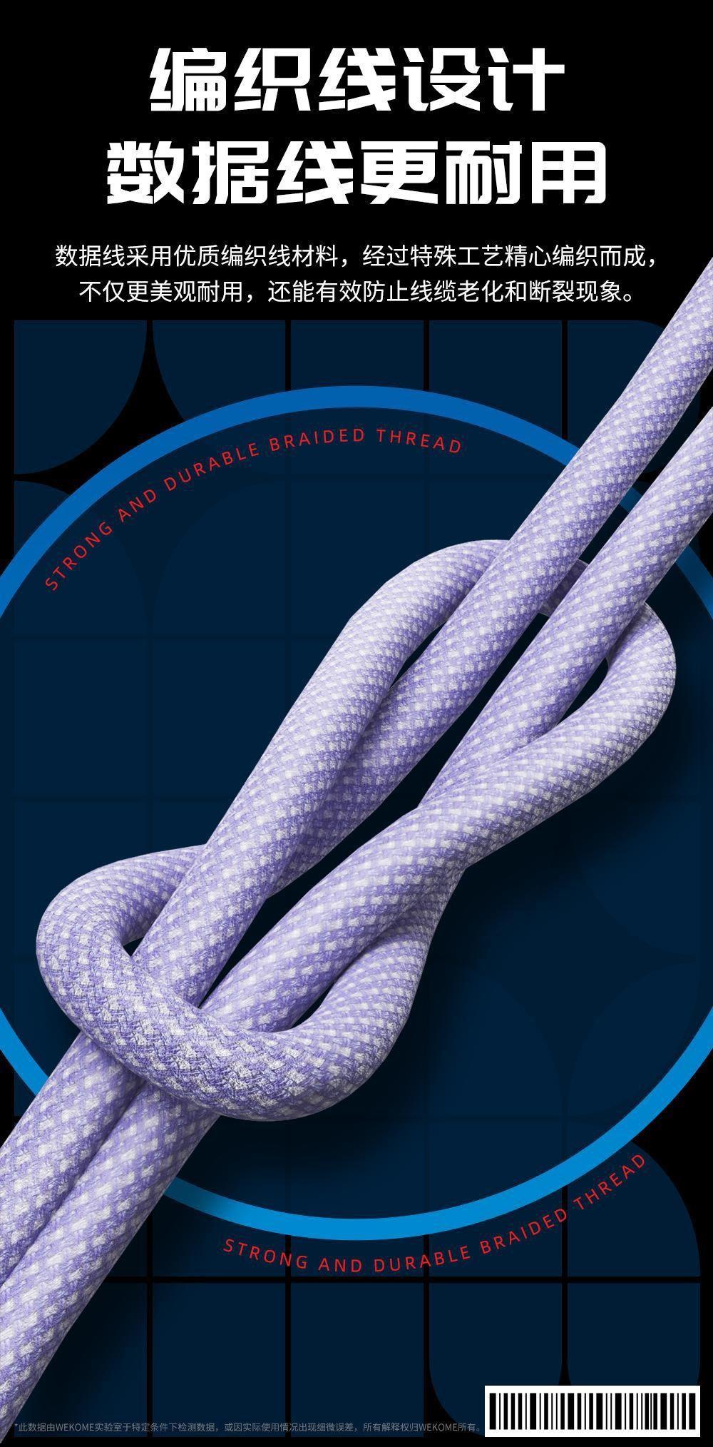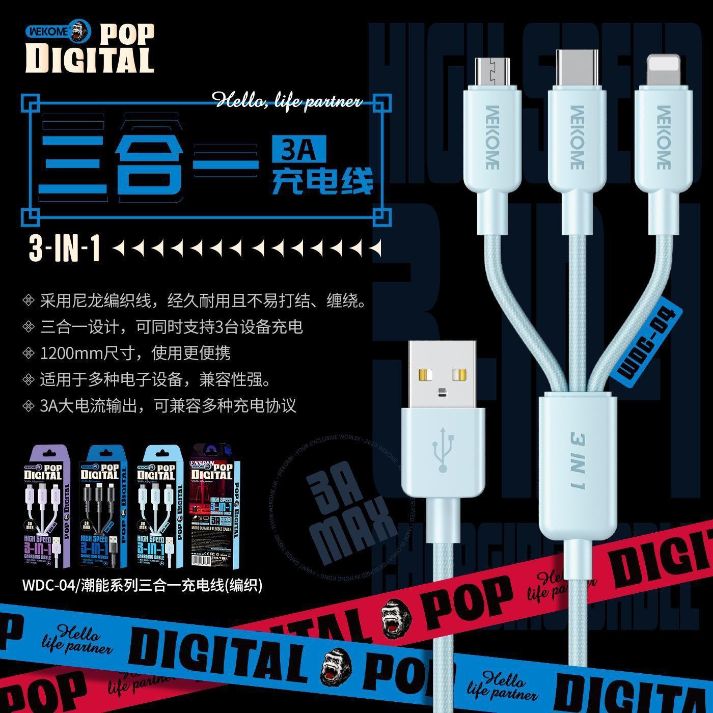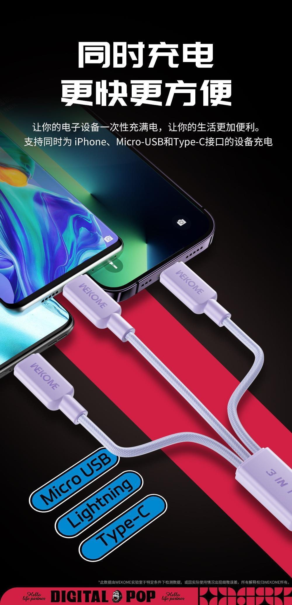 Compra Cable de datos trenzado de nailon de la serie de moda WEKOME de 6 A de carga rápida, compatible con el cable de carga tres en uno Apple TYPE-C. al por mayor en Joom.pro