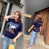 100% Algodón Peinado Moderno Azul y Blanco Porcelana Tops de Manga Corta para Mujer Verano Fresco Transpirable Suelto Talla Grande Combinación de Colores Camiseta para Mujer