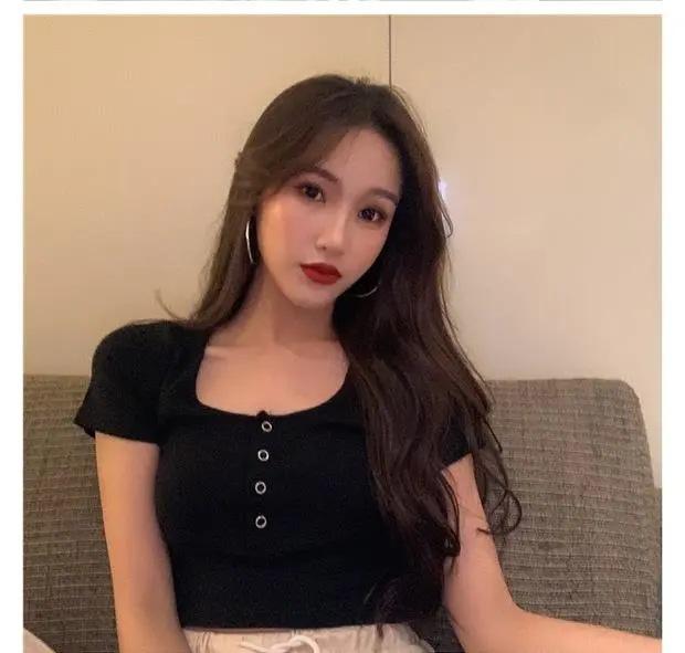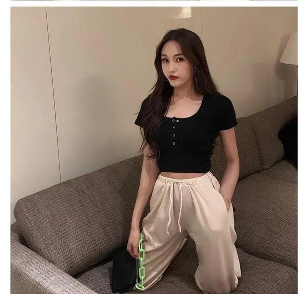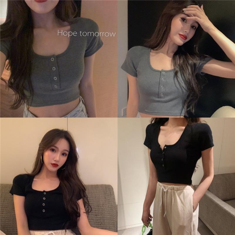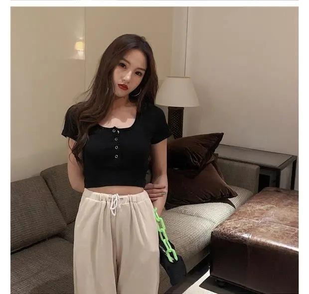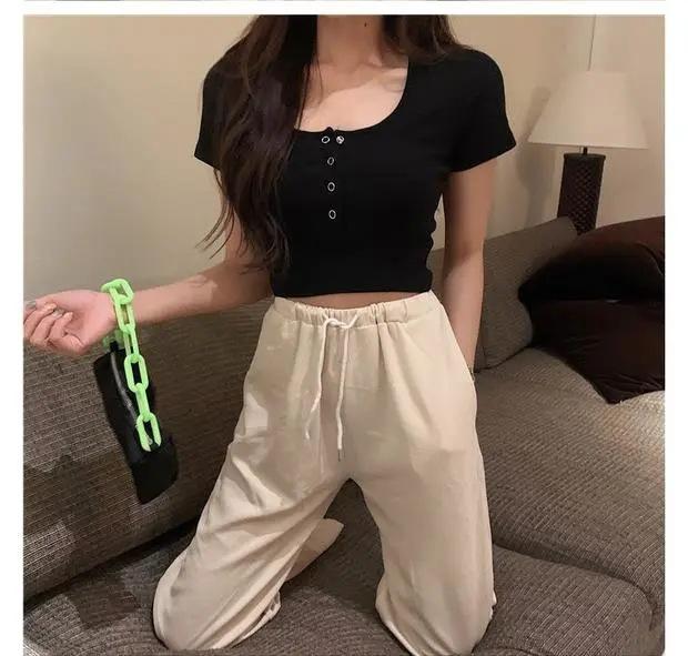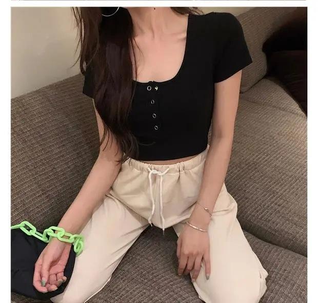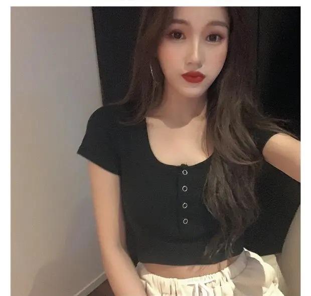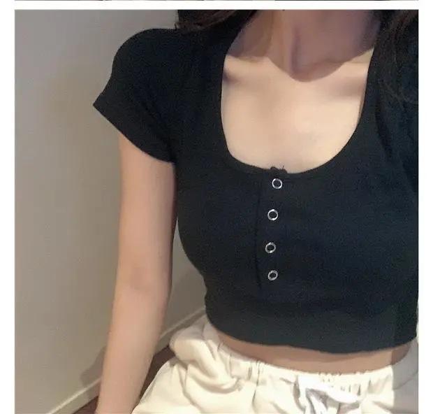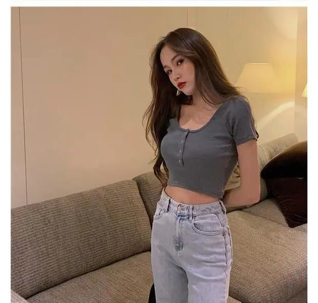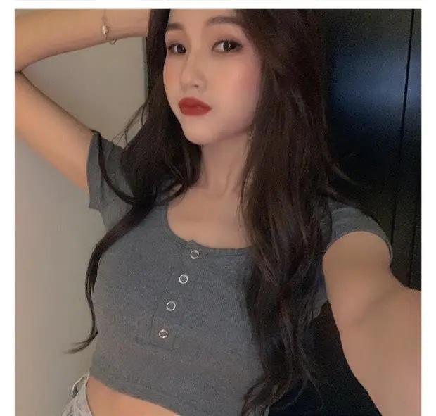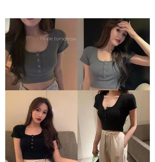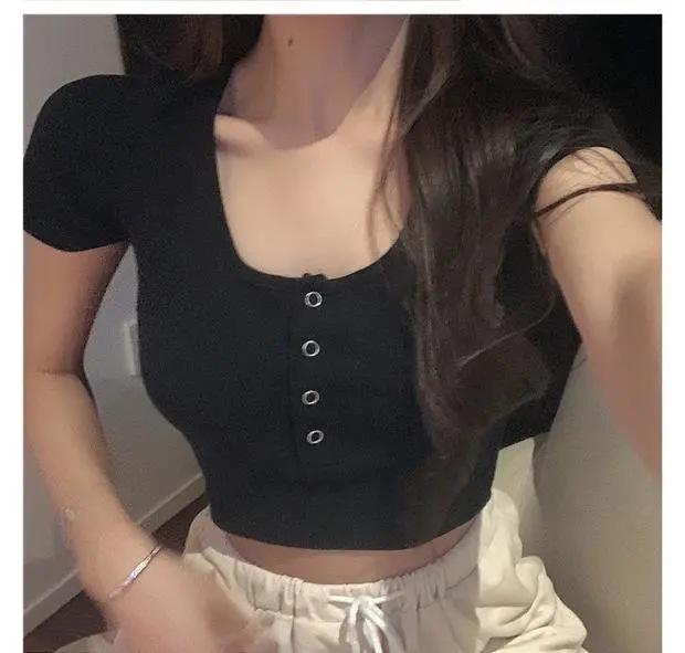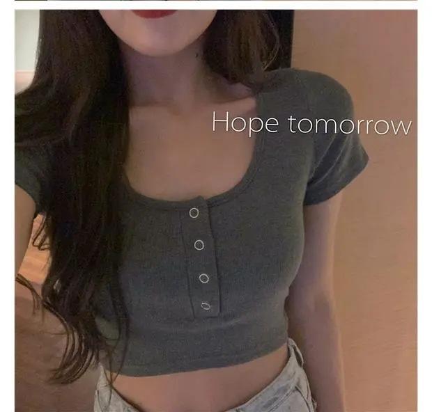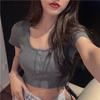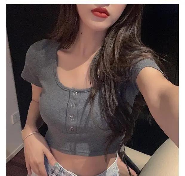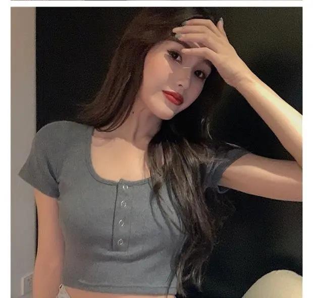Verano 2025 Nuevo Slim-Fit Corto Cuello Redondo Cintura Alta Adelgazante Elegante Camiseta de Manga Corta Crop para Mujer Top Tendencia