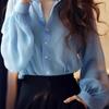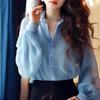Camisa de gasa azul de manga larga para mujer, estilo coreano, estilo Hong Kong, elegante y de estilo nicho de primavera.