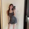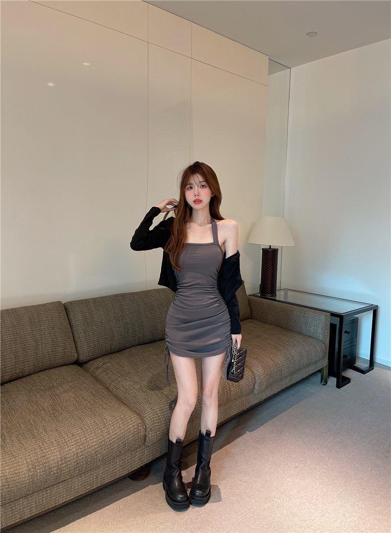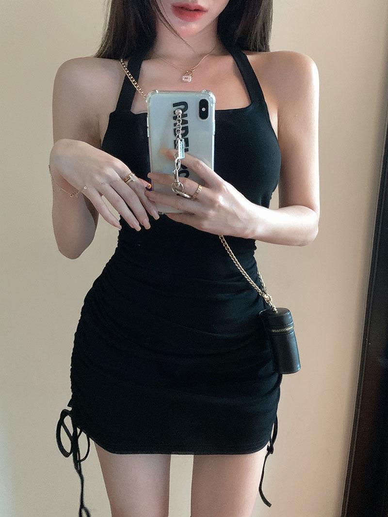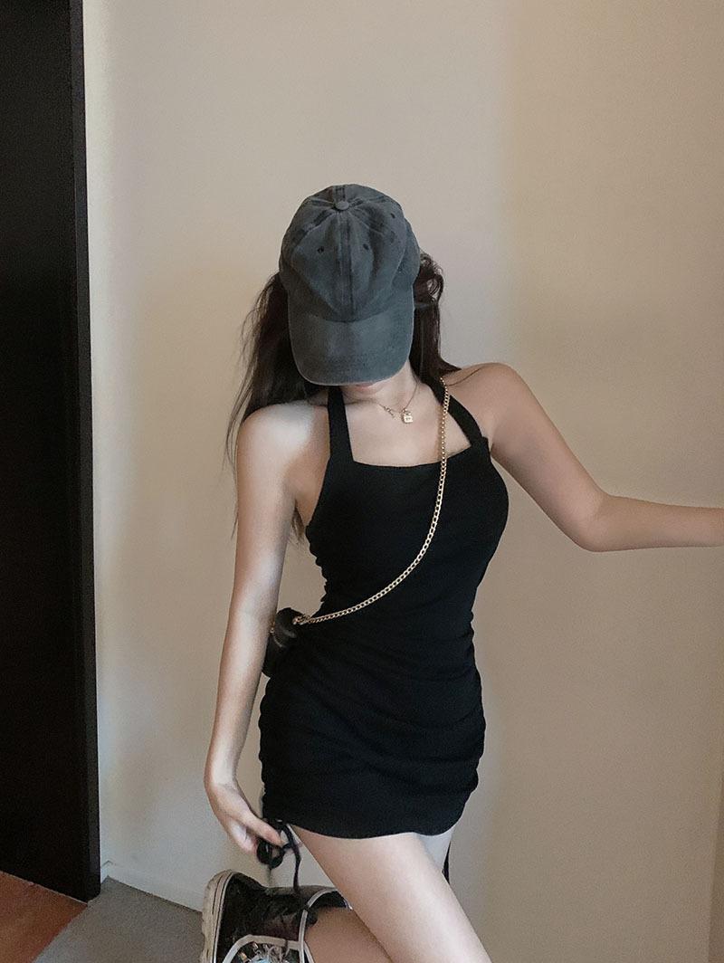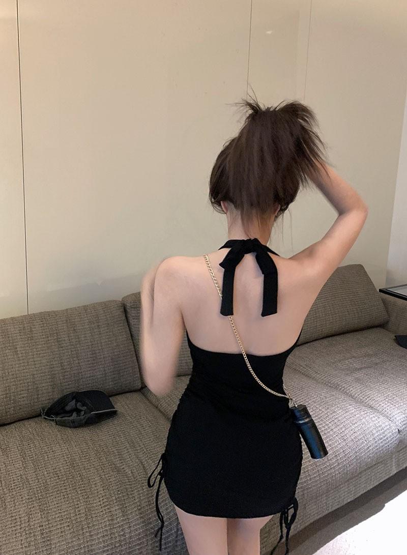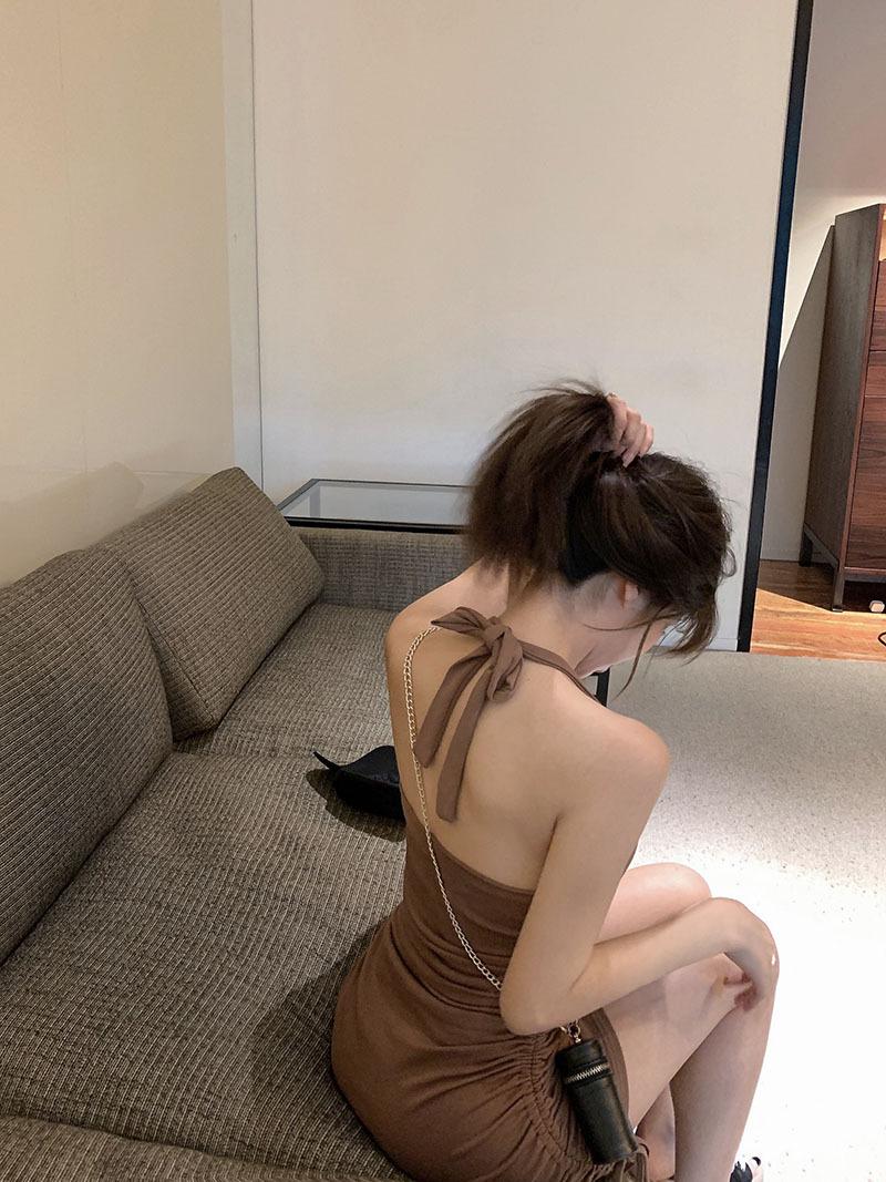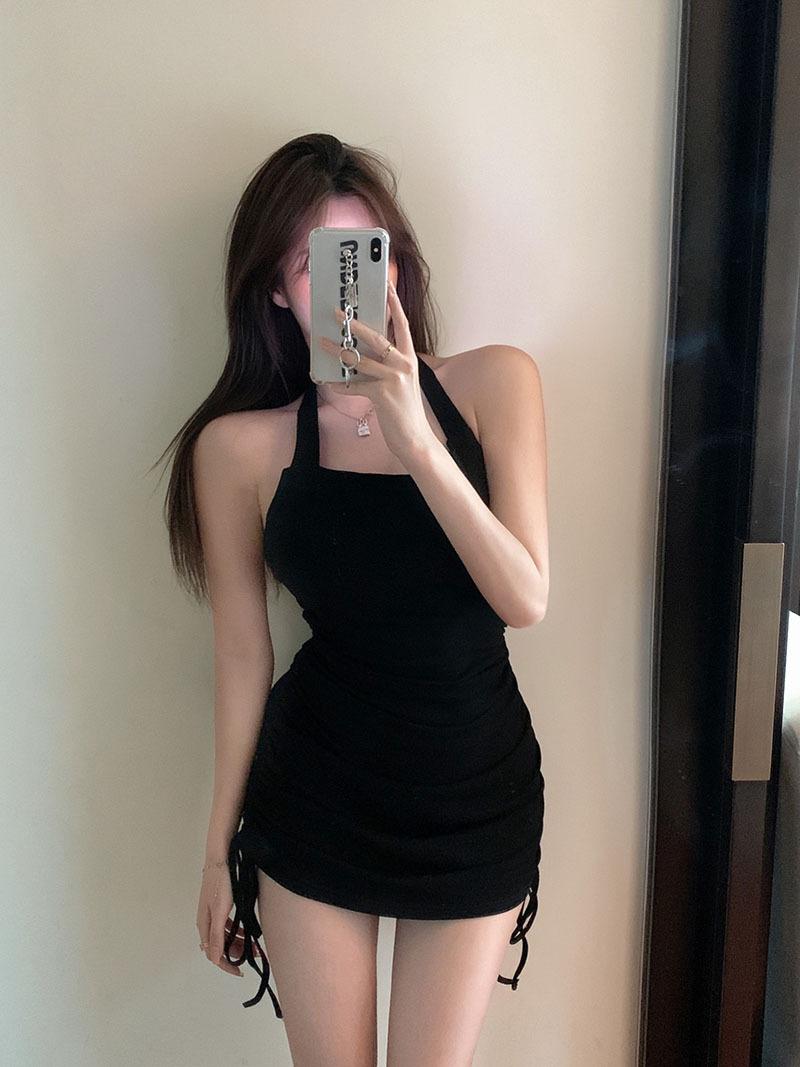 Verano nuevo color puro simple celebridad de internet estilo deseo puro delgado con cordón halter sexy adelgazante vestido de vaina