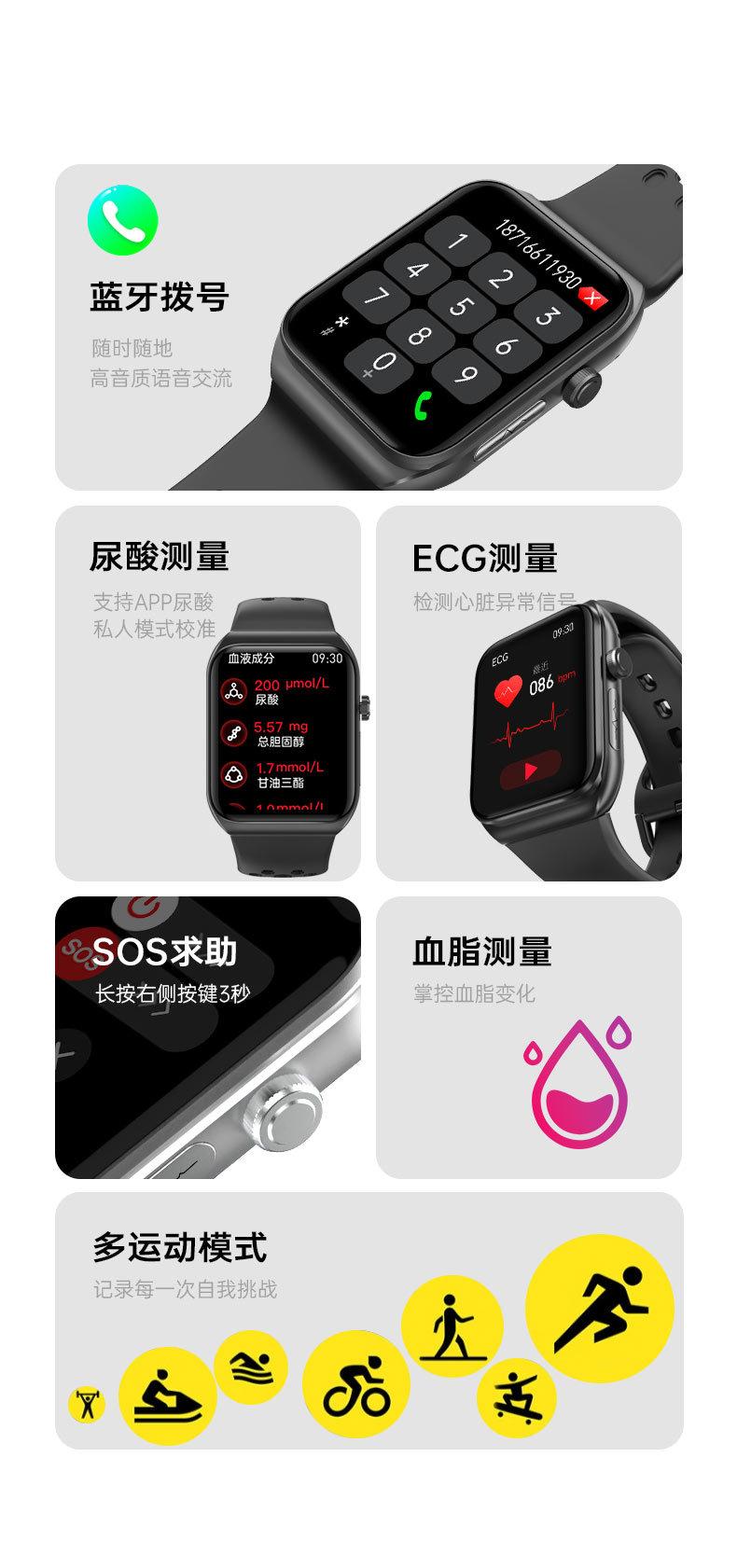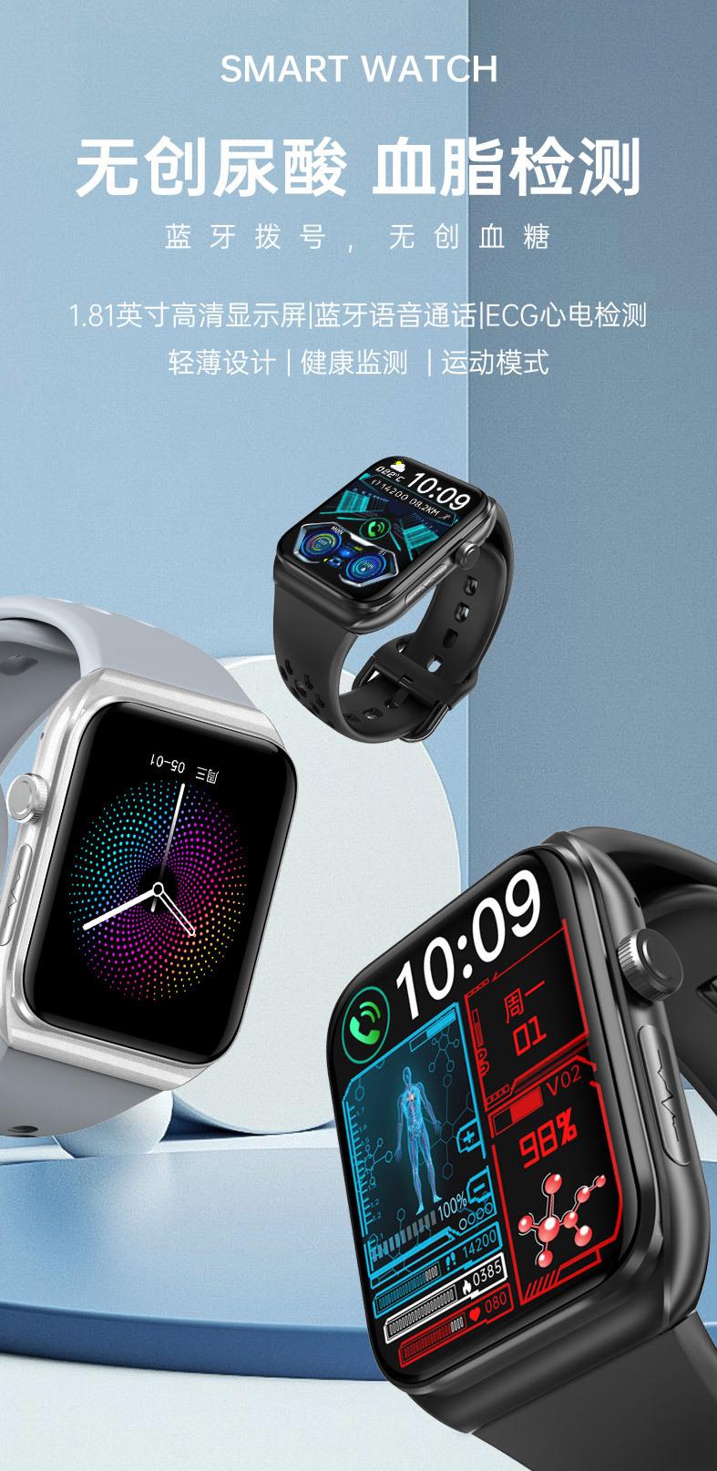 BK01 reloj inteligente llamada Bluetooth glucosa en sangre lípidos en sangre monitoreo de radiación frecuencia cardíaca oxígeno en sangre salud podómetro pulsera deportiva