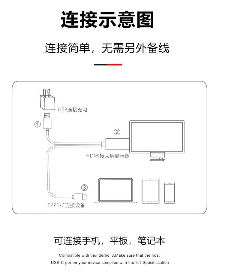 2. De acuerdo con los estándares USB3.1 y HDMI 1.4, la tasa de transmisión de datos puede alcanzar USB 3.1 10Gbps, admitiendo señales de alta definición 4k2k 30hz