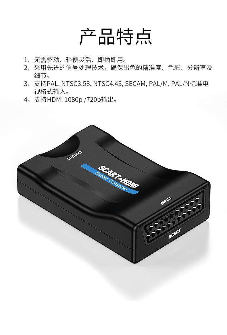 Este convertidor de Scart a HDMI convierte la señal analógica de entrada del Scart en una salida HDMI de 1080p (60 Hz). Solo puede reproducir dispositivos con interfaz SCART, como DVD y decodificadores, conectados a pantallas de alta definición. Su frecuencia de muestreo de hasta 10162 MSPS, que utiliza expansión de nivel de blanco/negro, transición de color mejorada, expansión de rango dinámico, procesamiento de blancos brillantes, detección automática y otras tecnologías, convierte automáticamente la señal compuesta a una salida de 1080p (60 Hz).