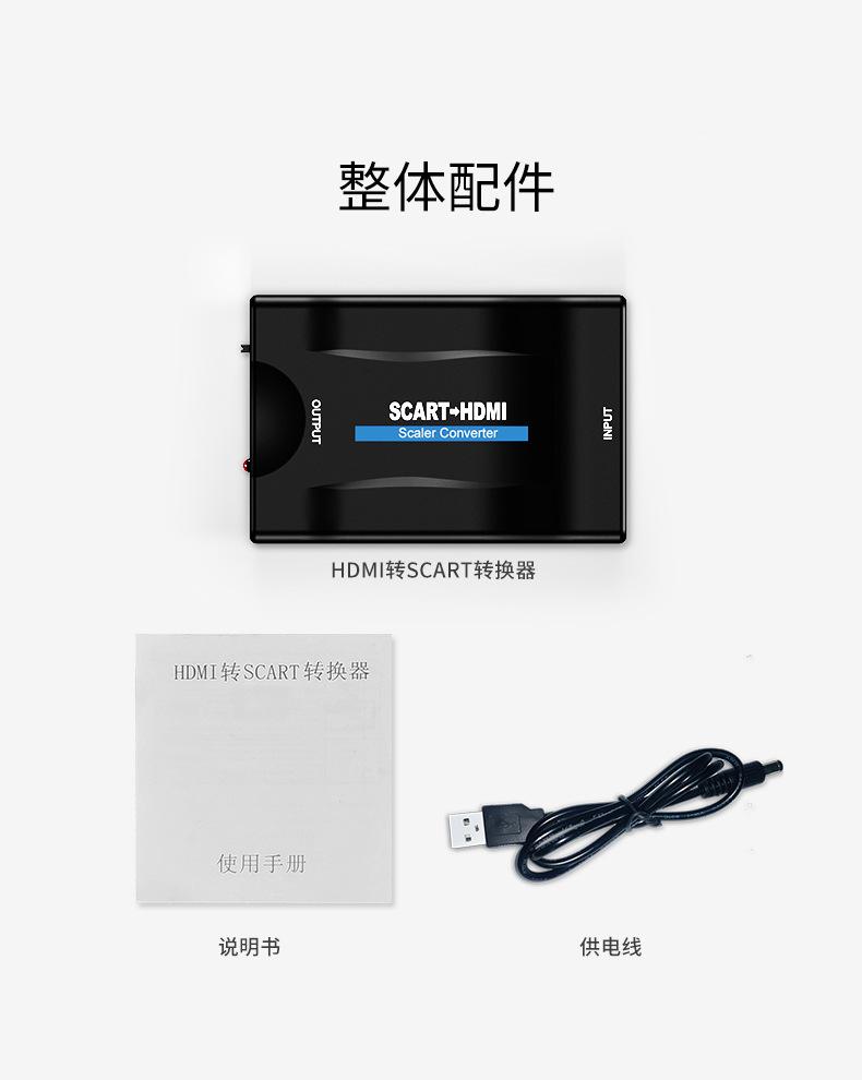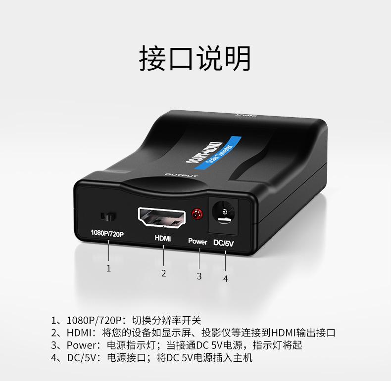 Este convertidor de euroconector a HDMI convierte la señal analógica de entrada por la interfaz euroconector a una salida HDMI de 1080p (60 Hz). Solo es compatible con dispositivos de reproducción con interfaz euroconector, como DVD y decodificadores, conectados a pantallas de alta definición. La frecuencia de muestreo de procesamiento analógico a digital es de hasta 10162 MSPS e incorpora expansión de nivel de blanco/negro, conversión de color mejorada, expansión de rango dinámico, procesamiento de blanco brillante, detección automática y otras tecnologías, que convierten automáticamente las señales compuestas a una salida de 1080p (60 Hz).