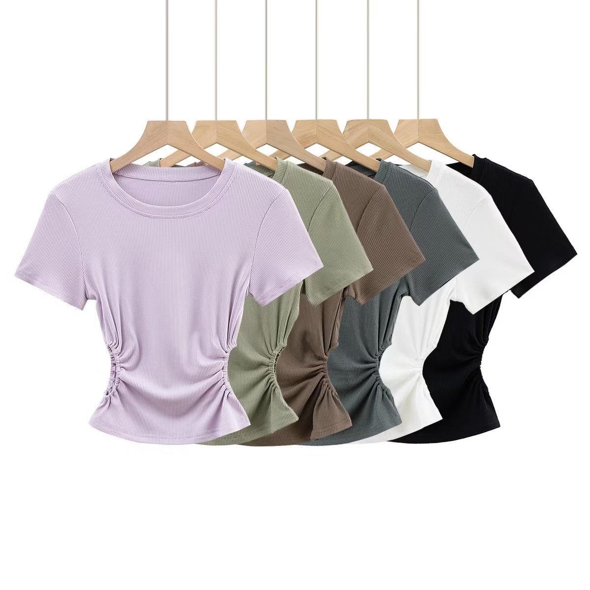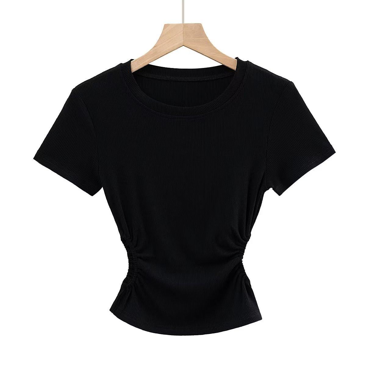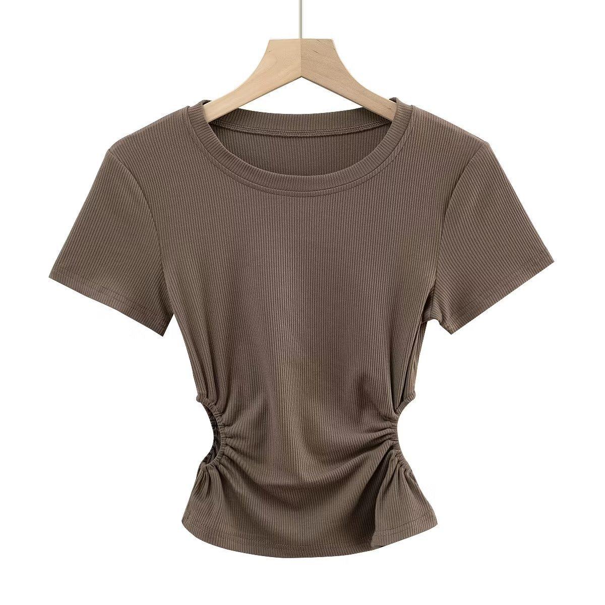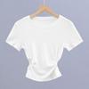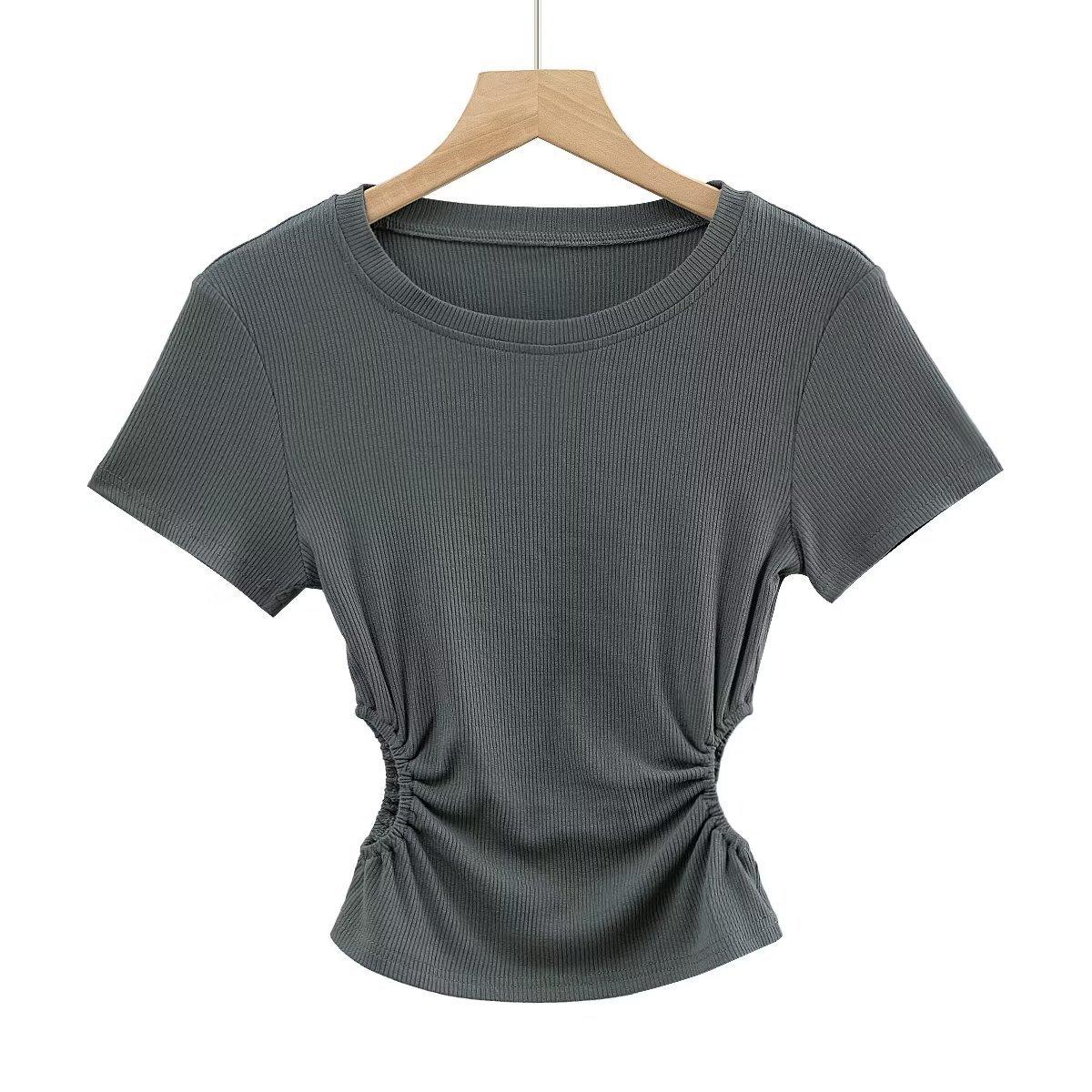 Camiseta de manga corta ajustada con cintura sexy de estilo europeo y americano para mujer, top corto adelgazante con cintura delgada, novedad de verano de 2023
