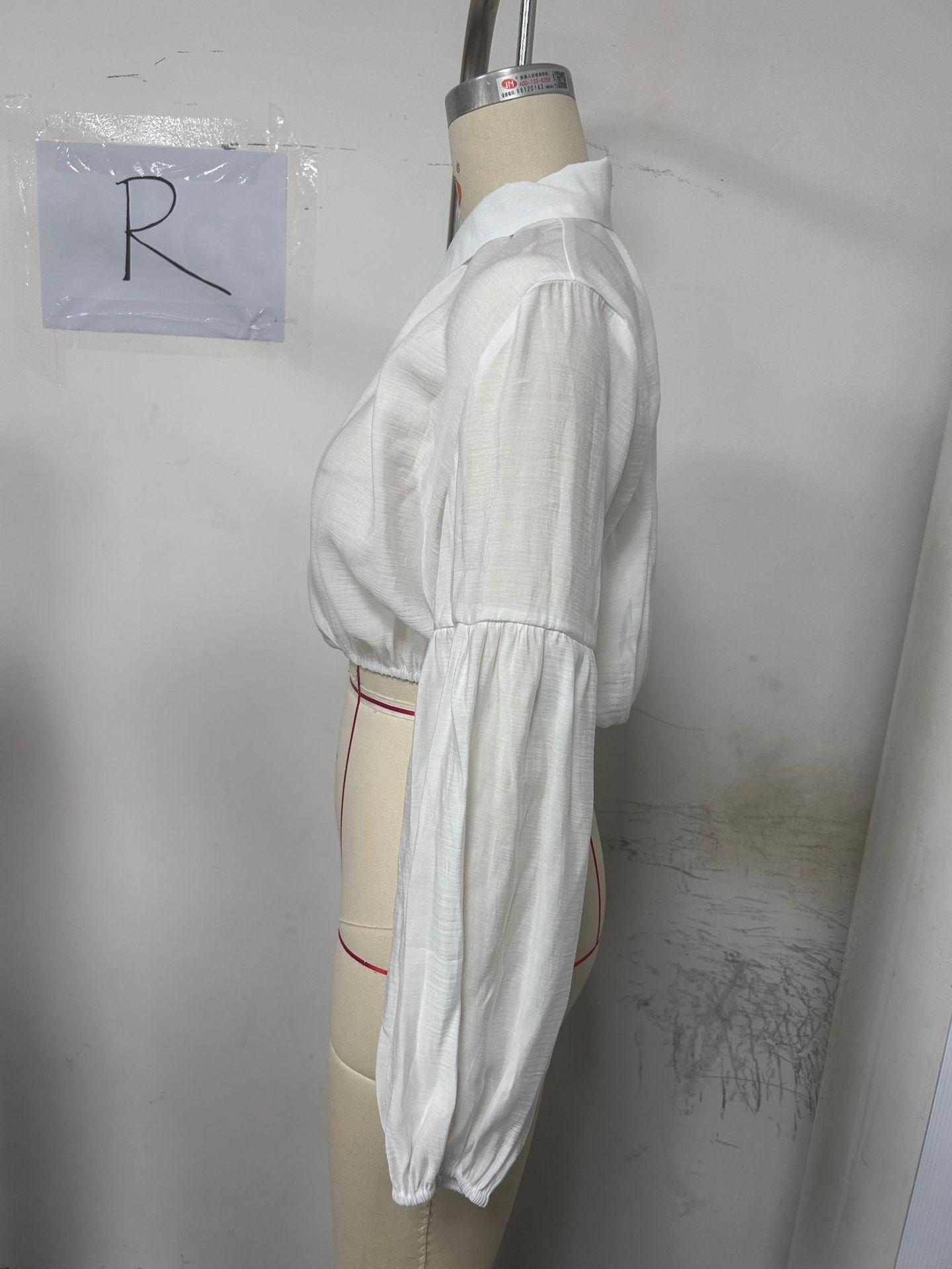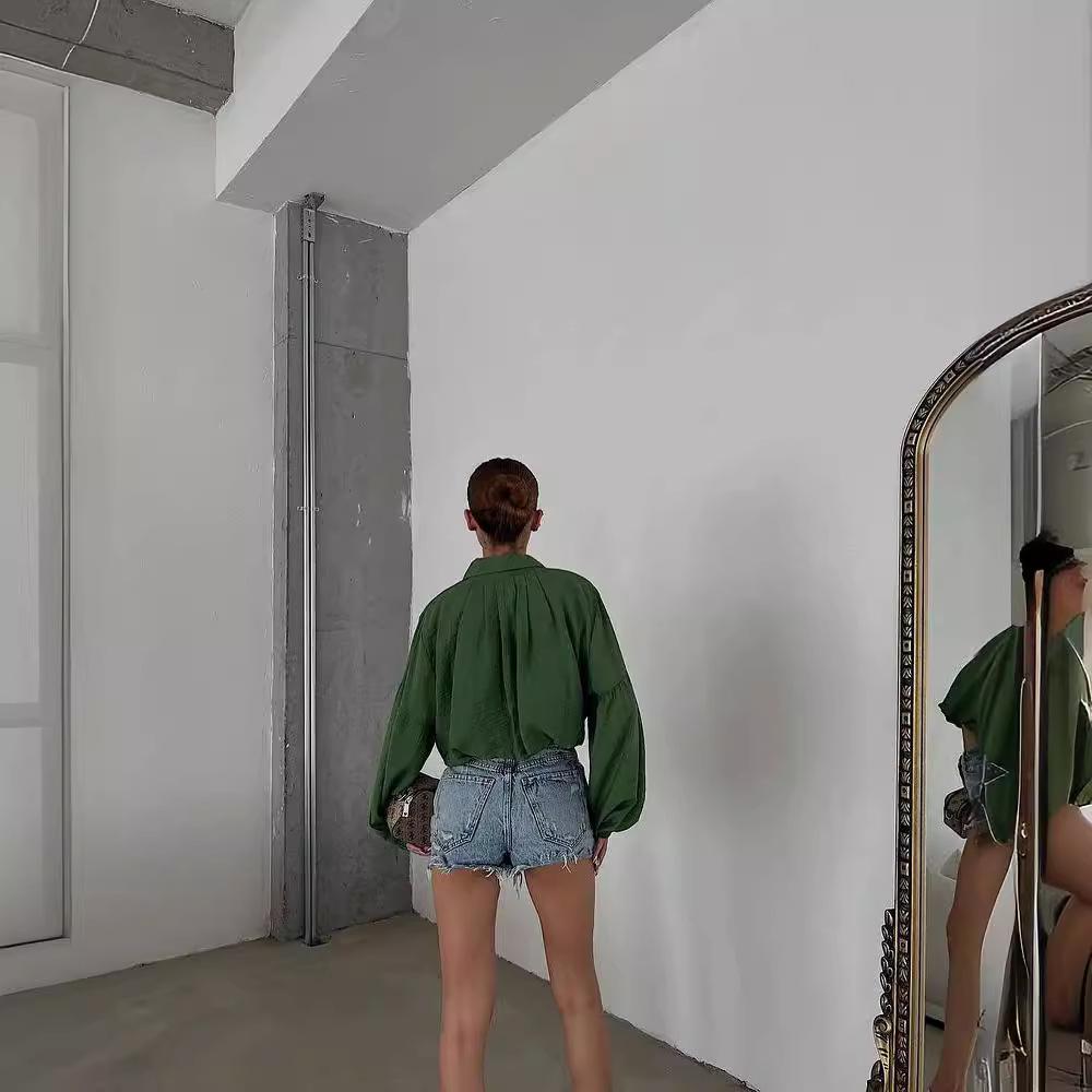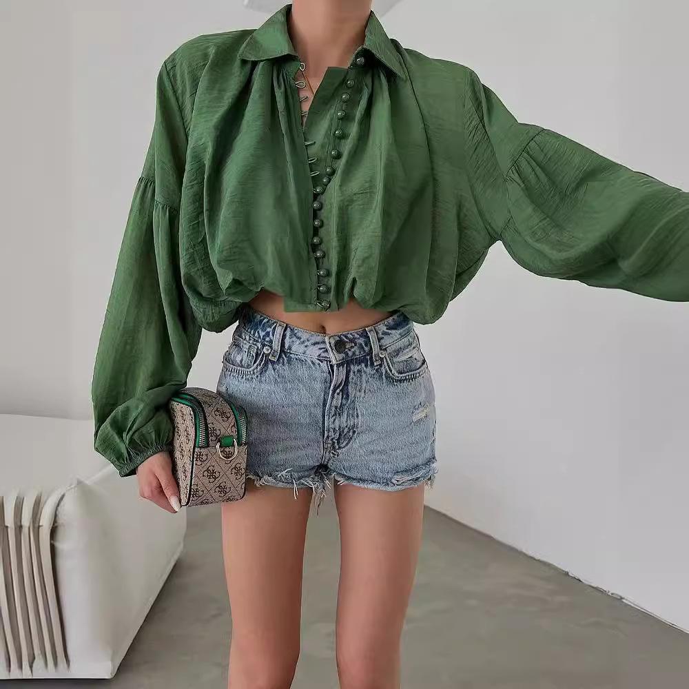 2024 Amazon Europeo y Americano Nicho Suelto Simple Corto Top de Mujer Solapa Manga Abullonada Camisa para Mujer