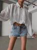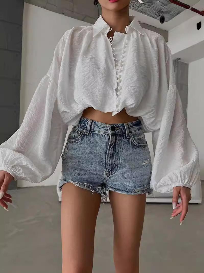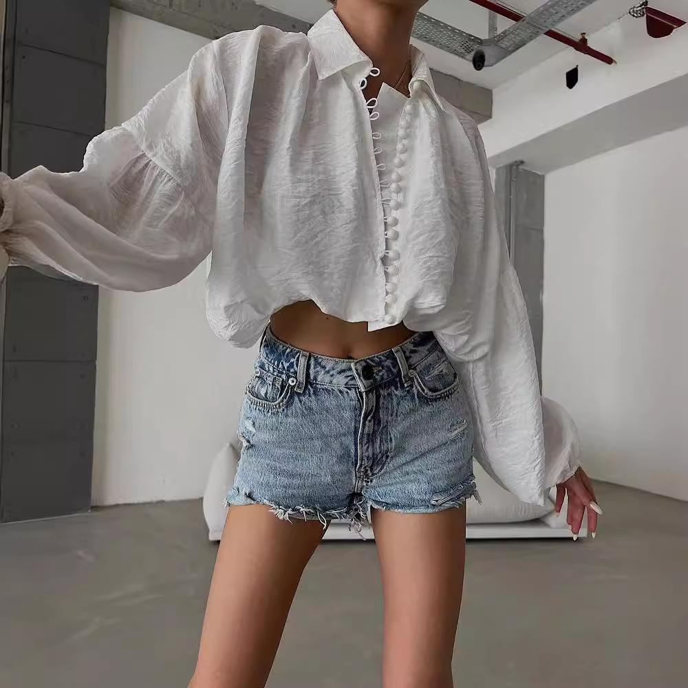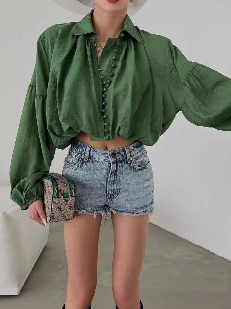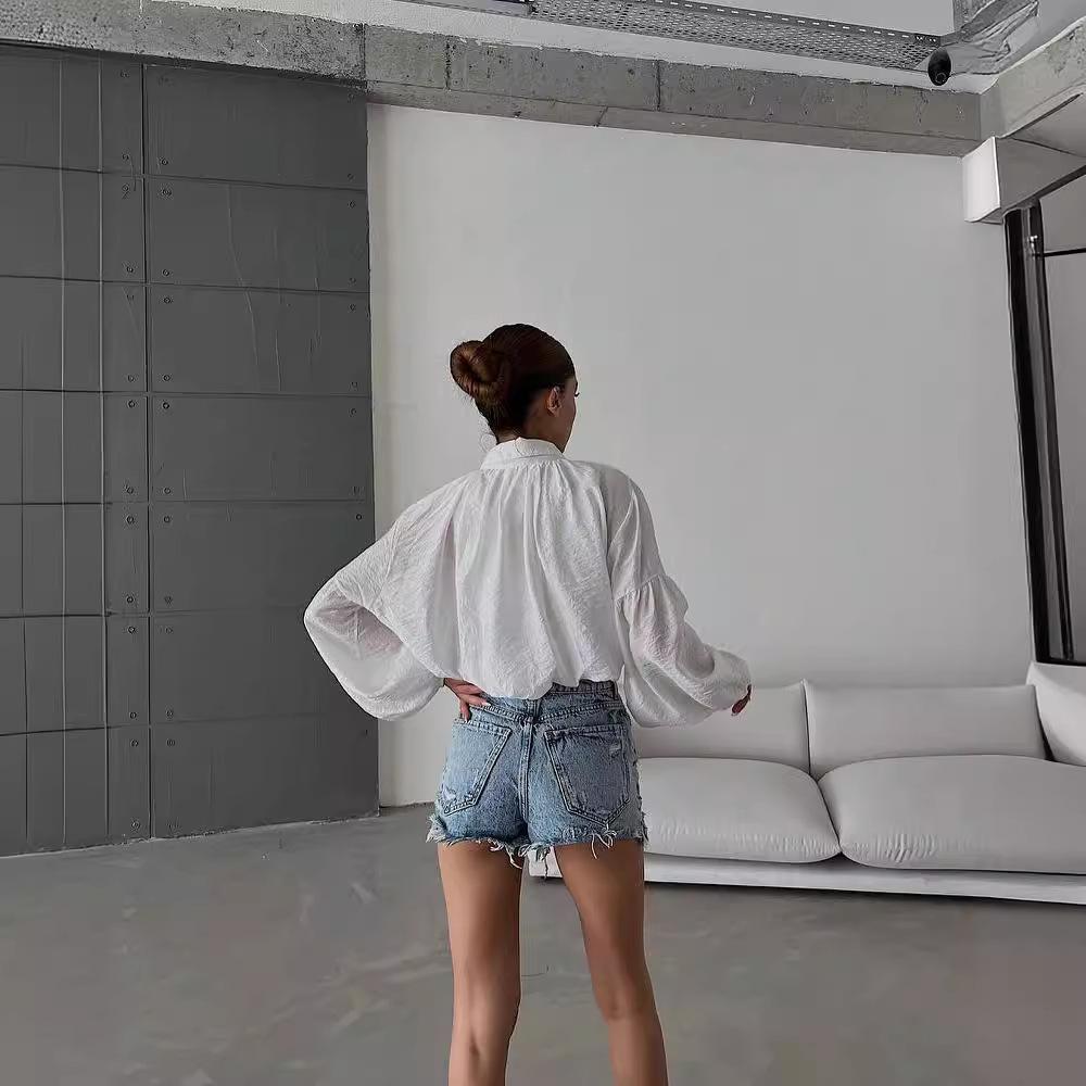 2024 Amazon Europeo y Americano Nicho Suelto Simple Corto Top de Mujer Solapa Manga Abullonada Camisa para Mujer