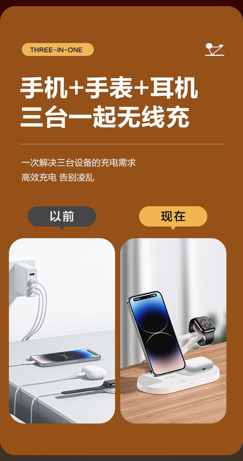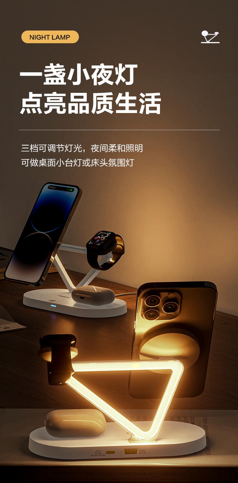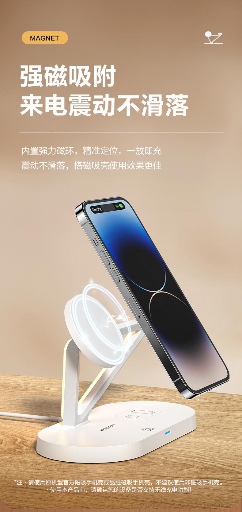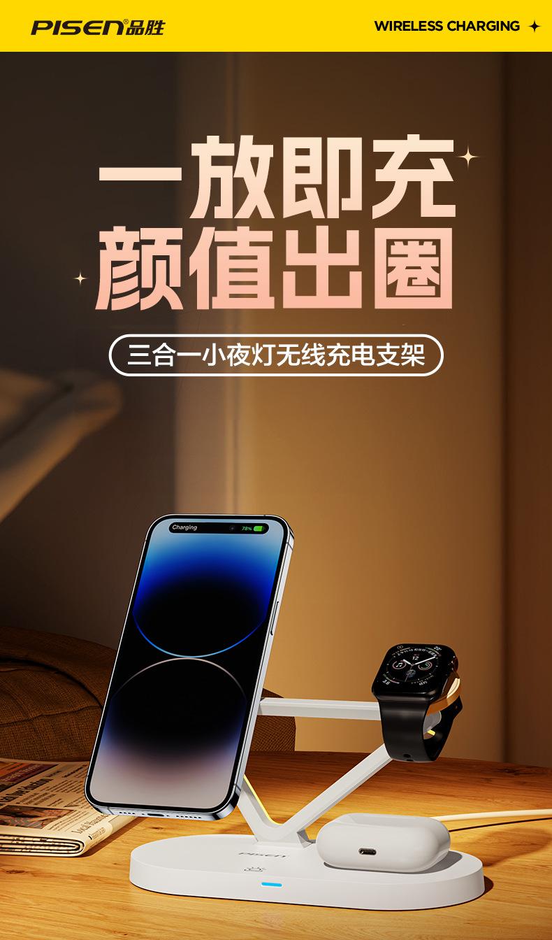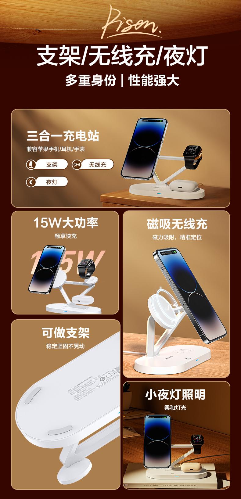 Cargador inalámbrico Pinsheng de 15 W, carga rápida magnética tres en uno para teléfono móvil Apple, reloj, auriculares, soporte de luz nocturna