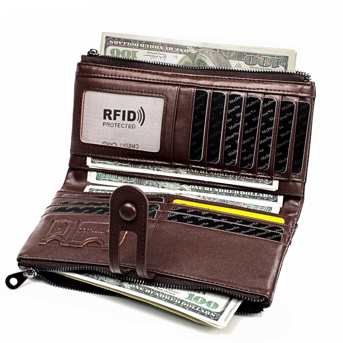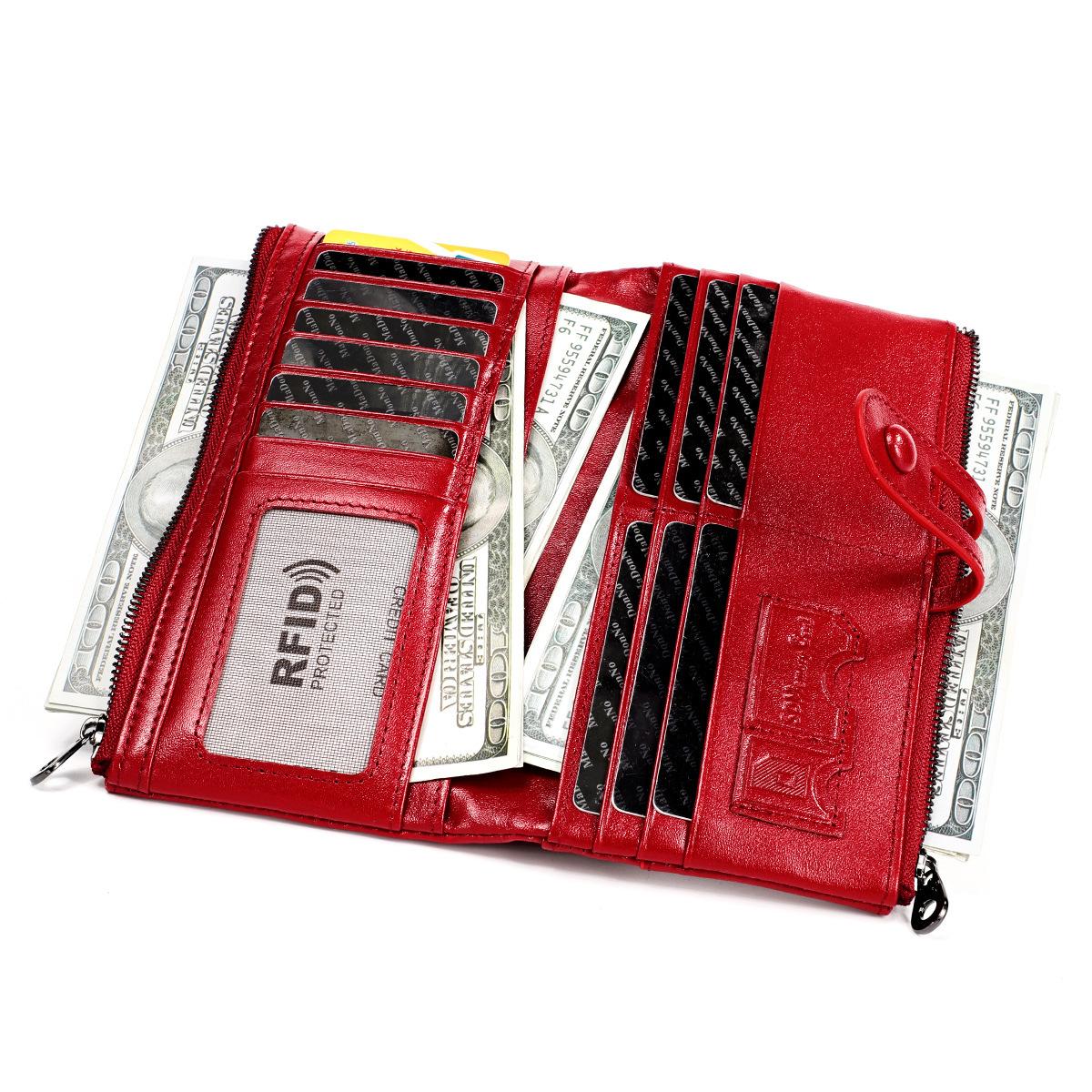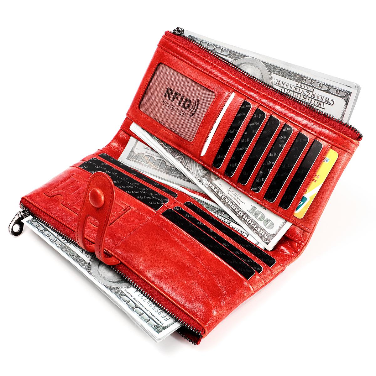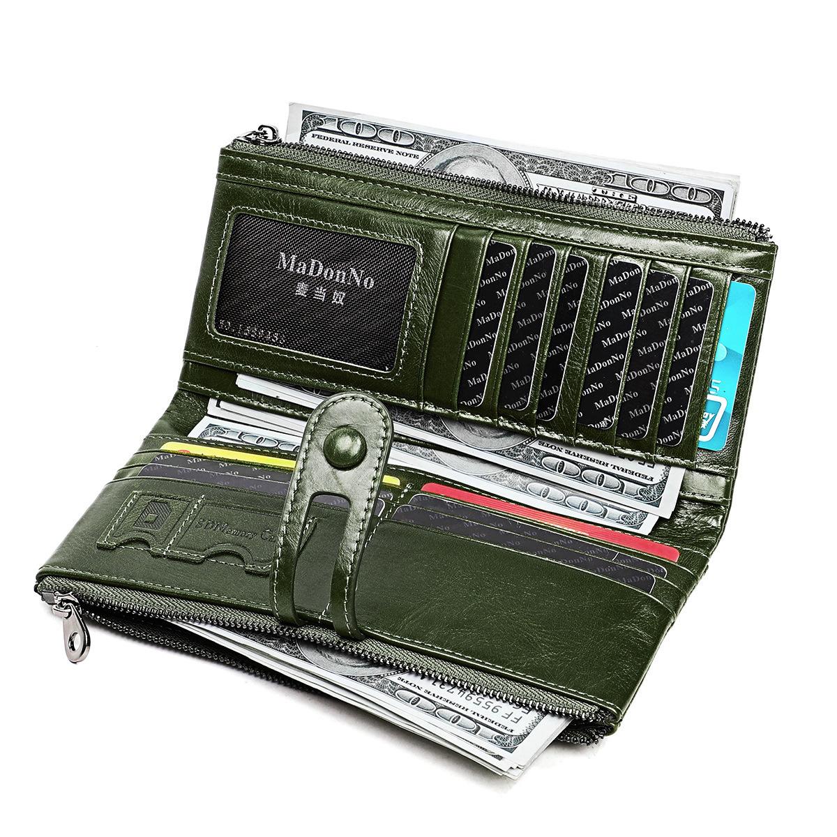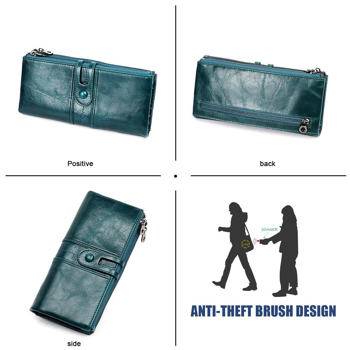 Cartera de mujer RFID de cuero encerado de origen transfronterizo, billetera de piel de vaca de primera capa, billetera triple, monedero largo multifunción¥51