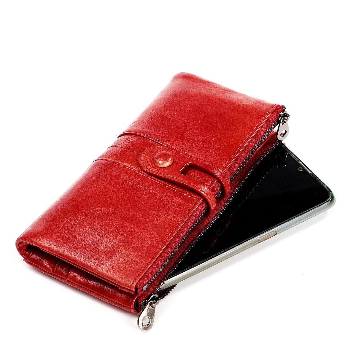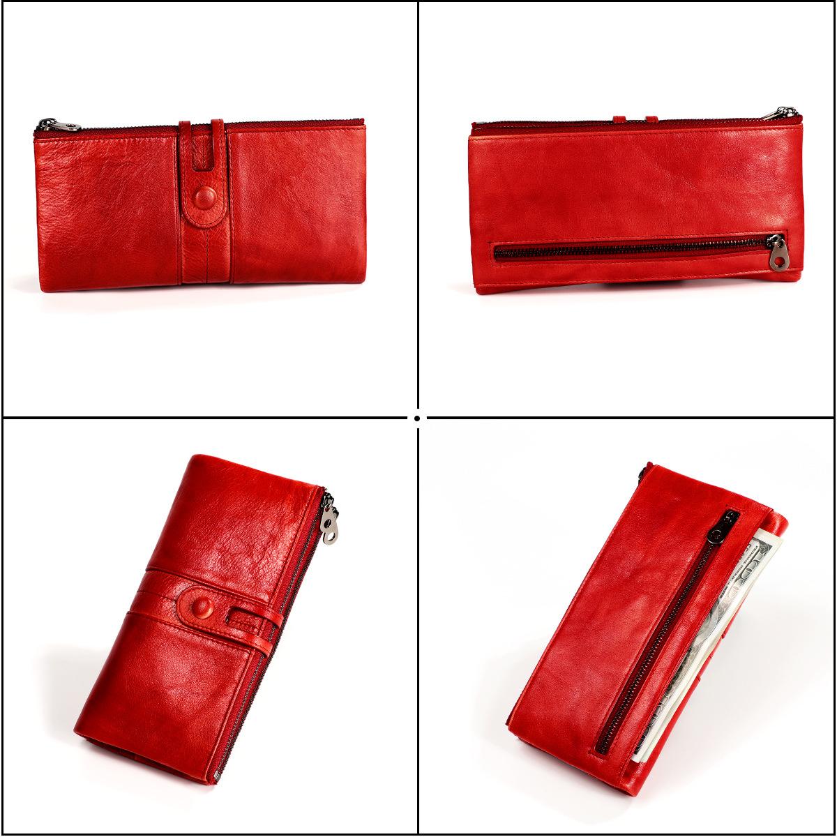 Cartera de cuero genuino transfronteriza 2019 nueva cartera larga de cuero encerado retro europeo y americano para damas bolso de mano multifunción¥65