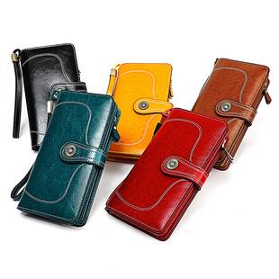 Cartera de cuero encerado de gran venta transfronteriza, billetera RFID de cuero genuino con cremallera larga para mujer, bolso de mano retro de gran capacidad¥65